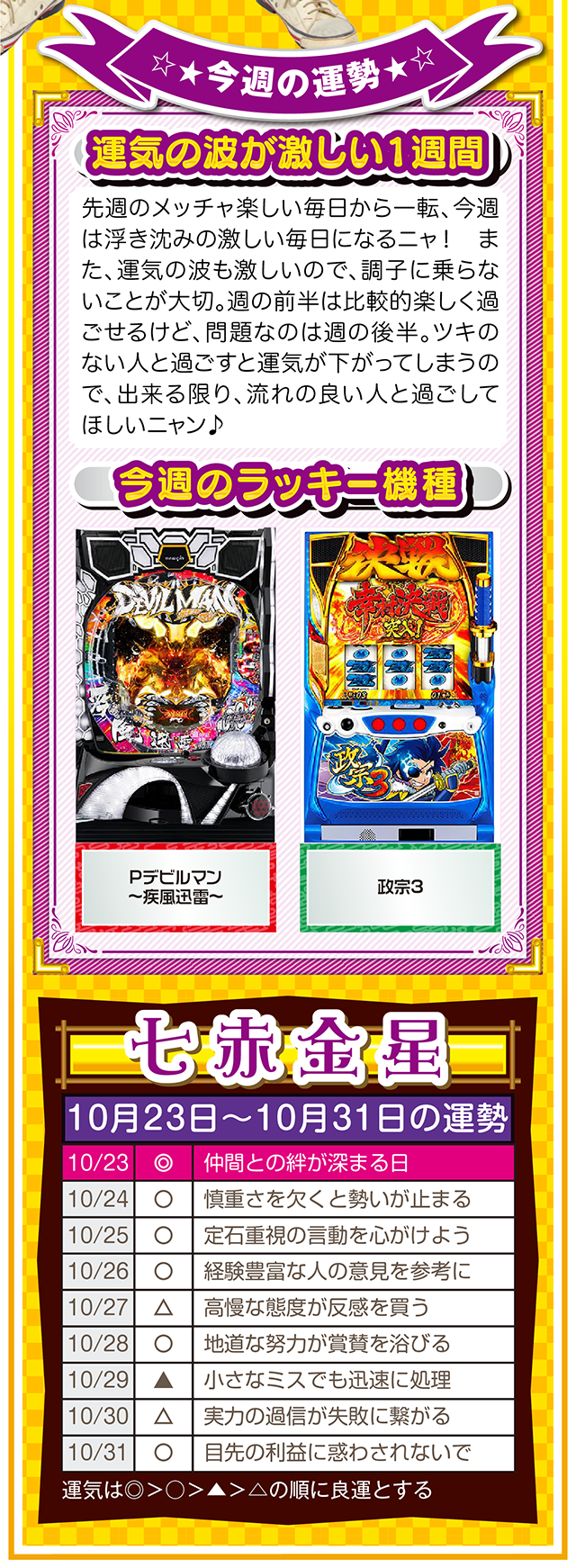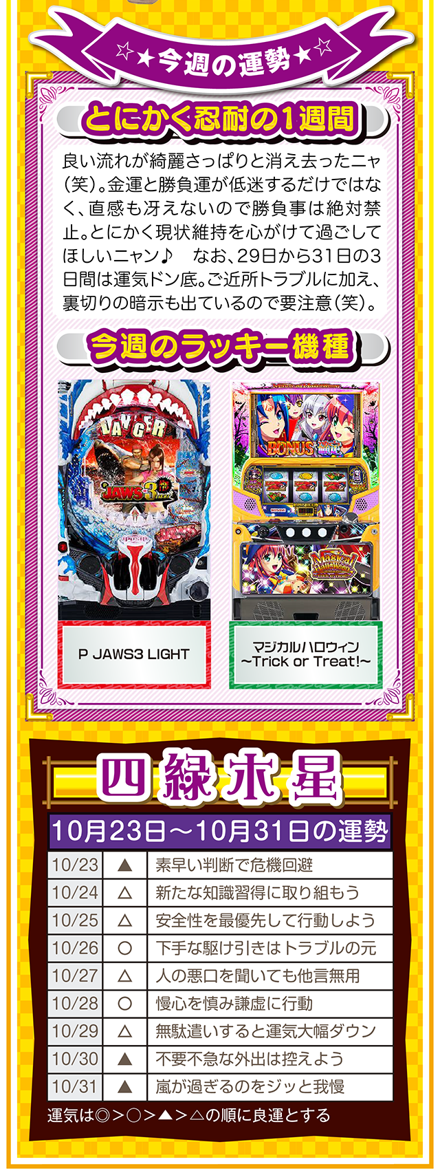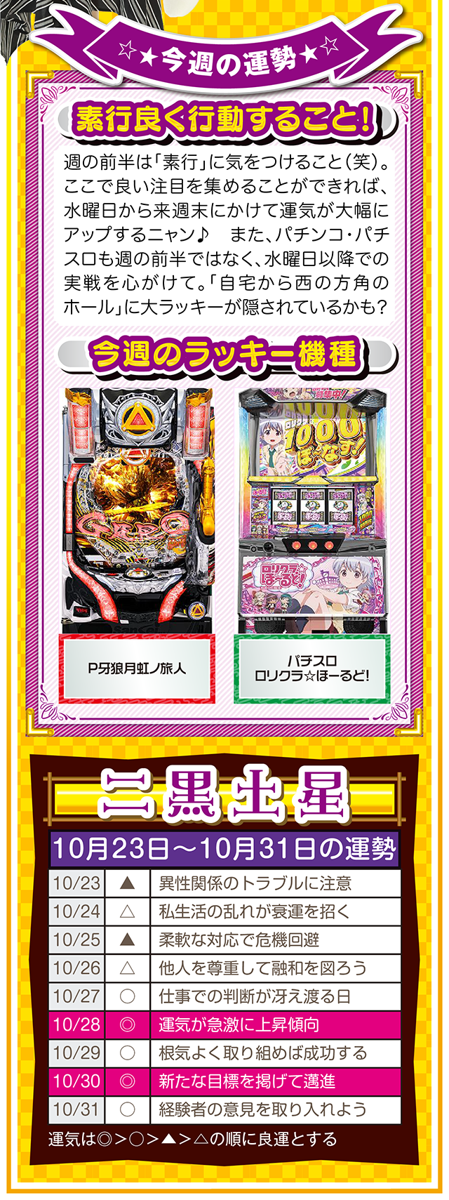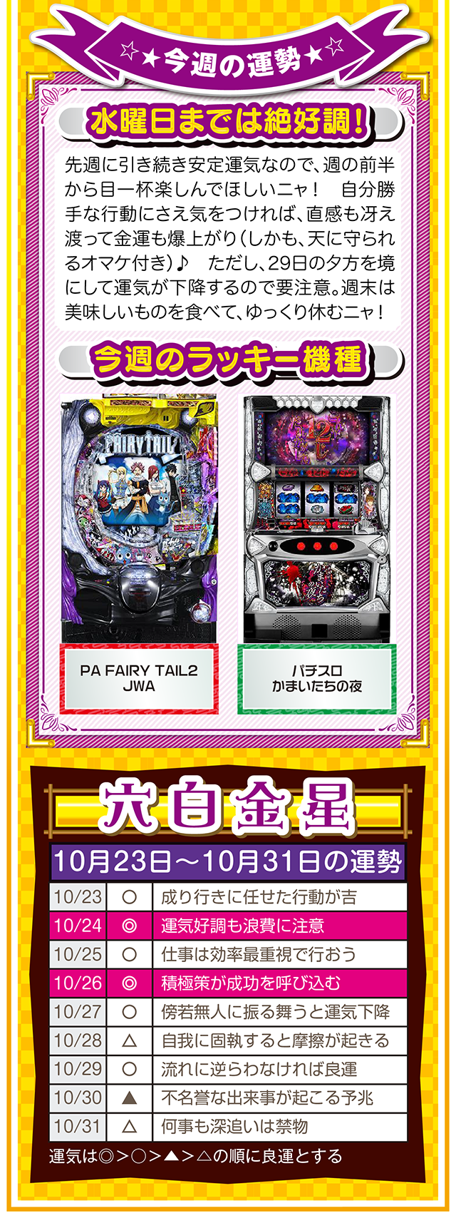 だから、1時間先でも1ヵ月先でも1年先でもいいから、想像と妄想を繰り返す。もし、あなたが不幸と思うのなら、1時間先の幸せを想像・妄想すること。この訓練が必ず、あなたを幸せに導いてくれるニャン♪ というわけで早速、10月25日から31日の1週間を鑑定ニャ(身の丈に合った想像を描けないザ・面食いのフォー・チュンチュン<独身>が、今週もオマケとして23日と24日の運勢も鑑定したニャン♡)!