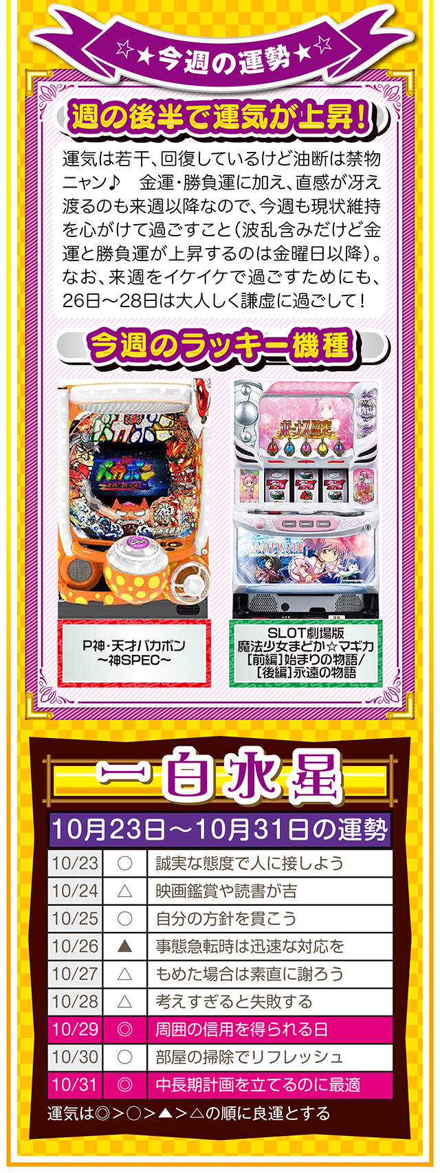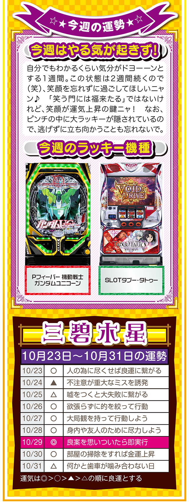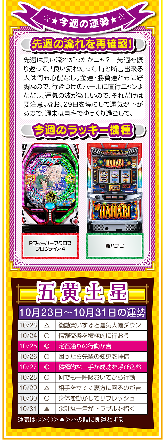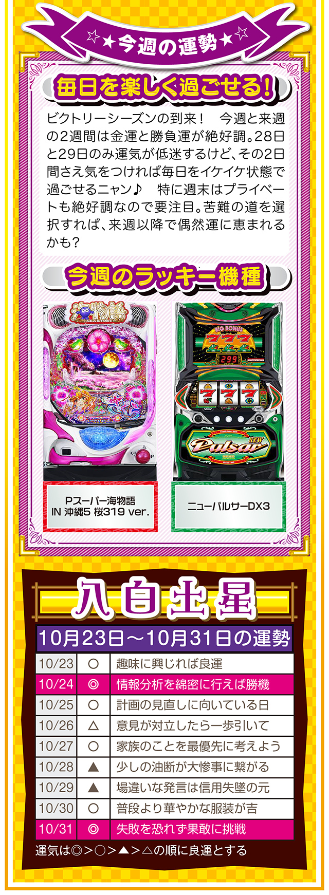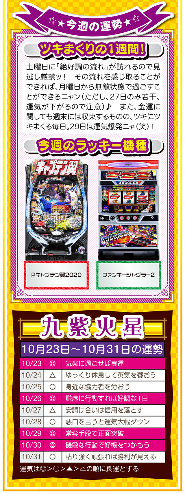 だから、1時間先でも1ヵ月先でも1年先でもいいから、想像と妄想を繰り返す。もし、あなたが不幸と思うのなら、1時間先の幸せを想像・妄想すること。この訓練が必ず、あなたを幸せに導いてくれるニャン♪ というわけで早速、10月25日から31日の1週間を鑑定ニャ(身の丈に合った想像を描けないザ・面食いのフォー・チュンチュン<独身>が、今週もオマケとして23日と24日の運勢も鑑定したニャン♡)!