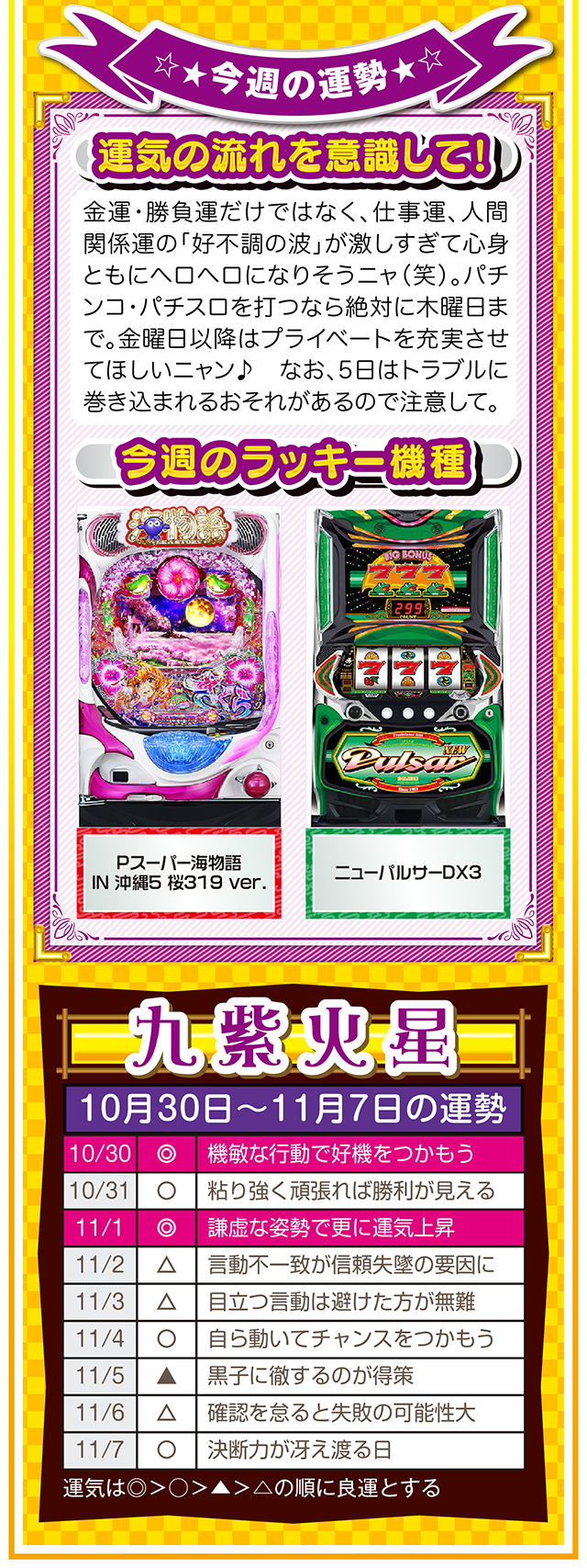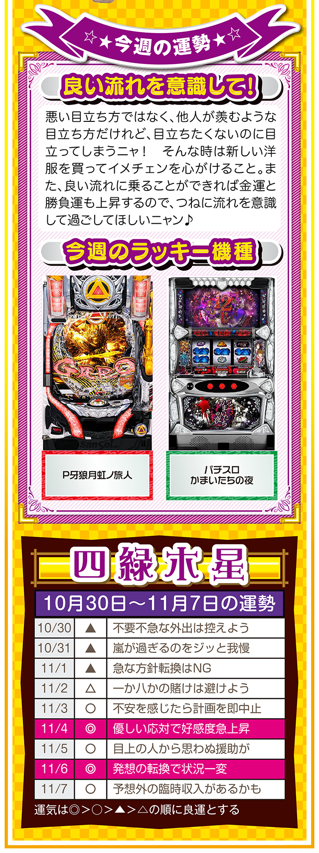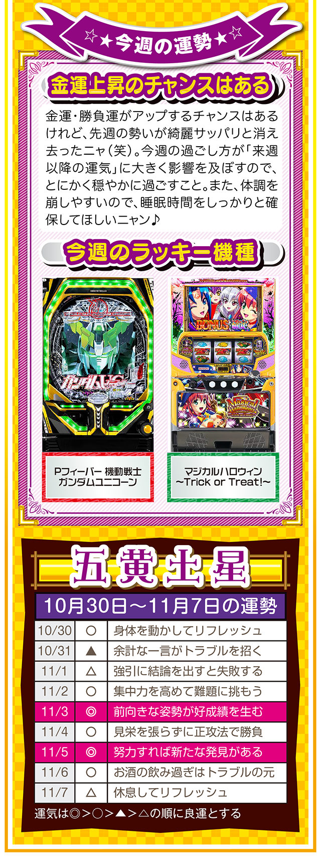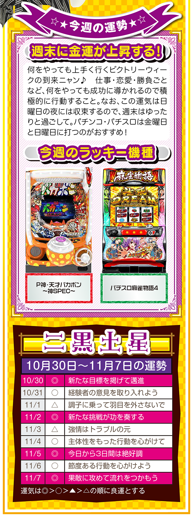 思考の変化が言い訳を封印し、良い流れと成長を運んできてくれるニャン♪ というわけで早速、11月1日から7日の1週間を鑑定ニャ(男女間における<思いやりのある言い訳>だけは肯定派のフォー・チュンチュンが、今週もオマケとして10月30日と31日の運勢も鑑定したニャン♡)!