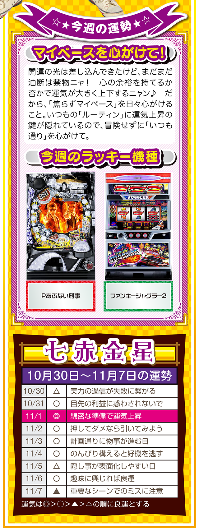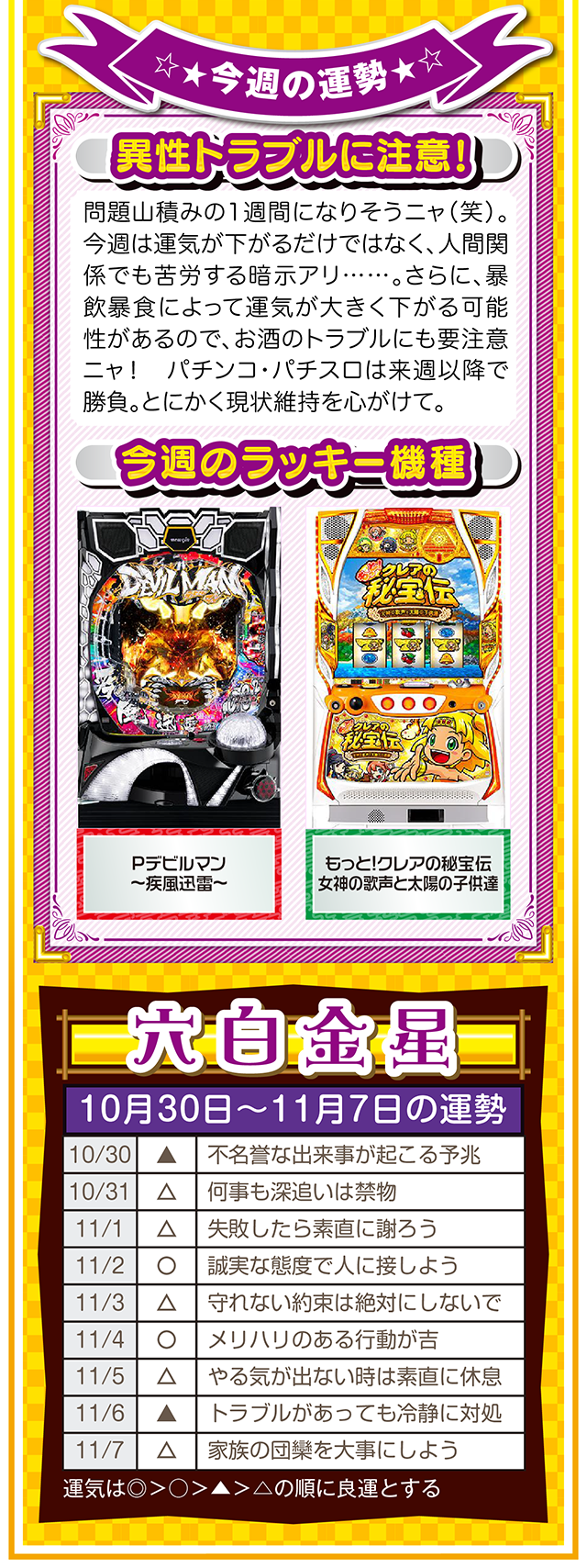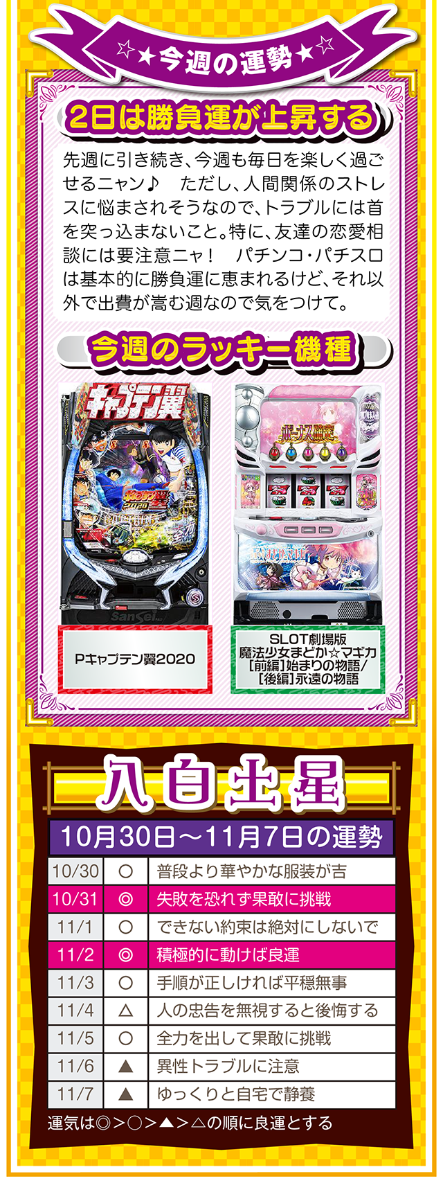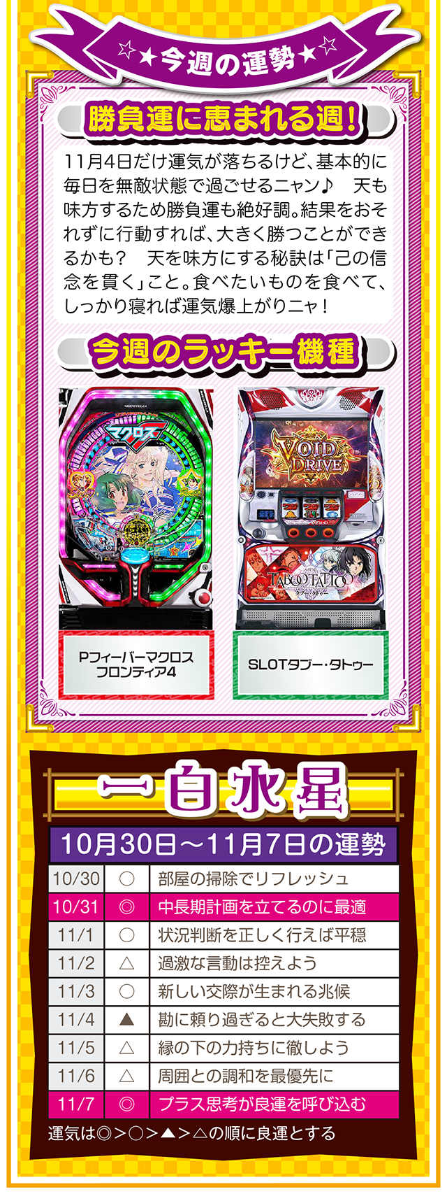 思考の変化が言い訳を封印し、良い流れと成長を運んできてくれるニャン♪ というわけで早速、11月1日から7日の1週間を鑑定ニャ(男女間における<思いやりのある言い訳>だけは肯定派のフォー・チュンチュンが、今週もオマケとして10月30日と31日の運勢も鑑定したニャン♡)!
