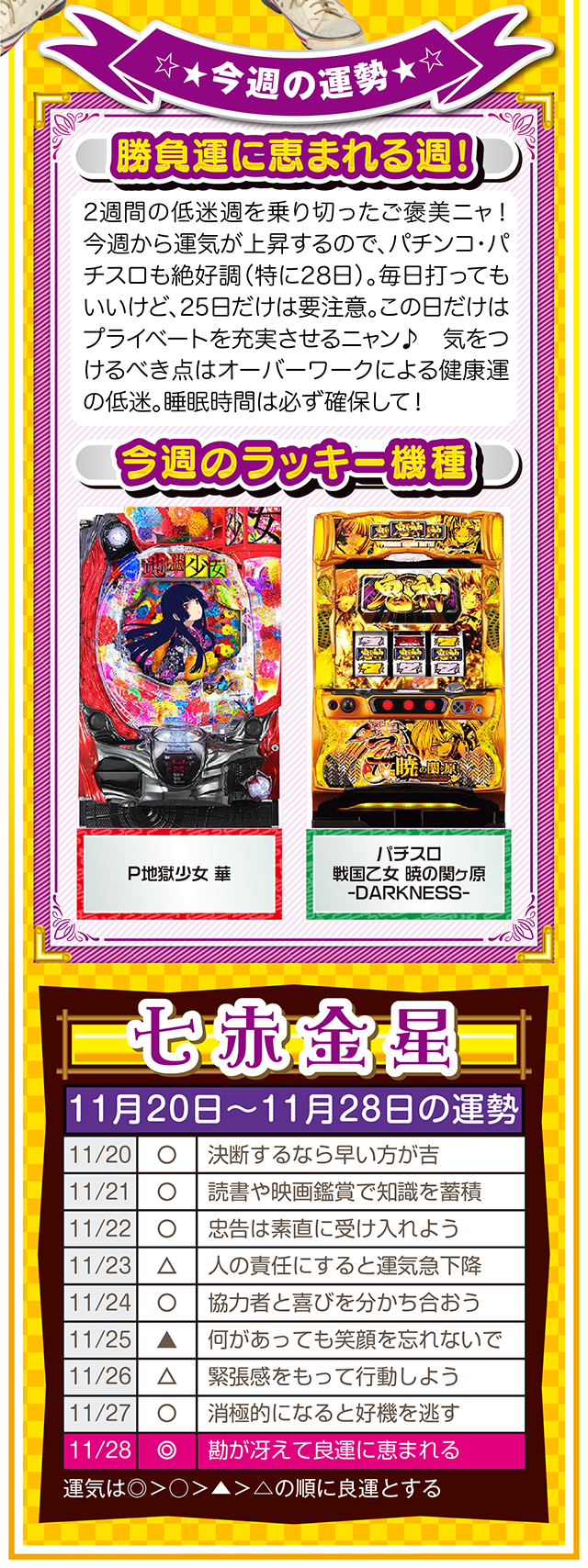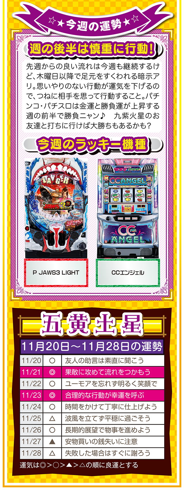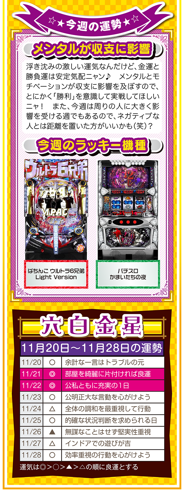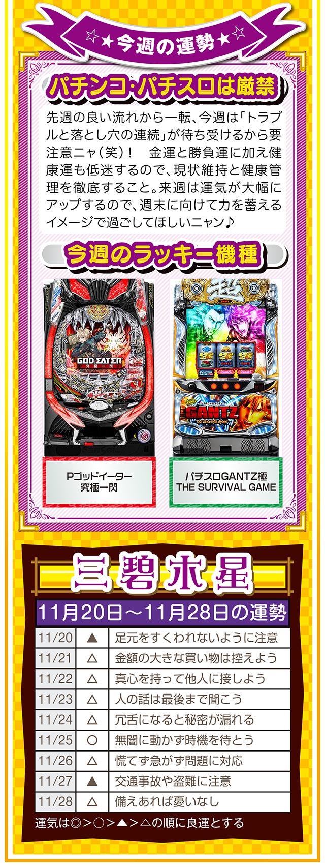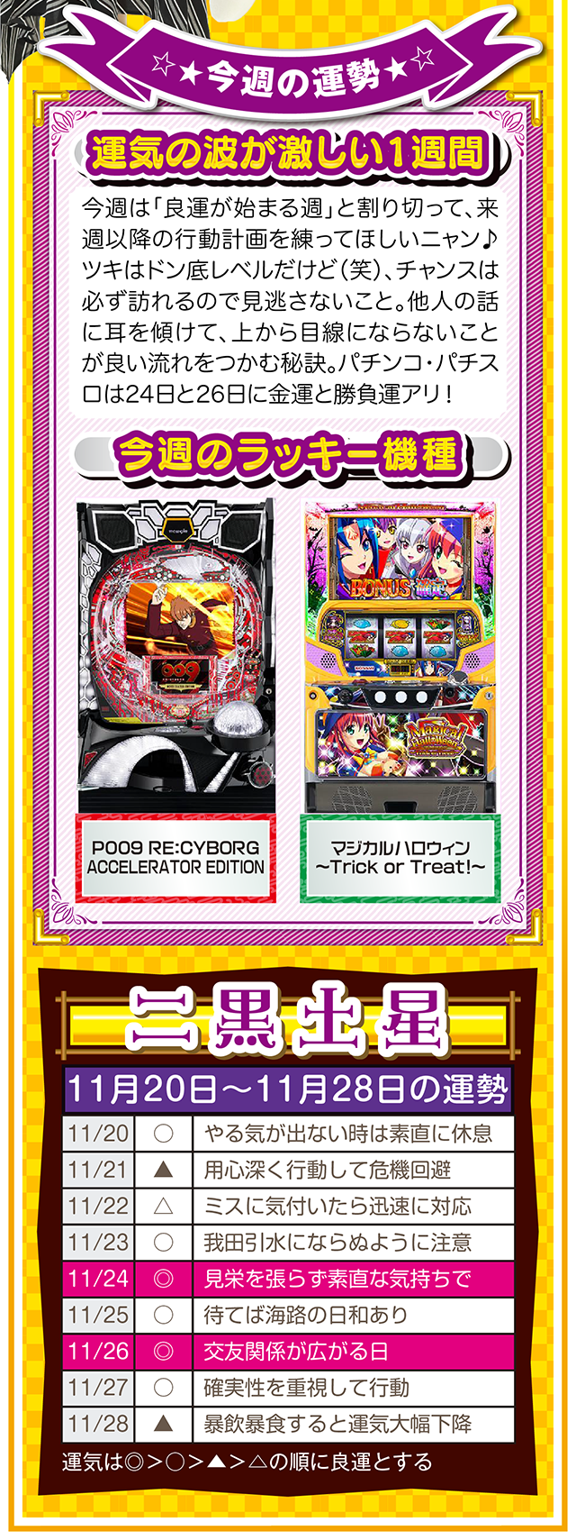 この話を信じるか信じないかはあなた次第だけど(笑)、九星気学は統計学をベースにした学問ニャ! 行動を起こした者にのみ、ラッキーが訪れるということを忘れないでほしいニャン♪ というわけで早速、11月22日から28日の1週間を鑑定ニャ(クリスマスの予定が去年同様カラっぽのフォー・チュンチュンが、オマケとして11月20日と21日の運勢も鑑定したニャン♡)!