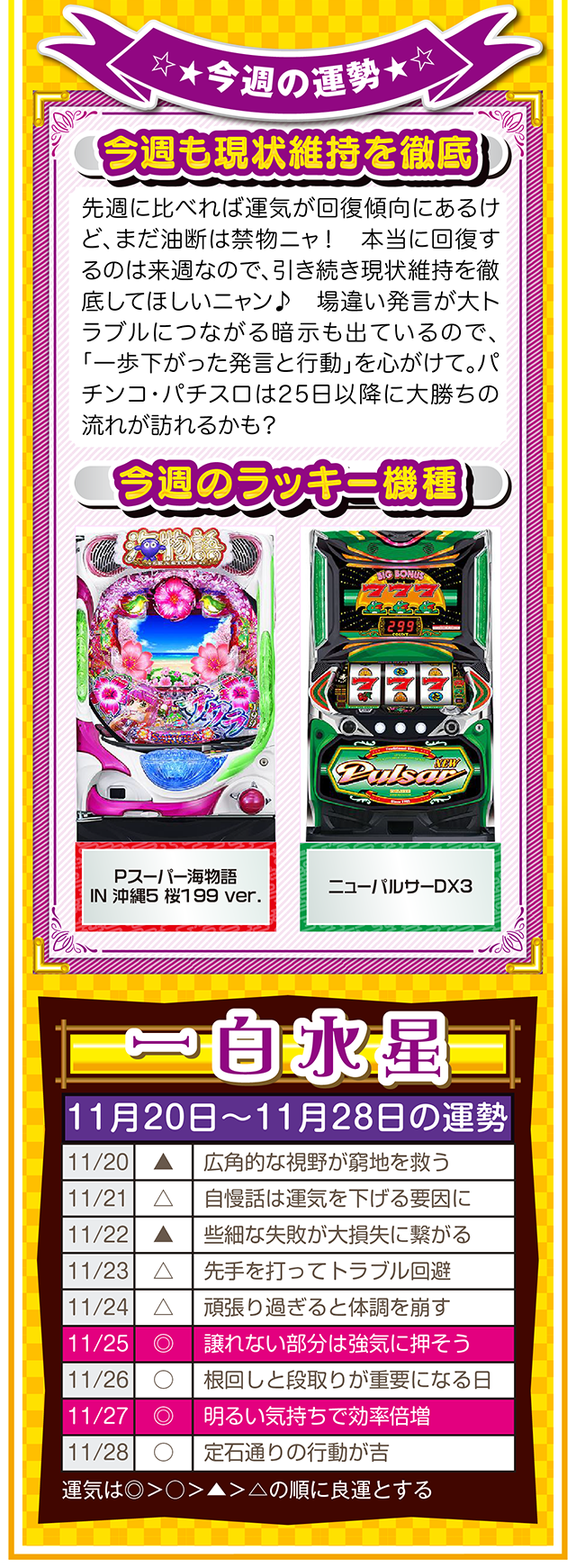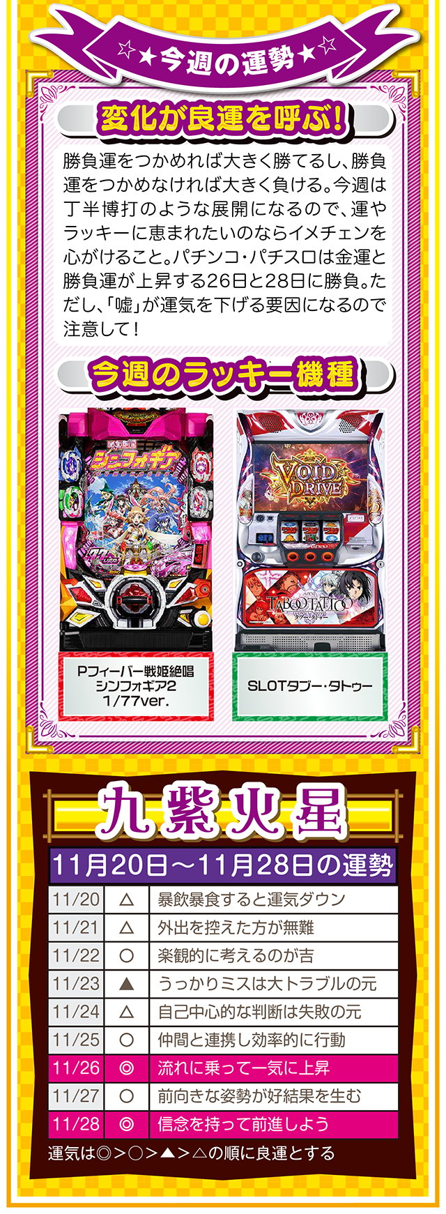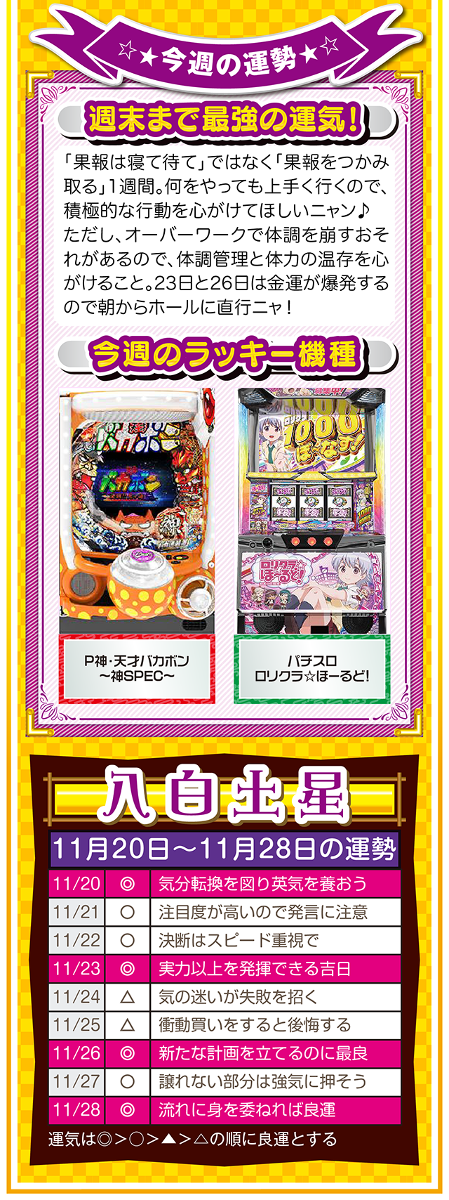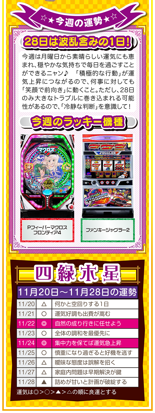 この話を信じるか信じないかはあなた次第だけど(笑)、九星気学は統計学をベースにした学問ニャ! 行動を起こした者にのみ、ラッキーが訪れるということを忘れないでほしいニャン♪ というわけで早速、11月22日から28日の1週間を鑑定ニャ(クリスマスの予定が去年同様カラっぽのフォー・チュンチュンが、オマケとして11月20日と21日の運勢も鑑定したニャン♡)!