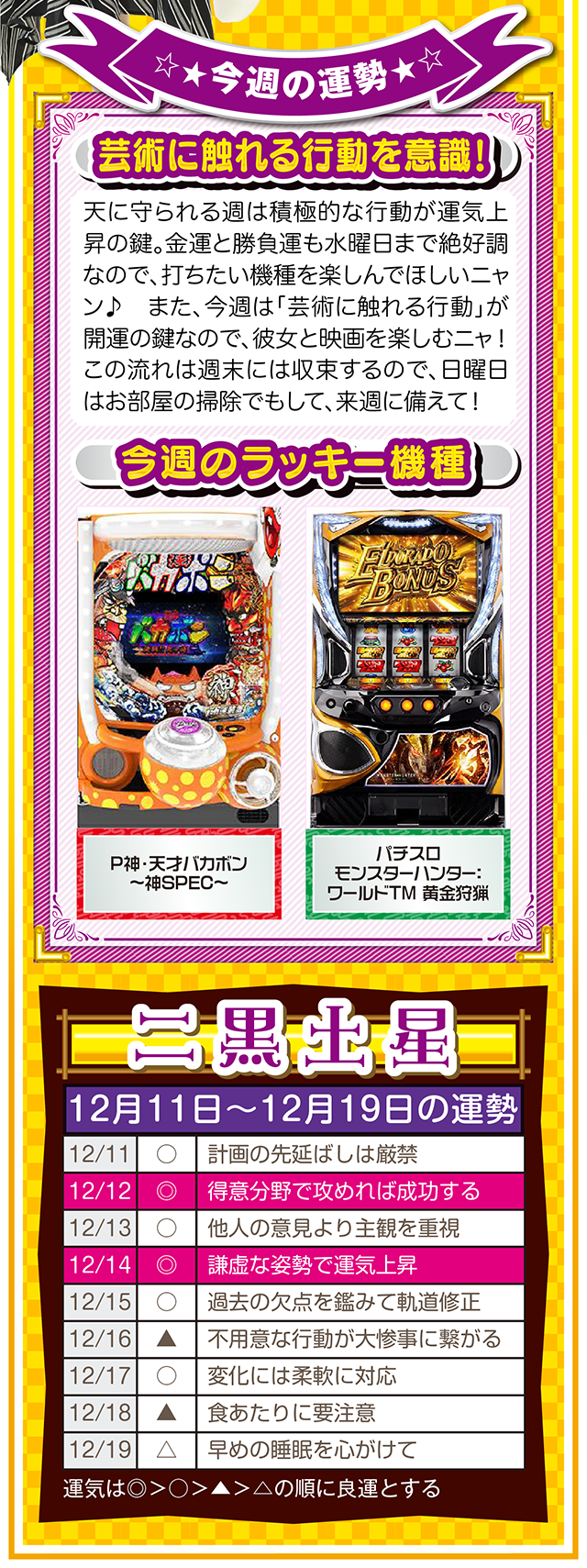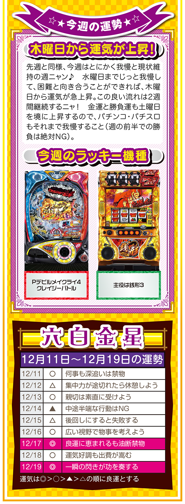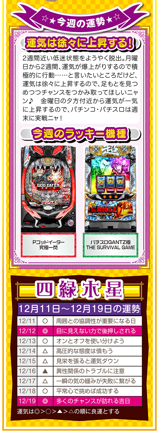 運とかツキはポジティブな人が大好き。自分を肯定しつつ反省して、良い流れを呼び込んでほしいニャン♪ というわけで早速、12月13日から12月19日の1週間を鑑定ニャ(付き合う男に自己愛が激しすぎると必ず言われるフォー・チュンチュンが、オマケとして12月11日と12日の運勢も鑑定したニャン♡)!