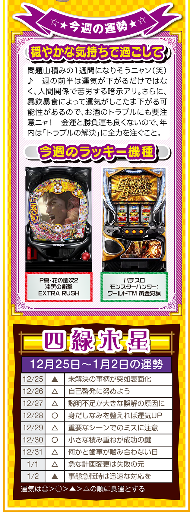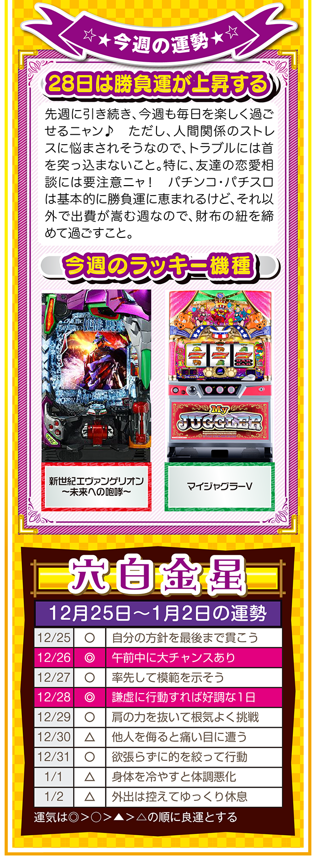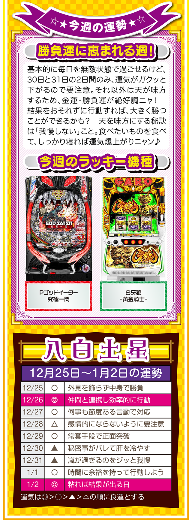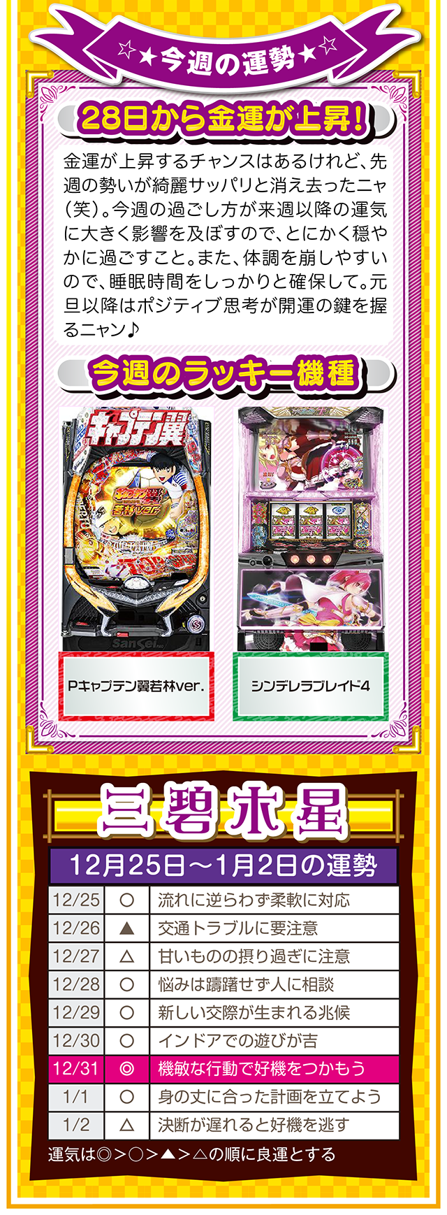 2月4日以降は「自然との融合」、そして「神仏との融合」が求められる年。心の不安と不信感が運気を下げる要因になるので、何かヘコむことがあったらインドアではなくアウトドアを心掛けること。また、ネガティブ発言が災いを招く年になるので、「辛くても前向き発言」を念頭に過ごしてほしいニャン♪ というわけで早速、12月27日から1月2日の1週間を鑑定ニャ(有馬記念で一発当てる予定のフォー・チュンチュンが、今週もオマケとして25日と26日の運勢も鑑定したニャン♡)!
