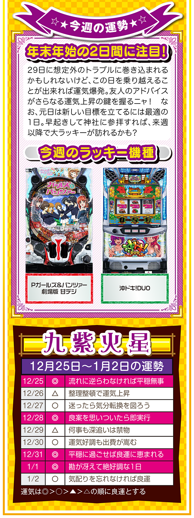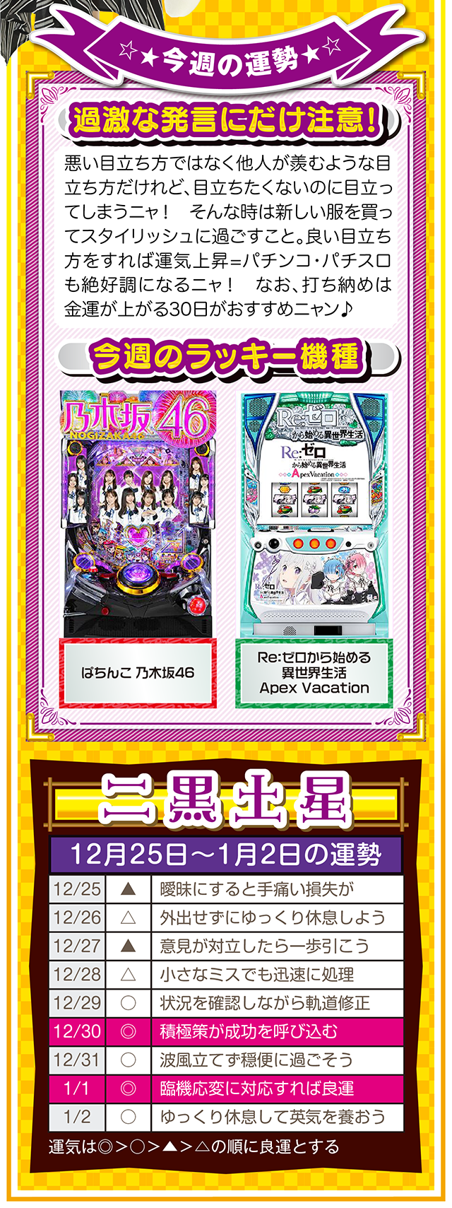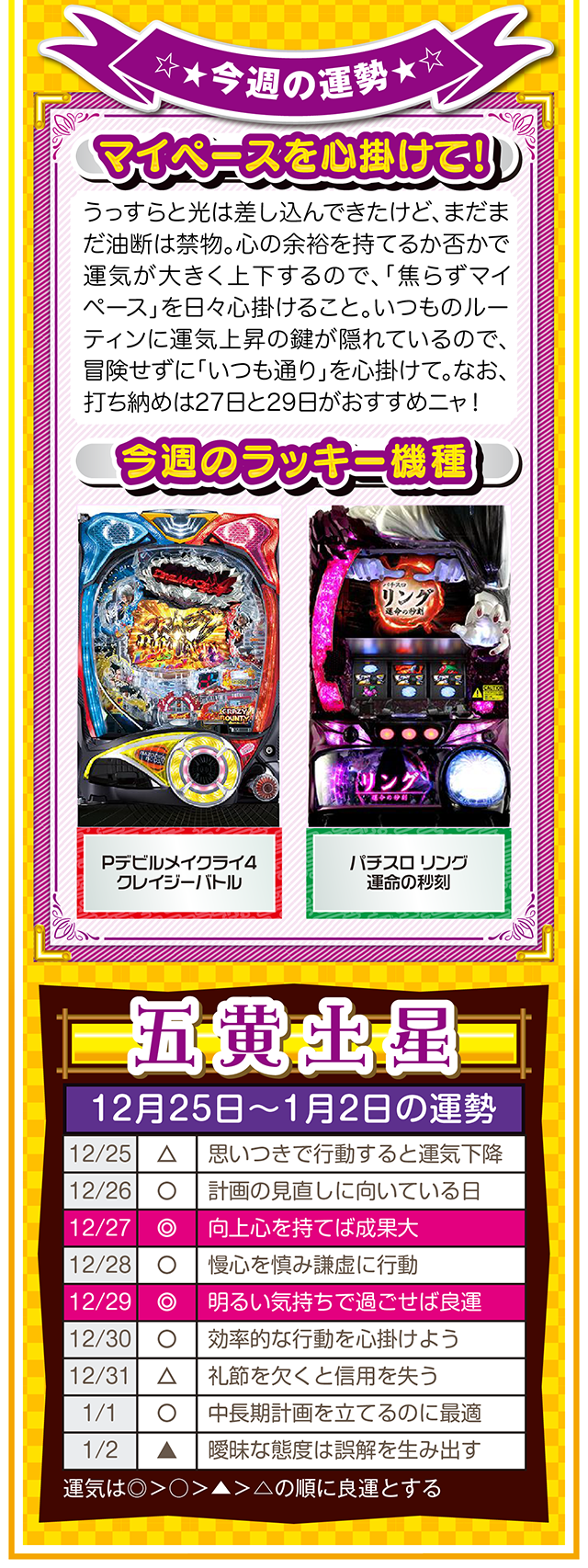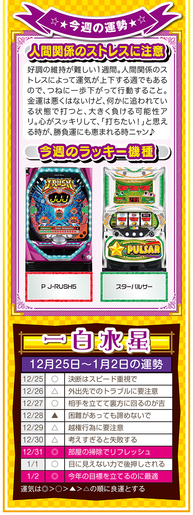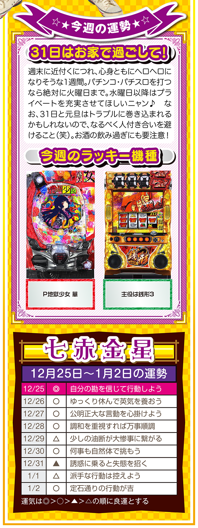 2月4日以降は「自然との融合」、そして「神仏との融合」が求められる年。心の不安と不信感が運気を下げる要因になるので、何かヘコむことがあったらインドアではなくアウトドアを心掛けること。また、ネガティブ発言が災いを招く年になるので、「辛くても前向き発言」を念頭に過ごしてほしいニャン♪ というわけで早速、12月27日から1月2日の1週間を鑑定ニャ(有馬記念で一発当てる予定のフォー・チュンチュンが、今週もオマケとして25日と26日の運勢も鑑定したニャン♡)!