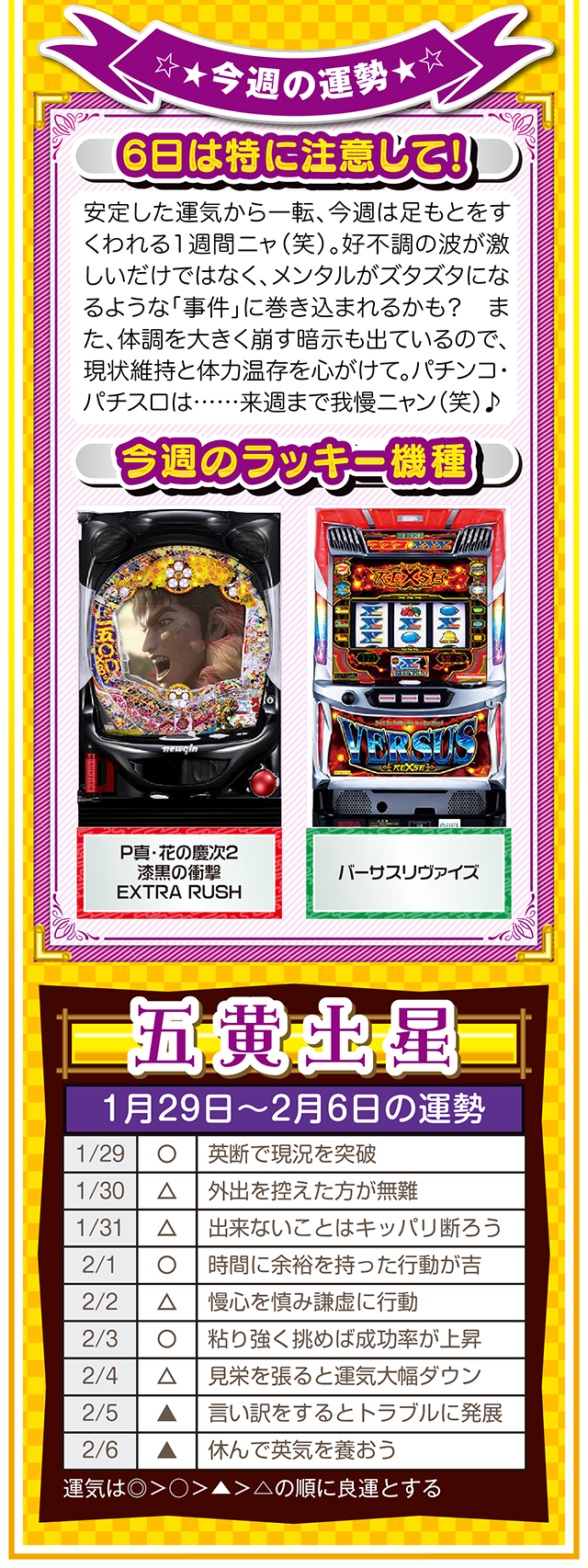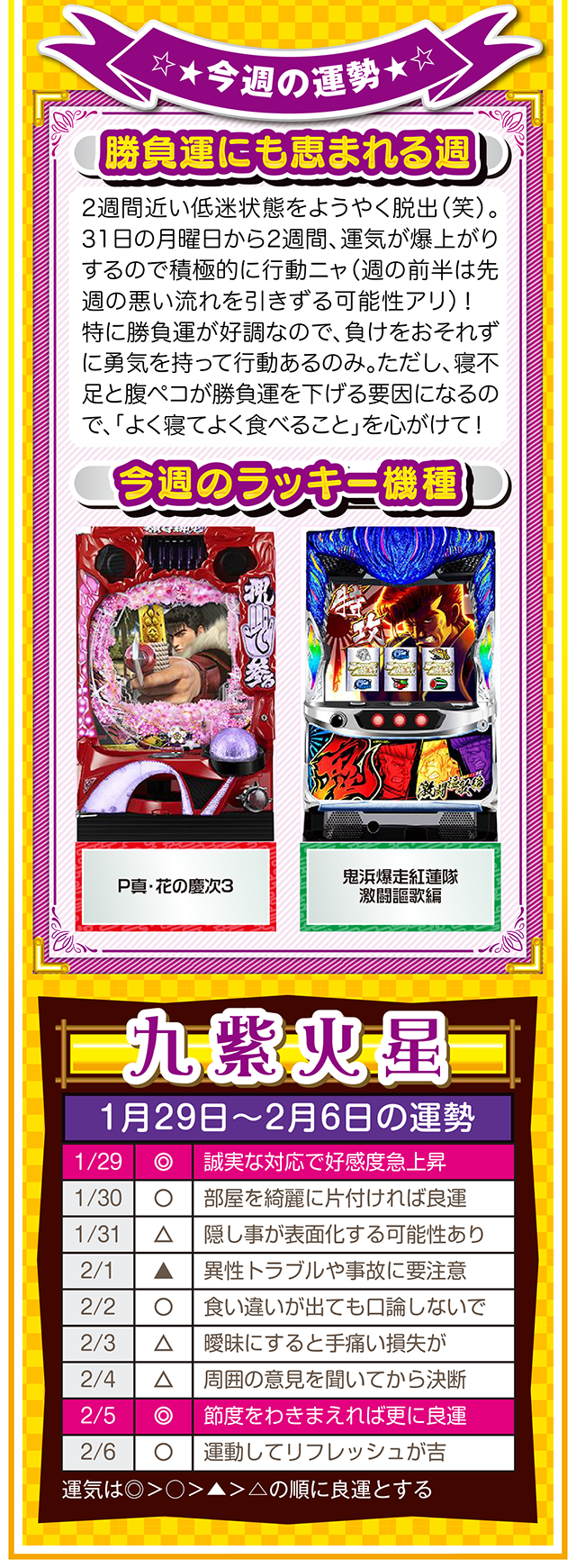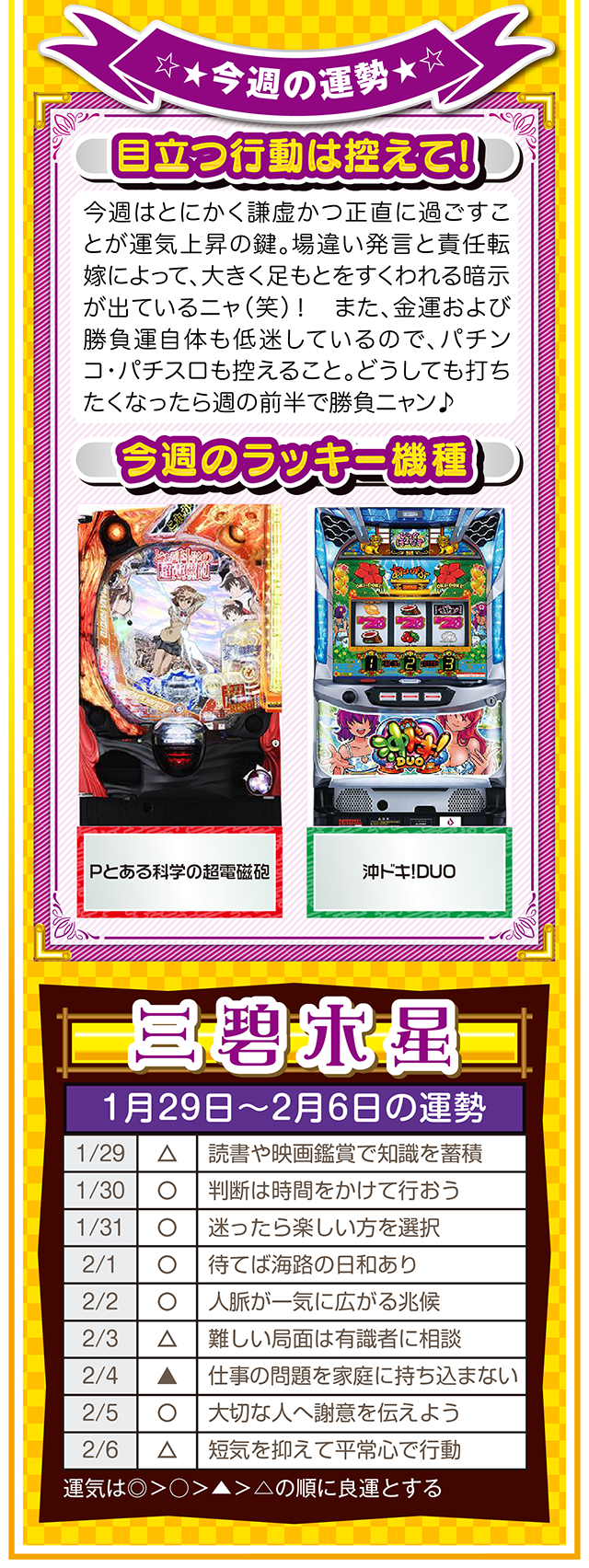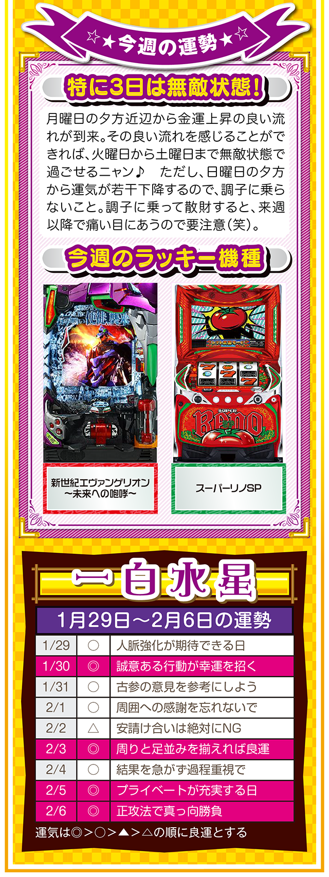 動くキッカケを逃す=良運をつかむチャンスを逃すということ。九星気学は「道標」。この道標をもっと上手に、もっと上手く使ってほしいニャ! 当然、勇気と覚悟と度胸を持って…ね(笑)。というわけで早速、1月31日から2月6日の1週間を鑑定ニャ(異性に対しては勇気と覚悟と度胸を持てないフォー・チュンチュンが、オマケとして1月29日と30日の運勢も鑑定したニャン♡)!