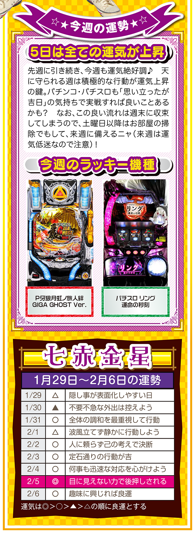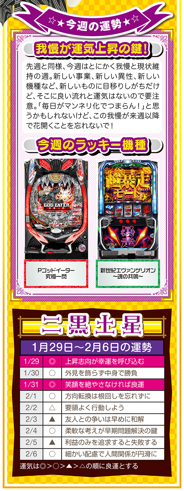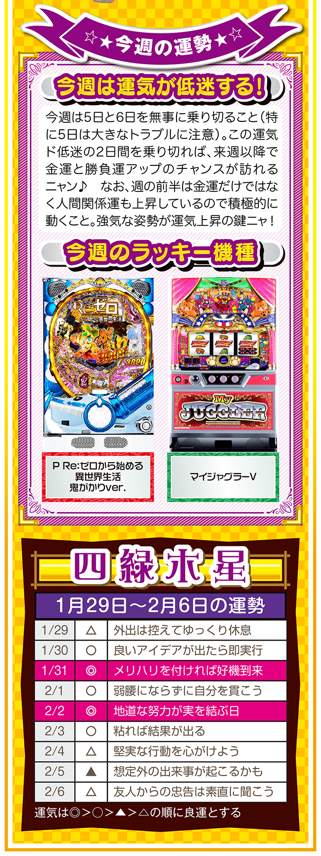 動くキッカケを逃す=良運をつかむチャンスを逃すということ。九星気学は「道標」。この道標をもっと上手に、もっと上手く使ってほしいニャ! 当然、勇気と覚悟と度胸を持って…ね(笑)。というわけで早速、1月31日から2月6日の1週間を鑑定ニャ(異性に対しては勇気と覚悟と度胸を持てないフォー・チュンチュンが、オマケとして1月29日と30日の運勢も鑑定したニャン♡)!