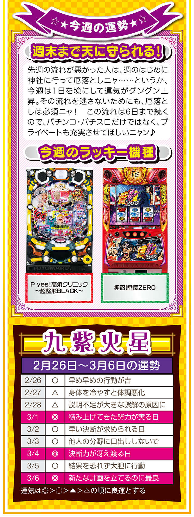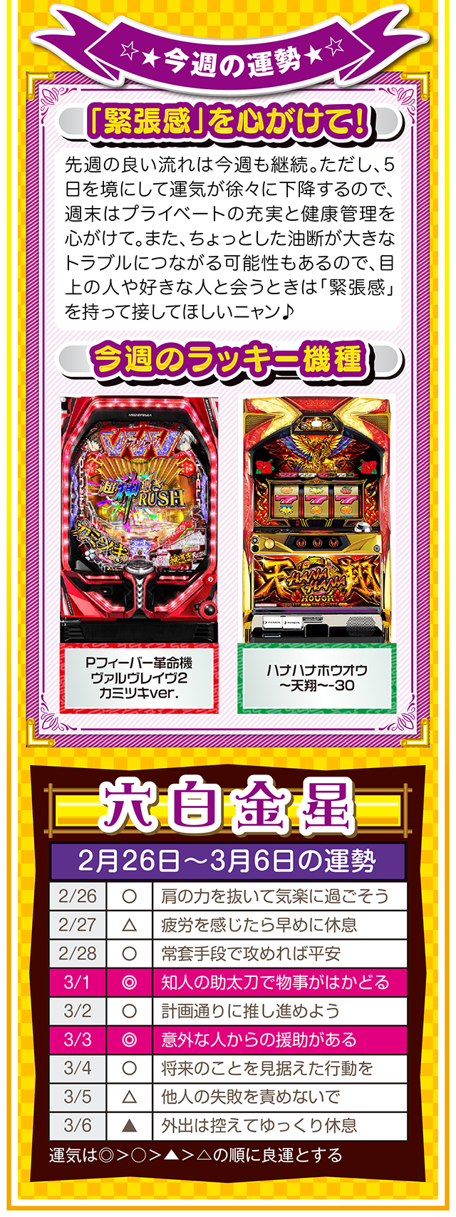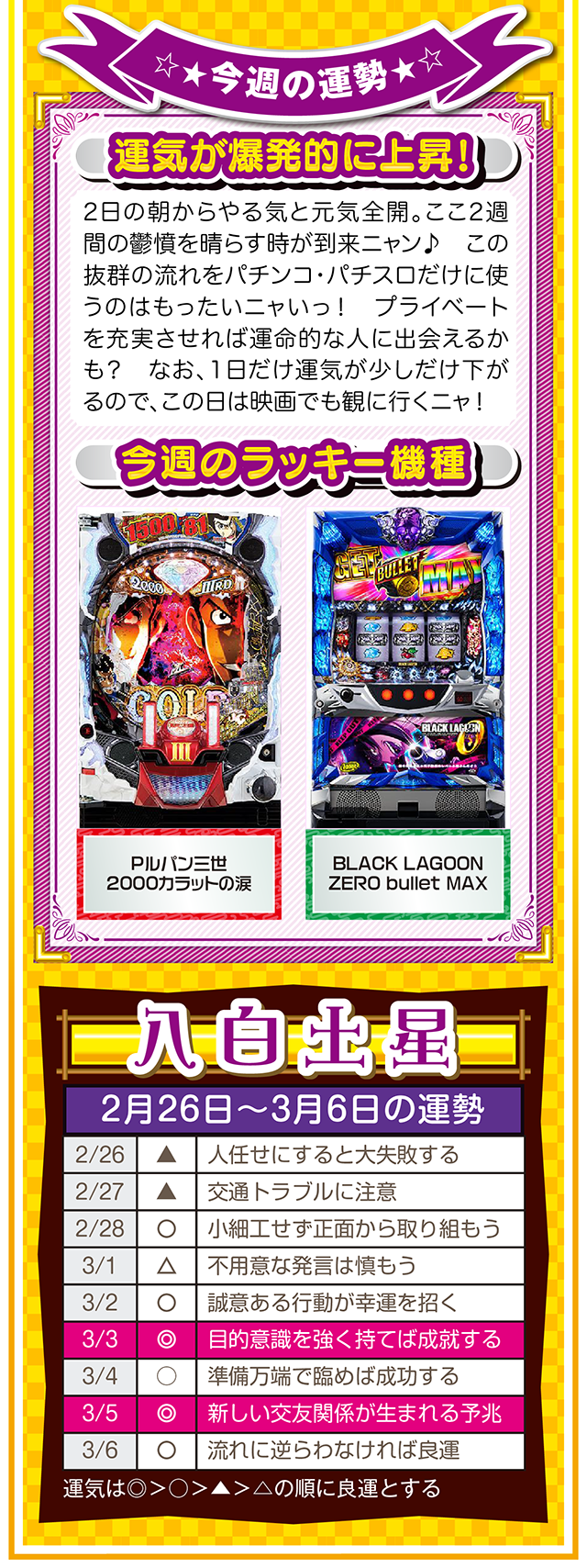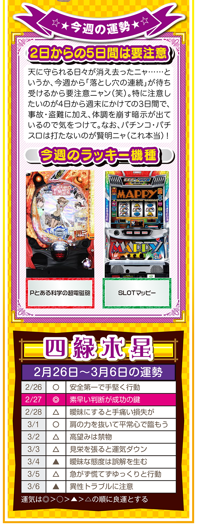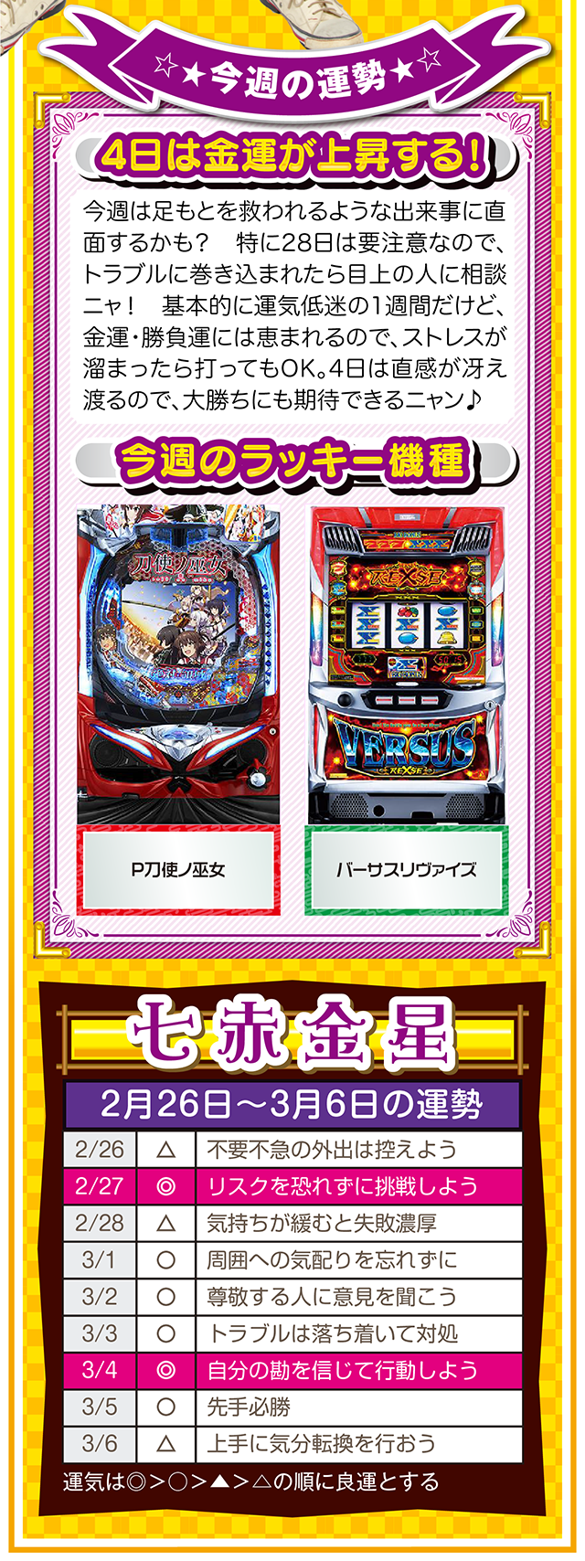悪いところもあれば、良いところもある。この「良いところ」を想像するクセを付ける。たったこれだけで視界が変わり、人生が良い方向に進んでいく。些細なことは気にせず、自分のマイナス目線に負けない習慣を心がけてほしいニャン♪ というわけで早速、2月28日から3月6日の1週間を鑑定ニャ(苦手な人はバッサリと切り捨てるフォー・チュンチュンが、オマケとして2月26日と27日の運勢も鑑定したニャ♡)!