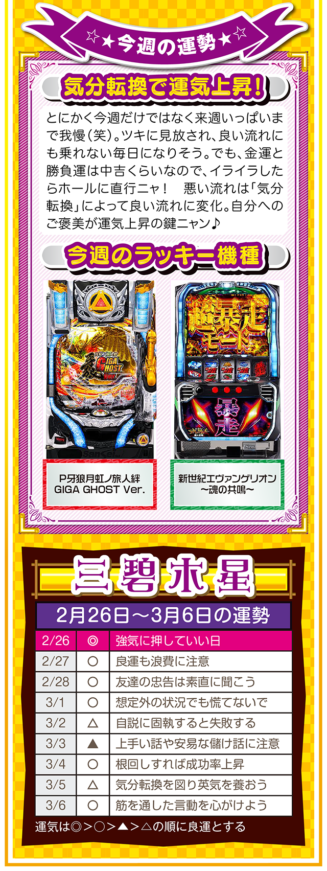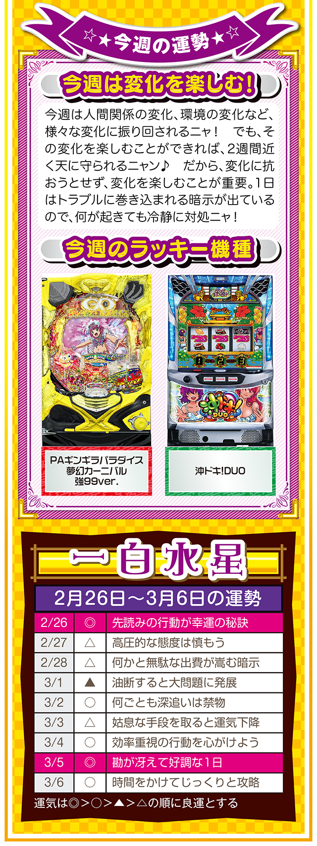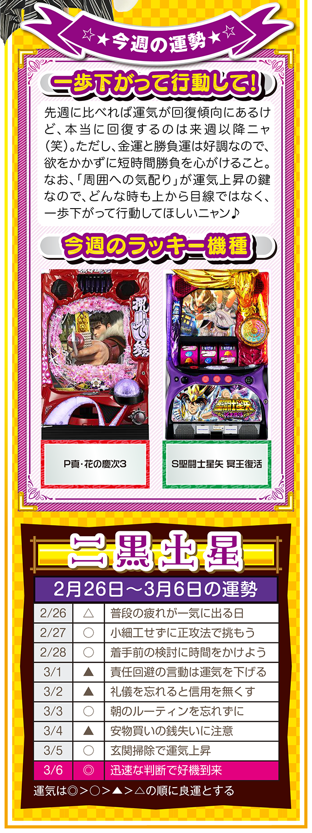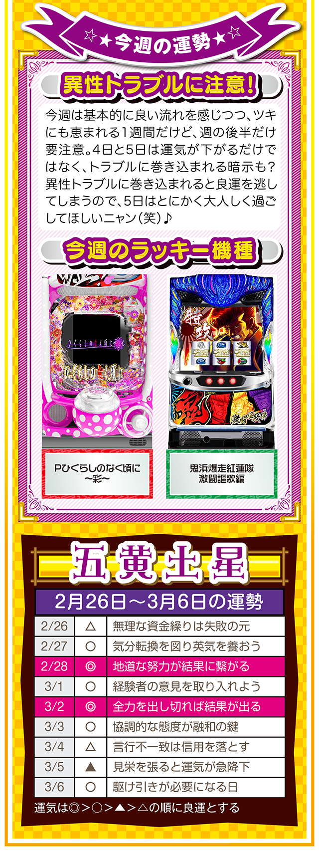 悪いところもあれば、良いところもある。この「良いところ」を想像するクセを付ける。たったこれだけで視界が変わり、人生が良い方向に進んでいく。些細なことは気にせず、自分のマイナス目線に負けない習慣を心がけてほしいニャン♪ というわけで早速、2月28日から3月6日の1週間を鑑定ニャ(苦手な人はバッサリと切り捨てるフォー・チュンチュンが、オマケとして2月26日と27日の運勢も鑑定したニャ♡)!