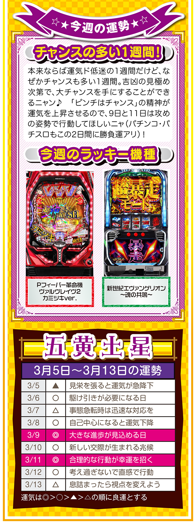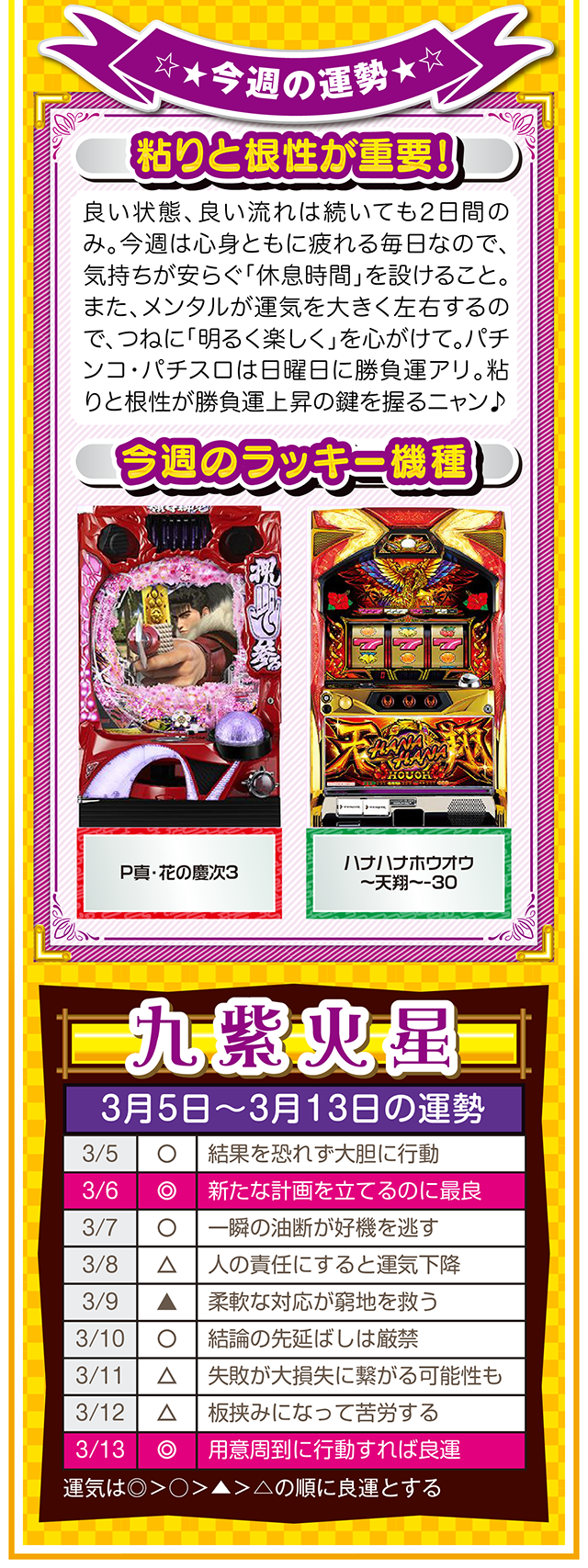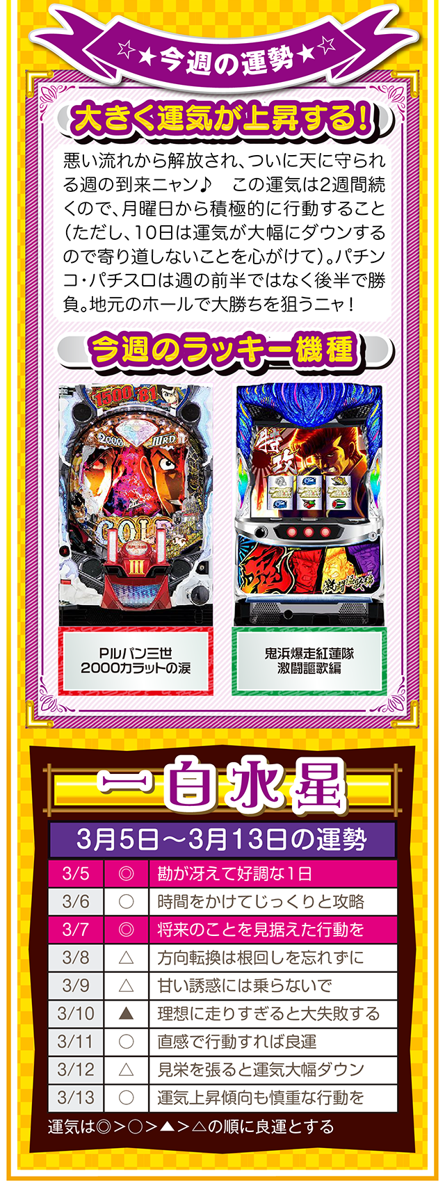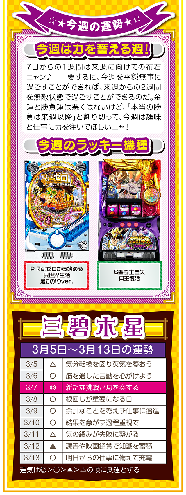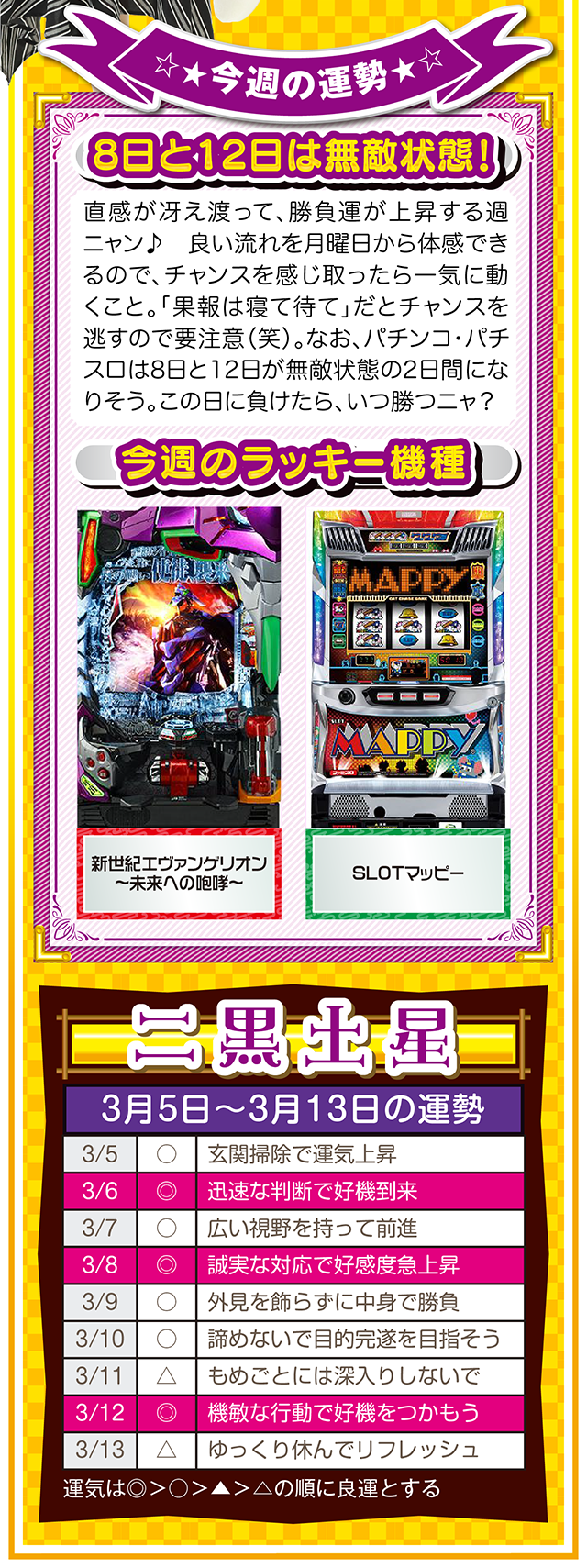 そこで今週は本命星別の注目アクションを総まとめ。「運気補給の月」で良い運気を身にまとえば、パチンコ・パチスロだけではなく、仕事運や恋愛運も急上昇するニャン♪