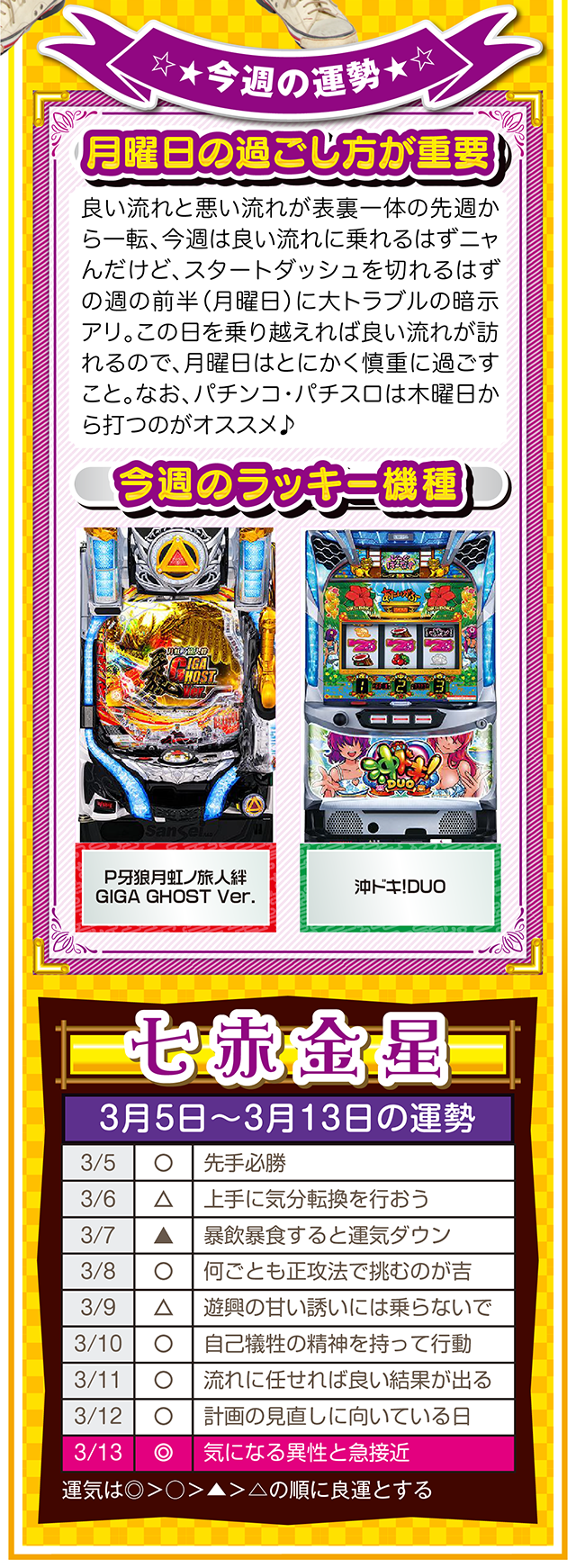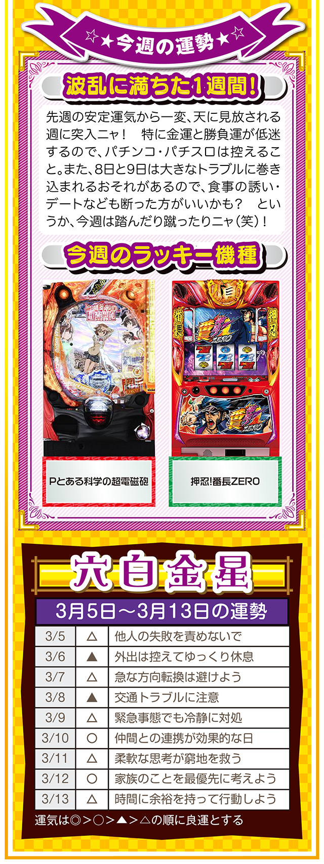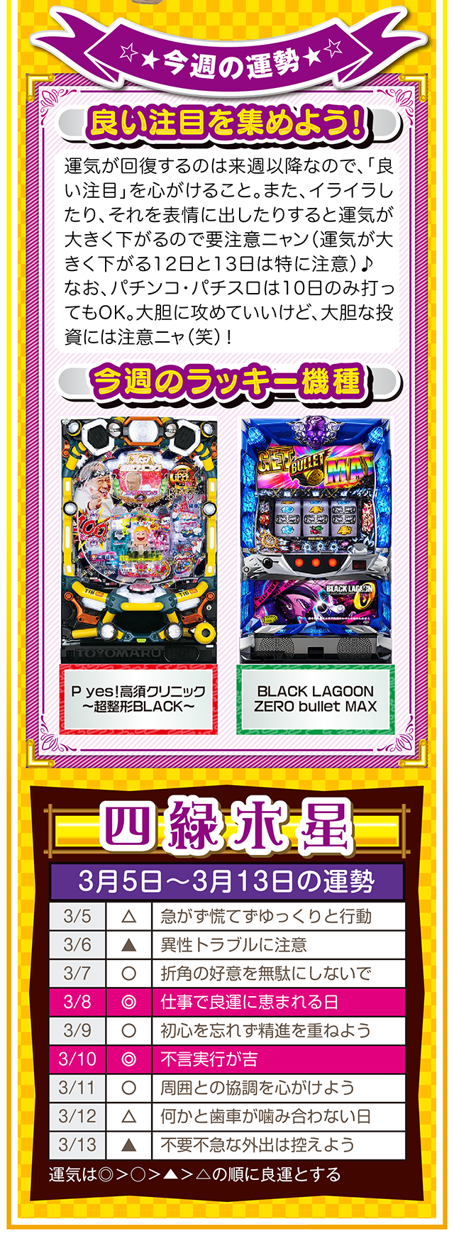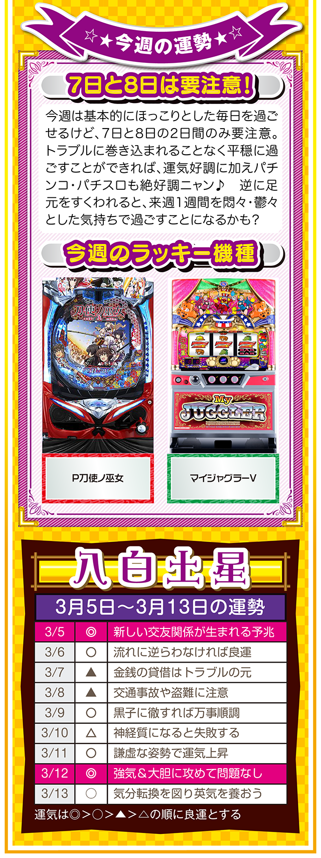 そこで今週は本命星別の注目アクションを総まとめ。「運気補給の月」で良い運気を身にまとえば、パチンコ・パチスロだけではなく、仕事運や恋愛運も急上昇するニャン♪