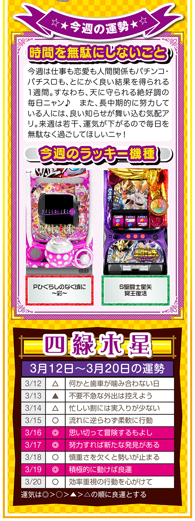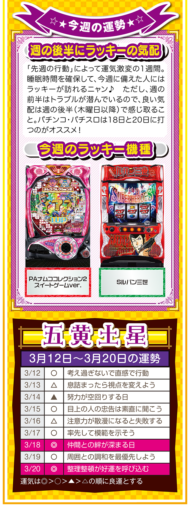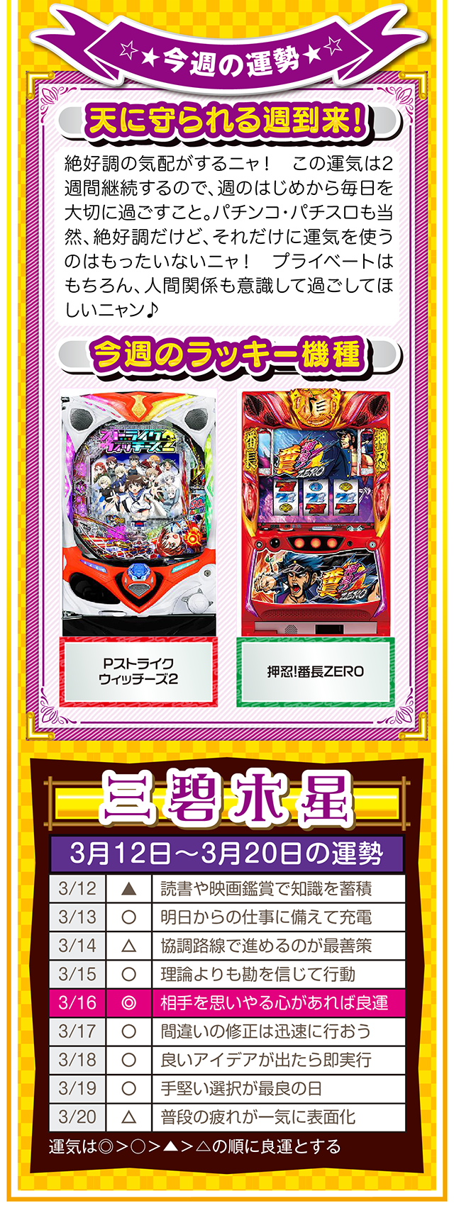 相手の魅力を見抜ける人は、自分自身の魅力も磨かれる。観察力ではなく洞察力を意識すれば、人生をもっと華やかに、そして楽しく過ごせるニャン♪ というわけで早速、3月14日から20日の1週間を鑑定ニャ(異性に対しては観察力全開のフォー・チュンチュンが、オマケとして3月12日と13日の運勢も鑑定したニャン♡)!