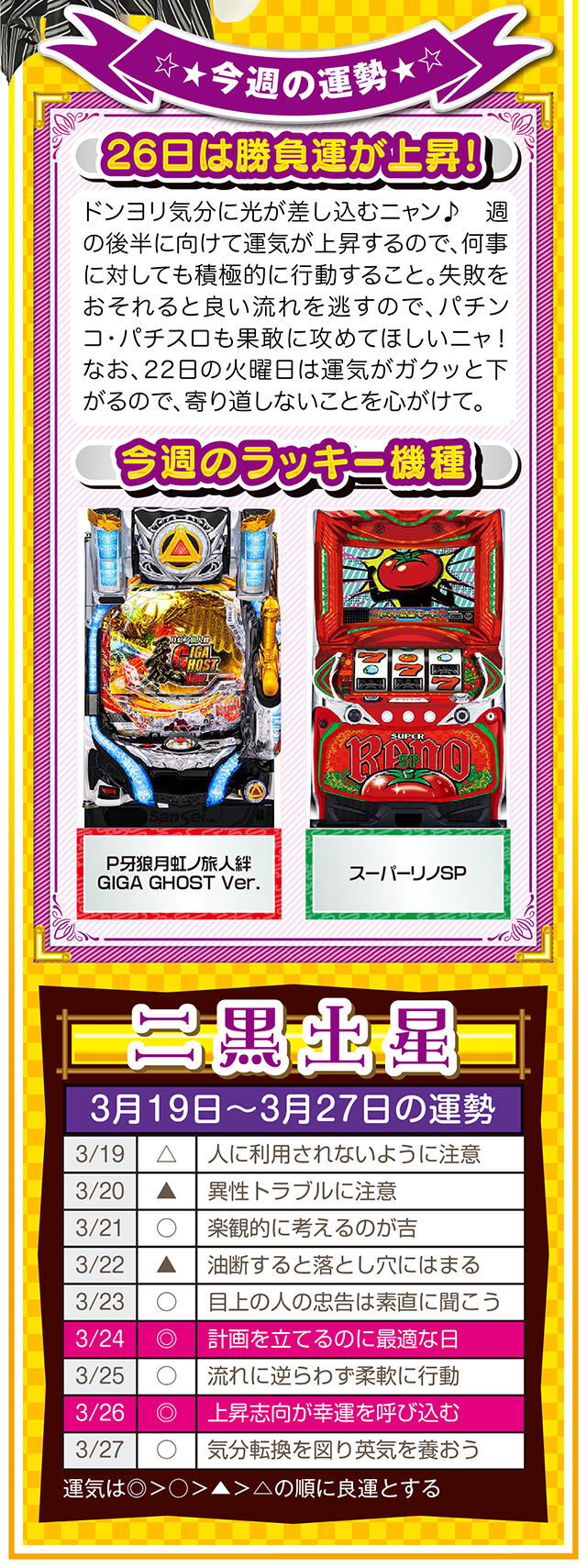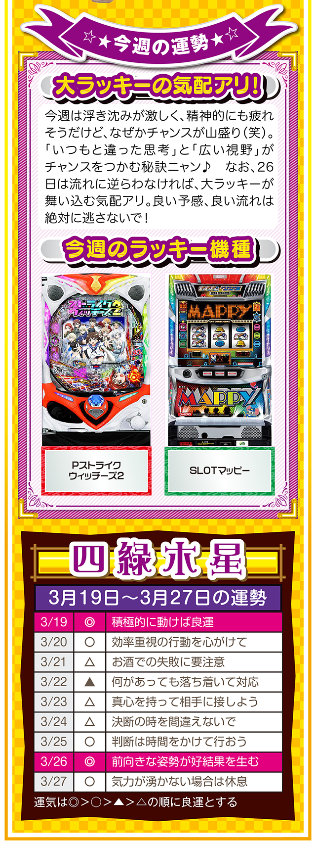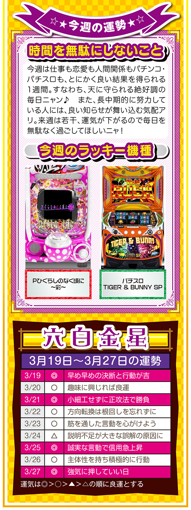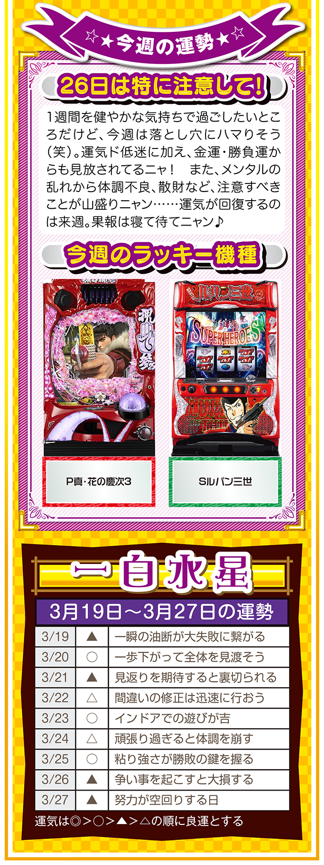 もちろん、怒りや悲しみにも大小があるけど、「感情の揺らぎ」に注目すれば、その人の人間性の本質が見えてくる。何で怒ったのか、何で悲しんだのかを分析することが、円滑な恋愛関係、良好な人間関係に繋がることを覚えておいてほしいニャン♪ というわけで早速、3月21日から27日の1週間を鑑定ニャ(白馬に乗った王子様が現れないため、日々悲哀全開のフォー・チュンチュンが、オマケとして3月19日と20日の運勢も鑑定したニャ♡)!