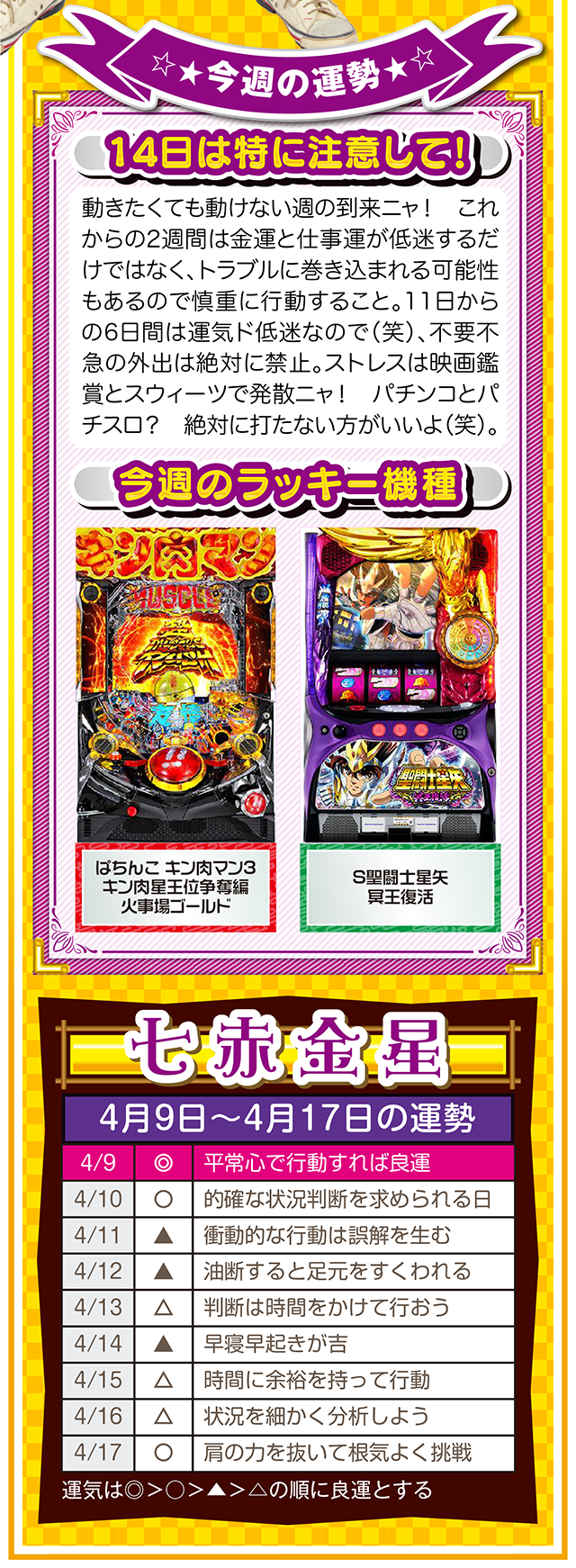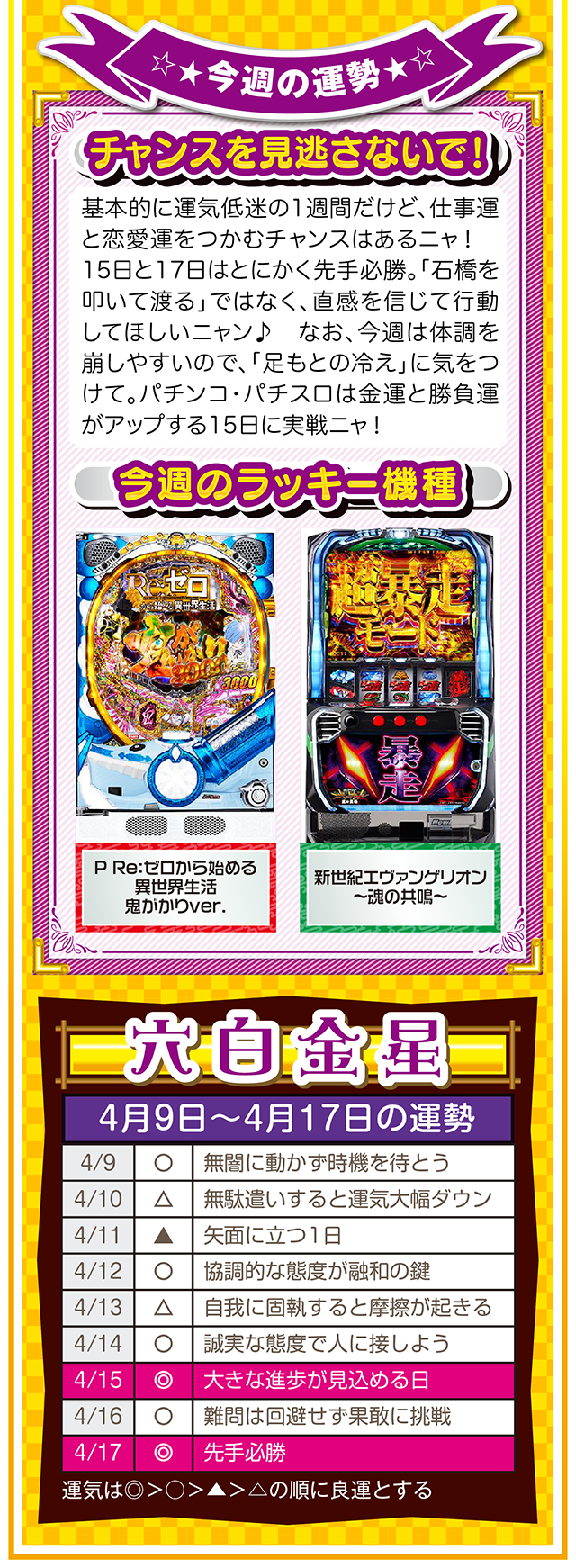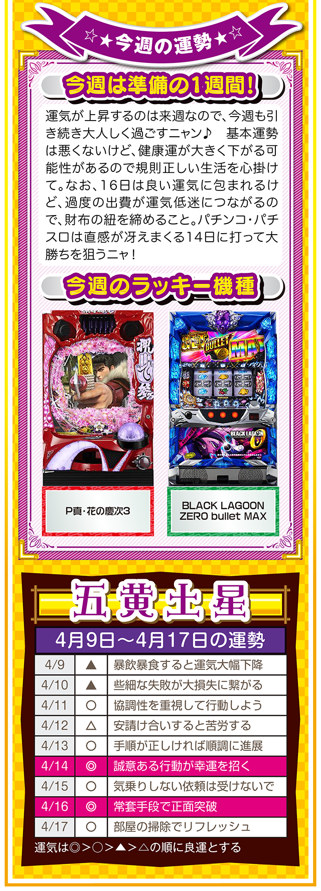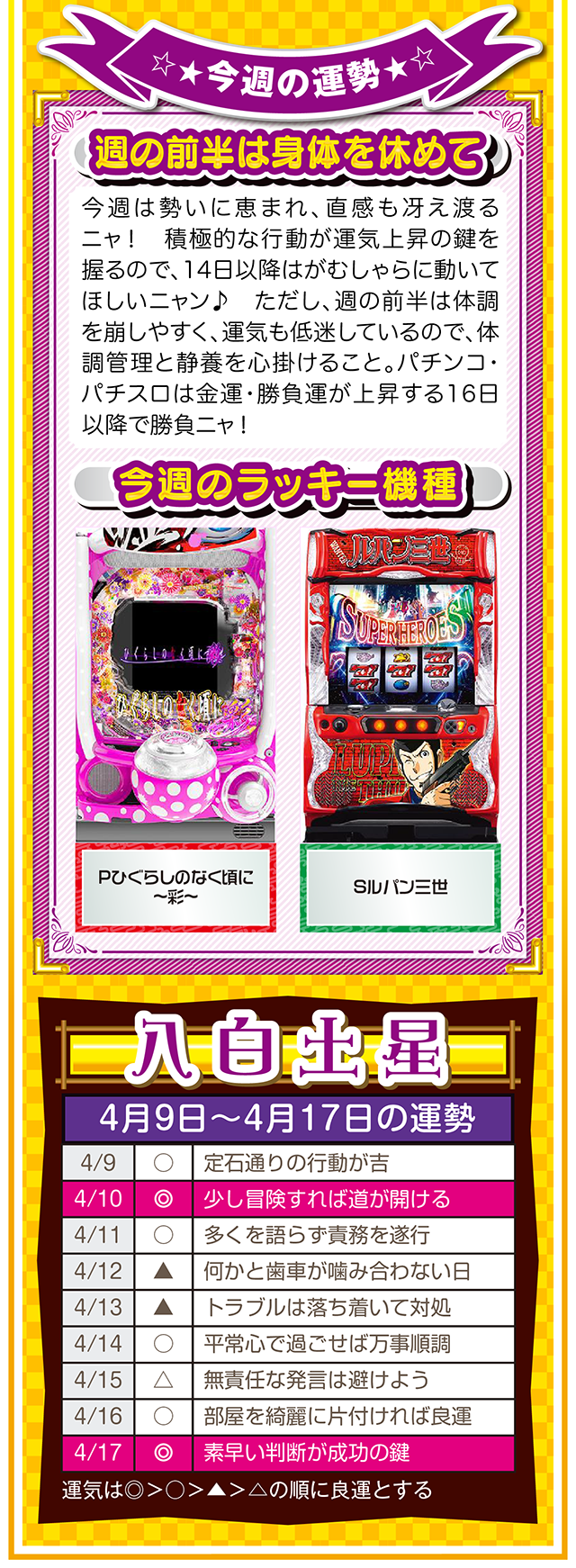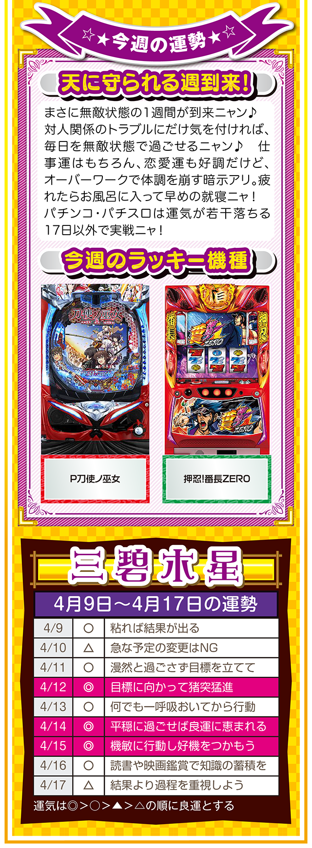 期待するエネルギーのバランスを上手く取れる人は、「聞き上手」であり「自分で考える力」を持っている人。そういった人が常に、良い流れと運気をつかみ、最終的に幸運をつかむことを覚えておいてほしいニャン♪ というわけで早速、4月11日から17日の1週間を鑑定ニャ(異性との距離感がまっっったくわからないフォー・チュンチュンが、オマケとして4月9日と10日の運勢も鑑定したニャン♡)!