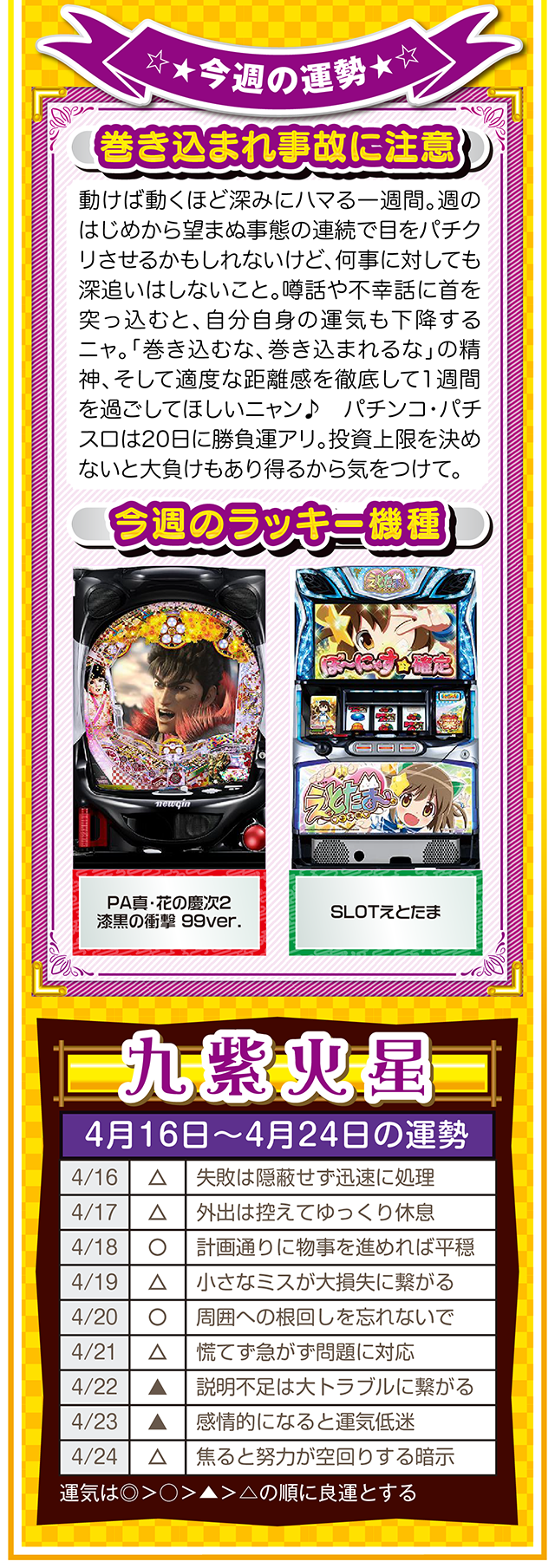 プラスになるように生きる。そして、どんな状況でもプラスに変換できることを忘れないでほしいニャン♪ というわけで早速、4月18日から24日の1週間を鑑定ニャ(失恋してから3年経つのに、なかなか新しいパートナーに出会えないフォー・チュンチュンが、オマケとして4月16日と17日の運勢も鑑定したニャン♡)!