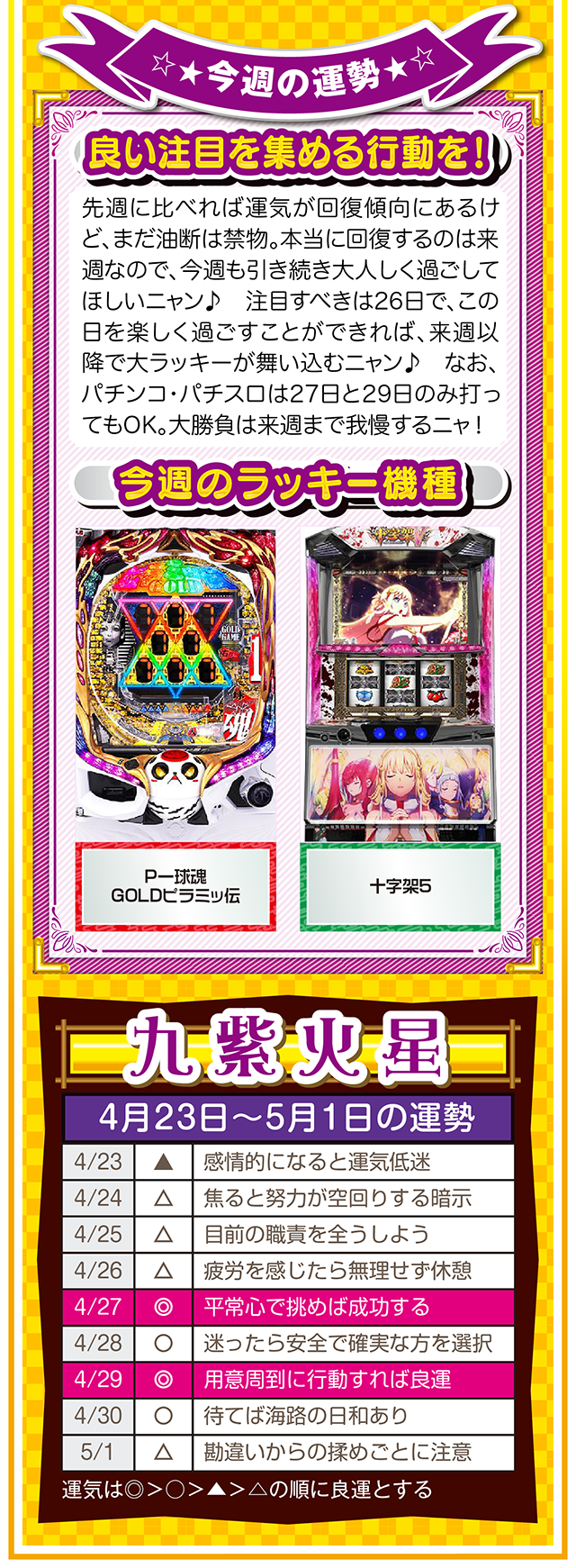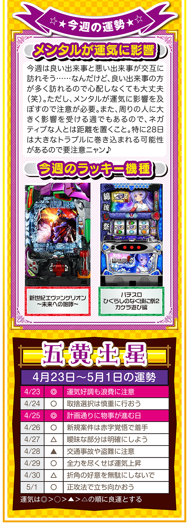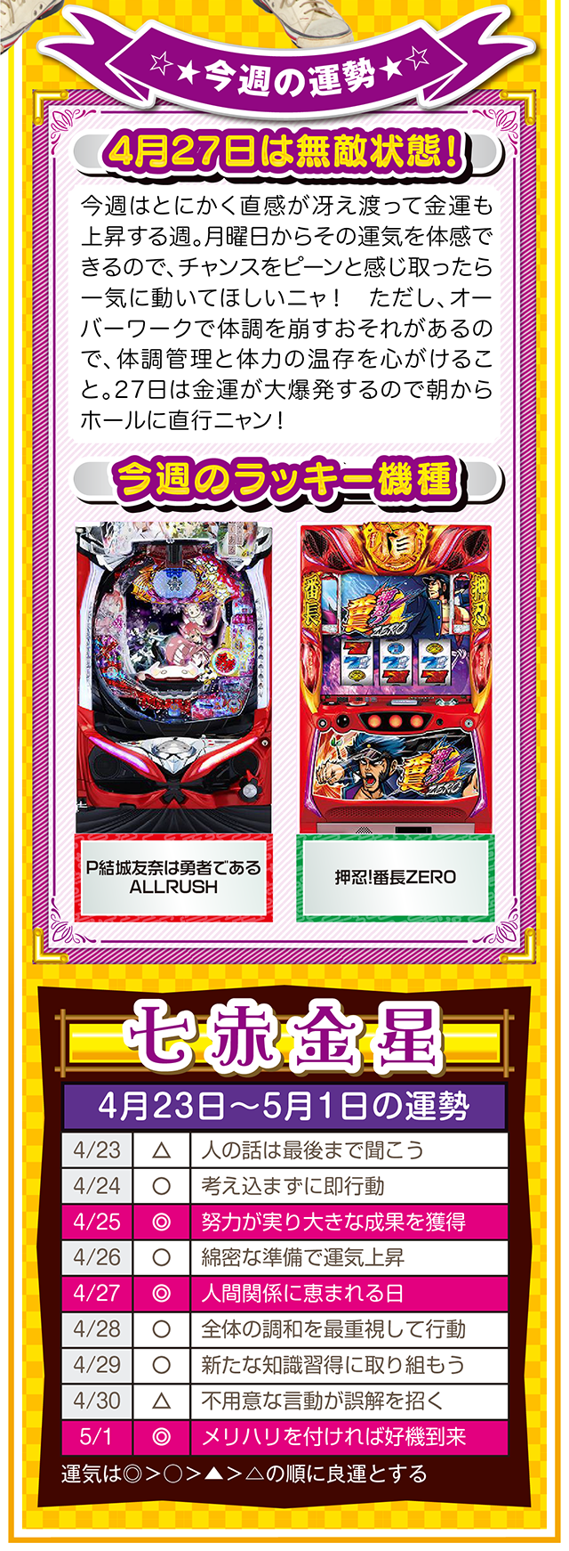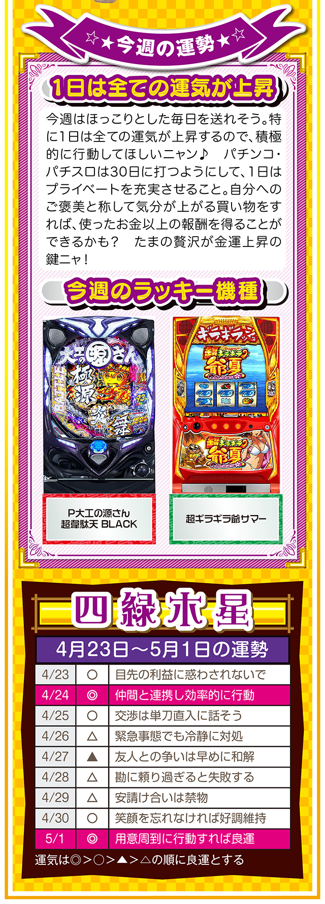 「成功する!」とポジティブな発言を繰り返すのは大事。でも、行動を起こさなければ成功をつかめないことを理解してほしいニャン♪ というわけで早速、4月25日から5月1日の1週間を鑑定ニャ(異性に対しては引っ込み思案のフォー・チュンチュンが、オマケとして4月23日と24日の運勢も鑑定したニャン♡)!