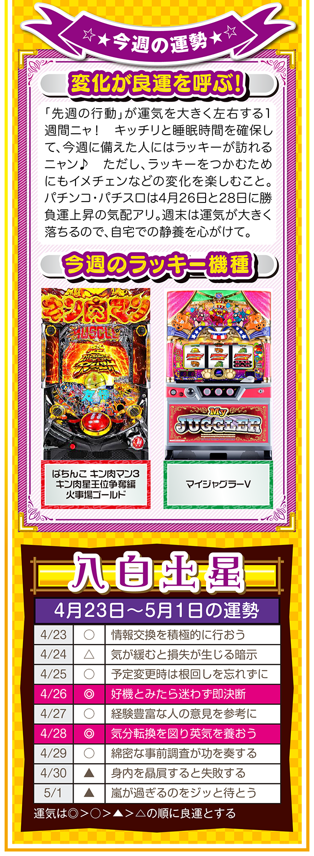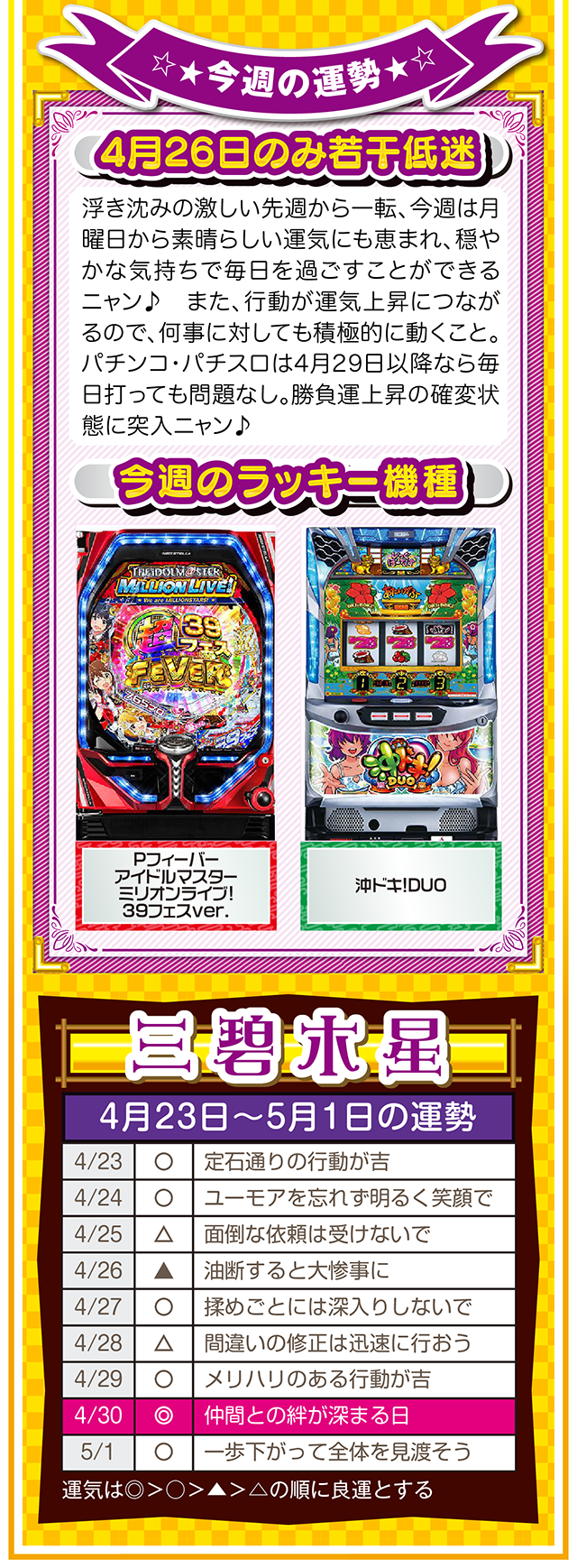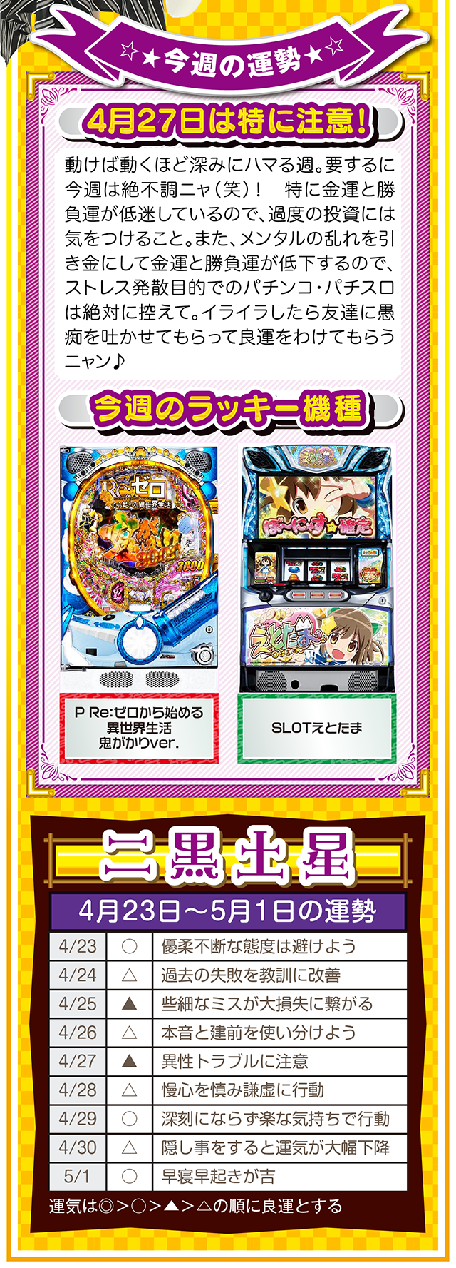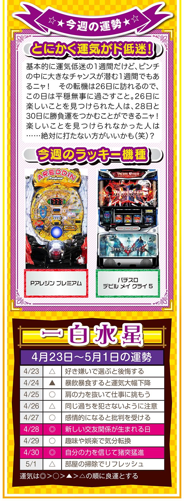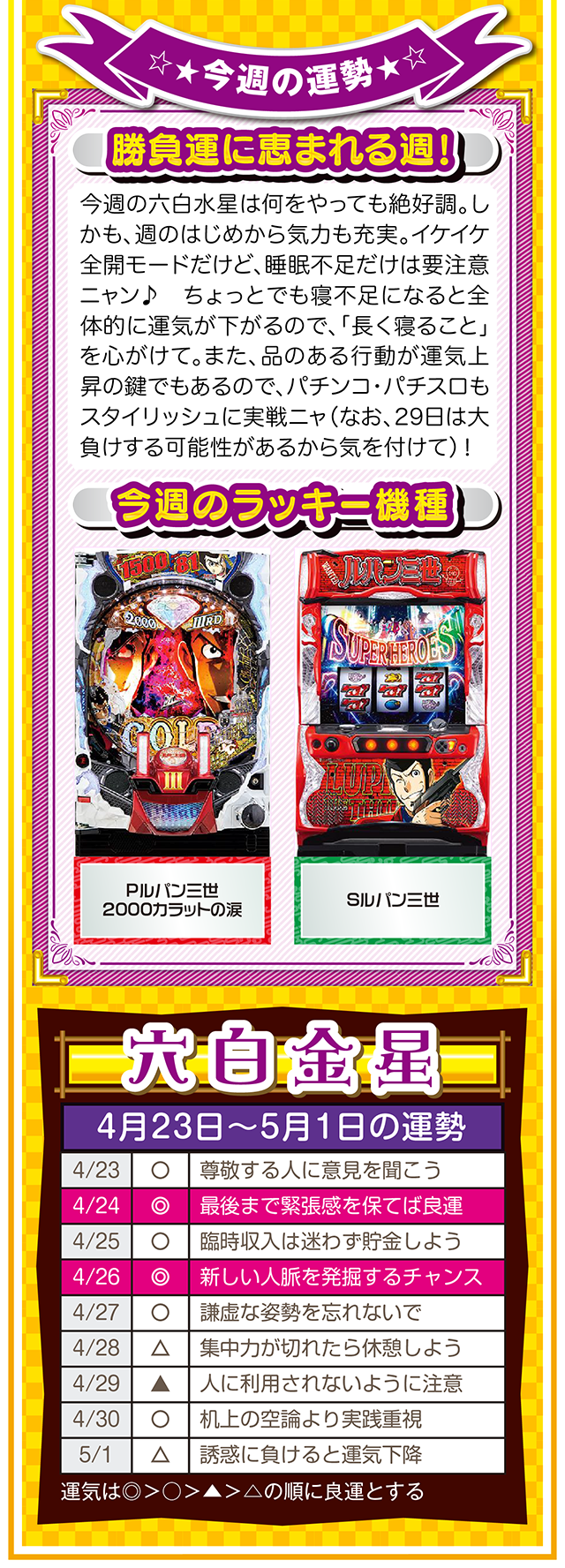 「成功する!」とポジティブな発言を繰り返すのは大事。でも、行動を起こさなければ成功をつかめないことを理解してほしいニャン♪ というわけで早速、4月25日から5月1日の1週間を鑑定ニャ(異性に対しては引っ込み思案のフォー・チュンチュンが、オマケとして4月23日と24日の運勢も鑑定したニャン♡)!