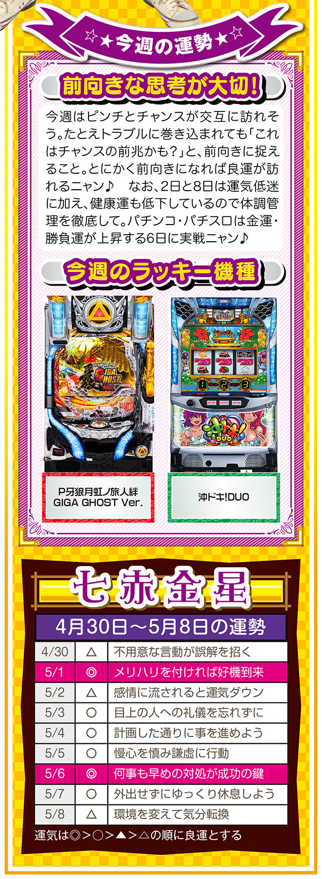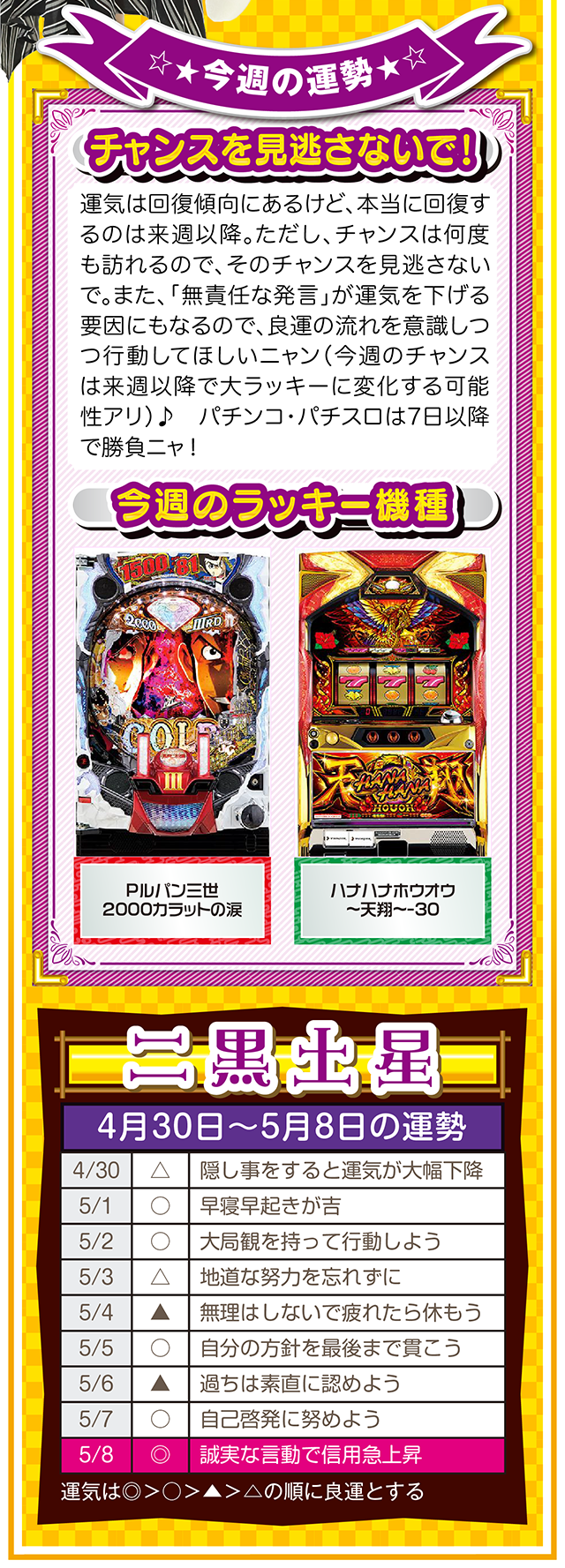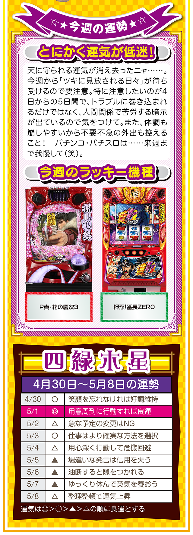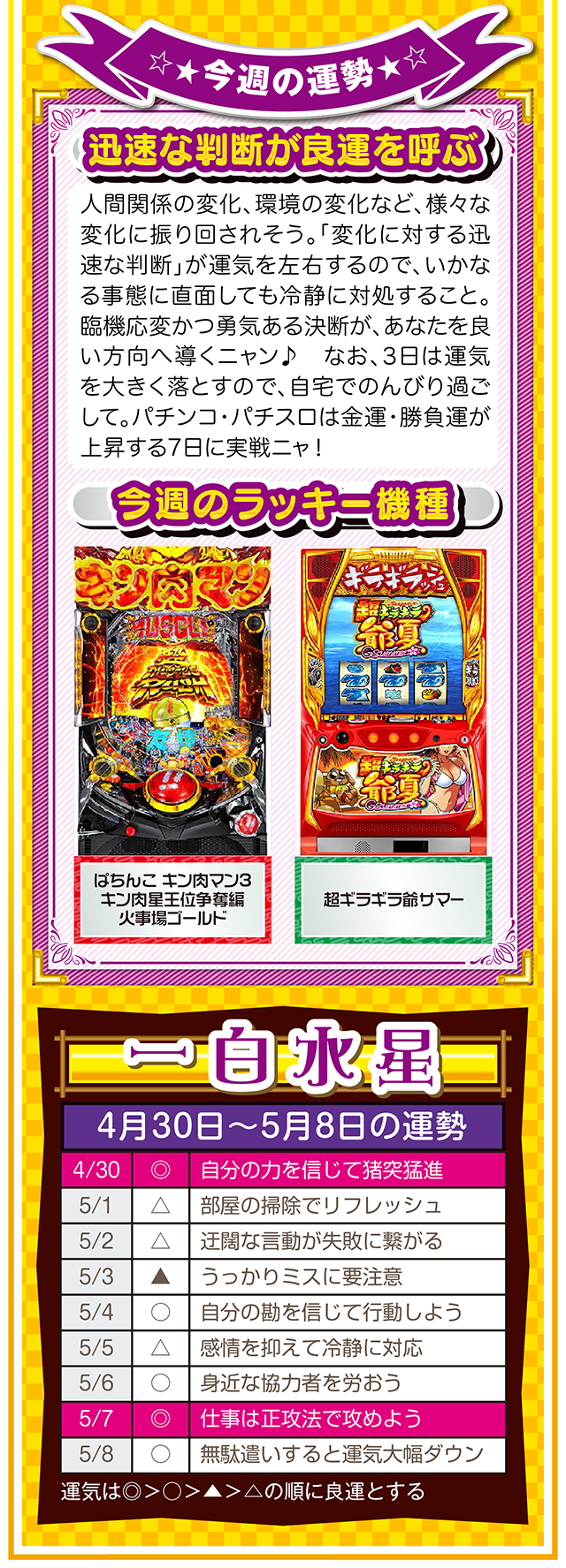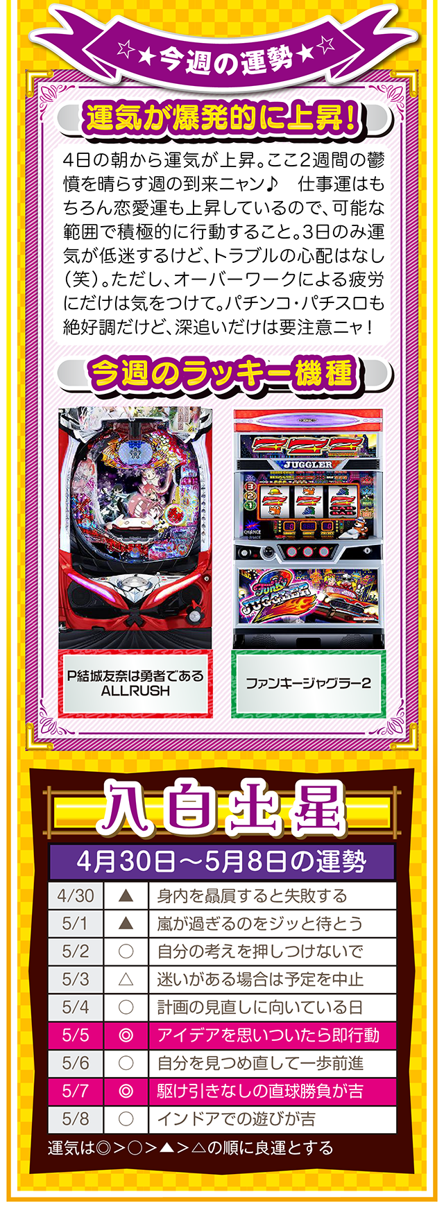活動気運にあるため、とにかくエネルギッシュに行動するニャン♪ 活動力に加えて閃きと先見の明も発揮されるので、直感を信じて動きまくるニャ! ただし、この運気をパチンコ・パチスロだけに使わないで(笑)。