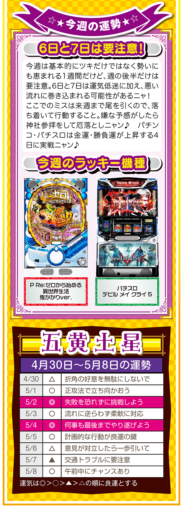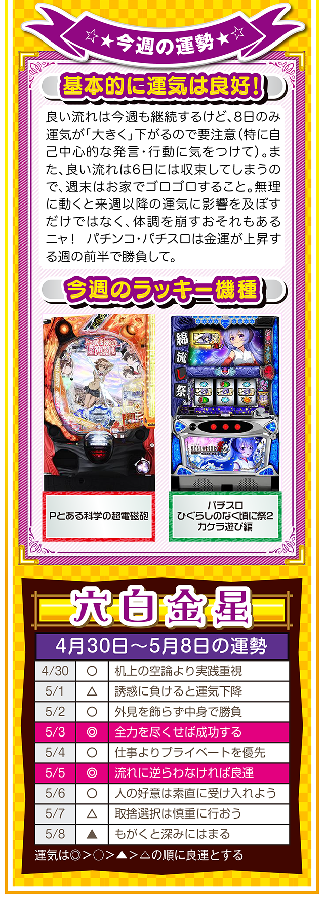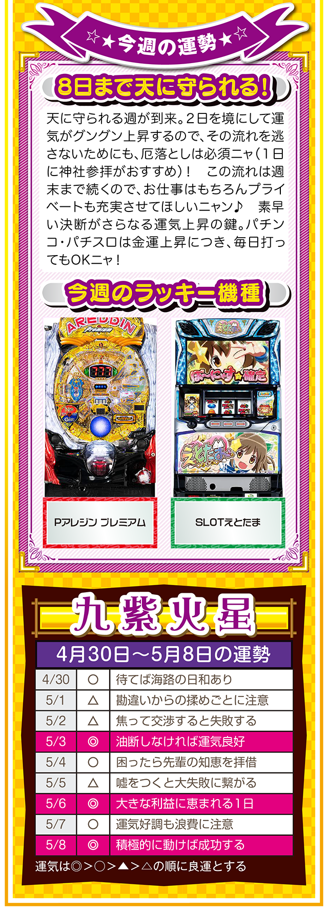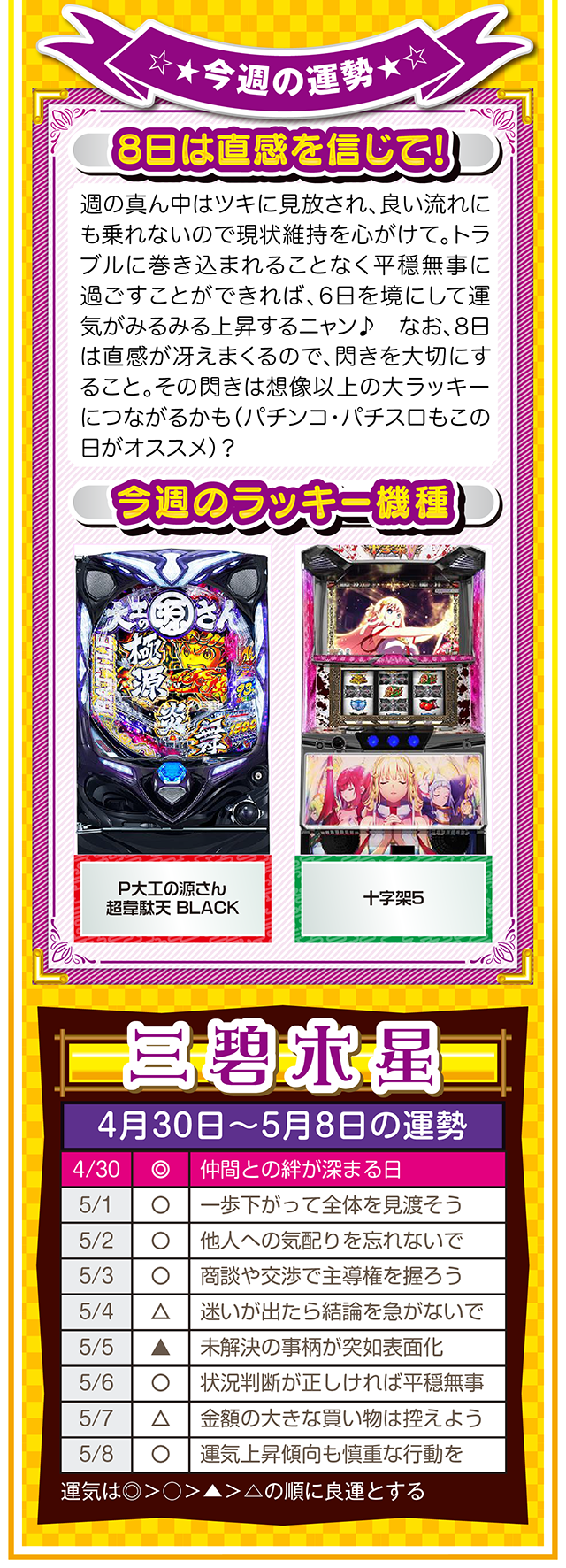 活動気運にあるため、とにかくエネルギッシュに行動するニャン♪ 活動力に加えて閃きと先見の明も発揮されるので、直感を信じて動きまくるニャ! ただし、この運気をパチンコ・パチスロだけに使わないで(笑)。