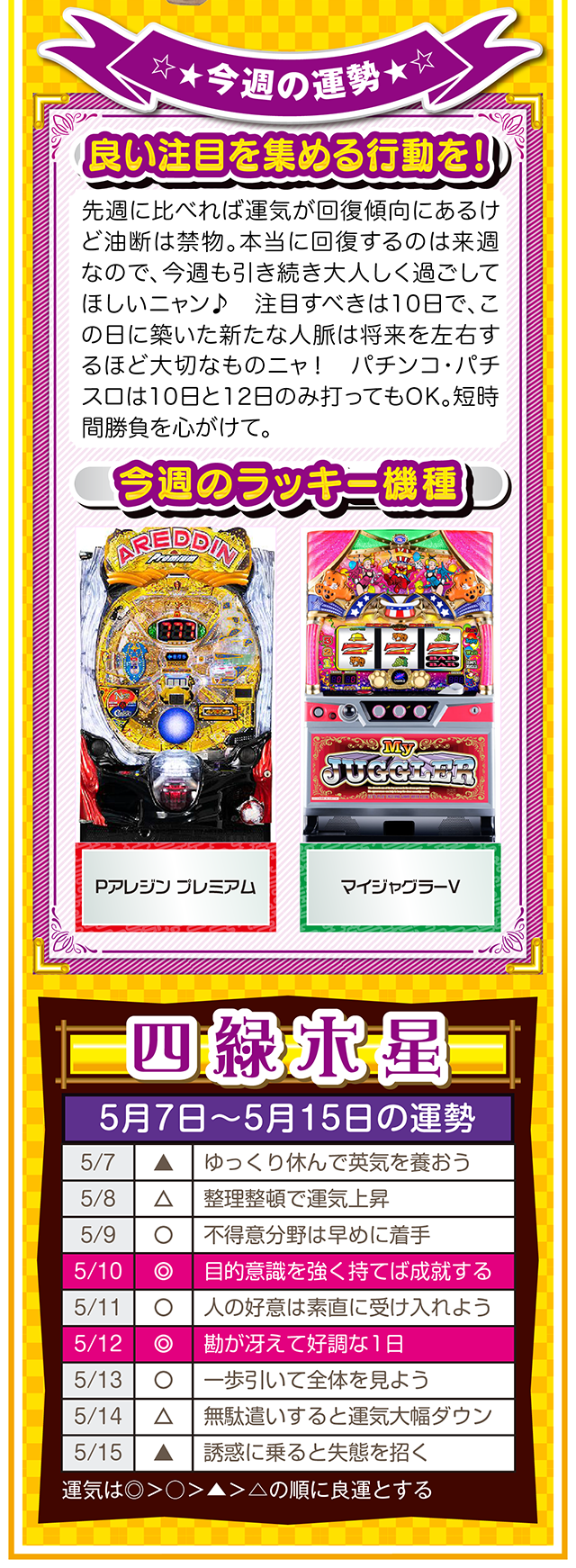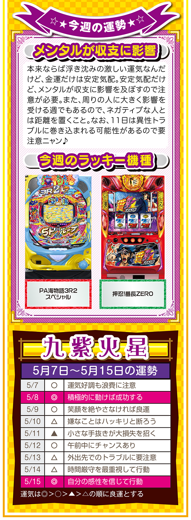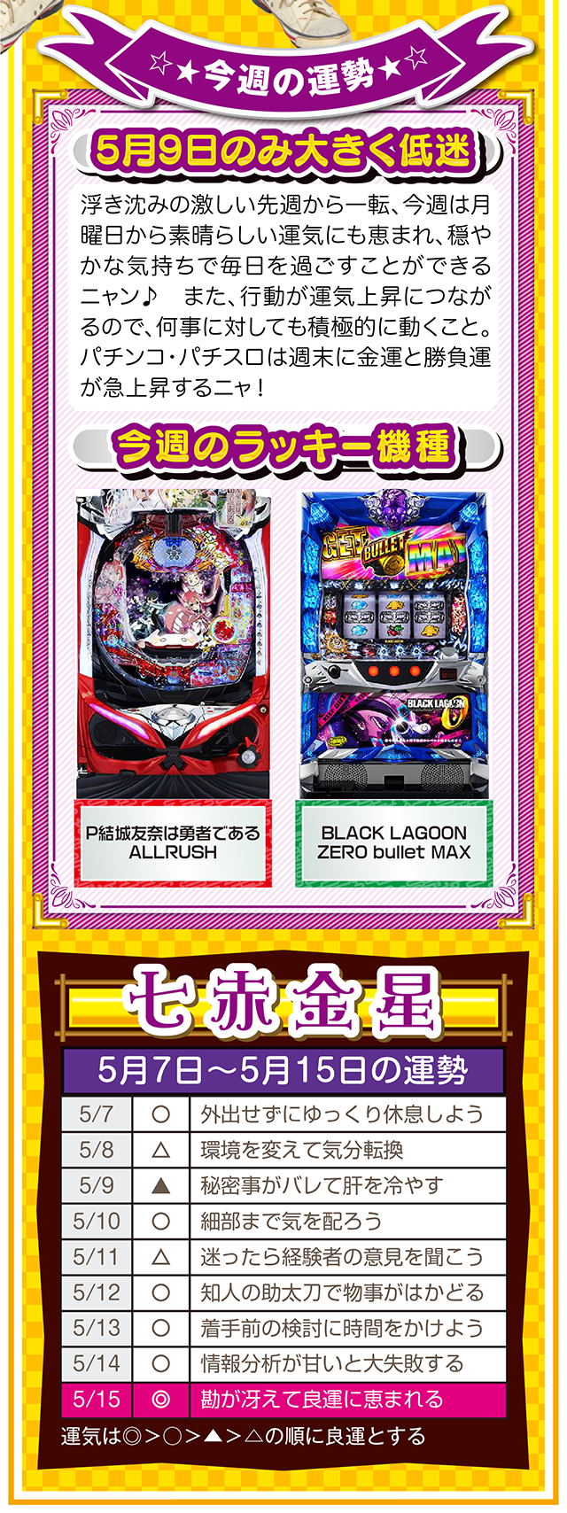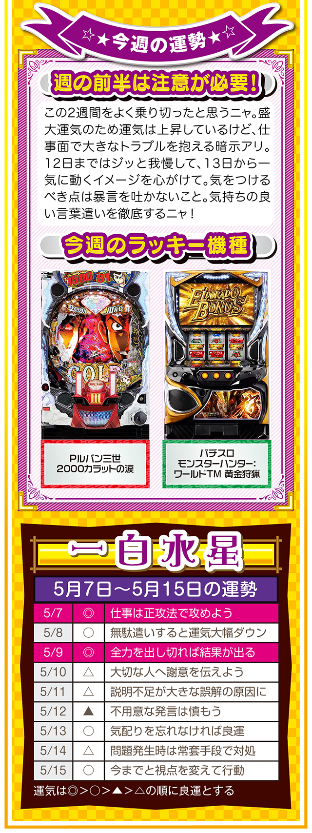 どんな成功者も挫折と敗北と屈辱の意味と意義を理解して、強く生きている。時には<逃げるが勝ち>も必要だけど、強く生きたいのなら逆境に立ち向かう気持ちも忘れないでほしいニャン♪ というわけで早速、5月9日から15日の1週間を鑑定ニャ(横浜DeNAベイスターズが相変わらずの定位置で、イライラ・ノンストップのフォー・チュンチュンが、オマケとして5月7日と8日の運勢も鑑定したニャン♡)!