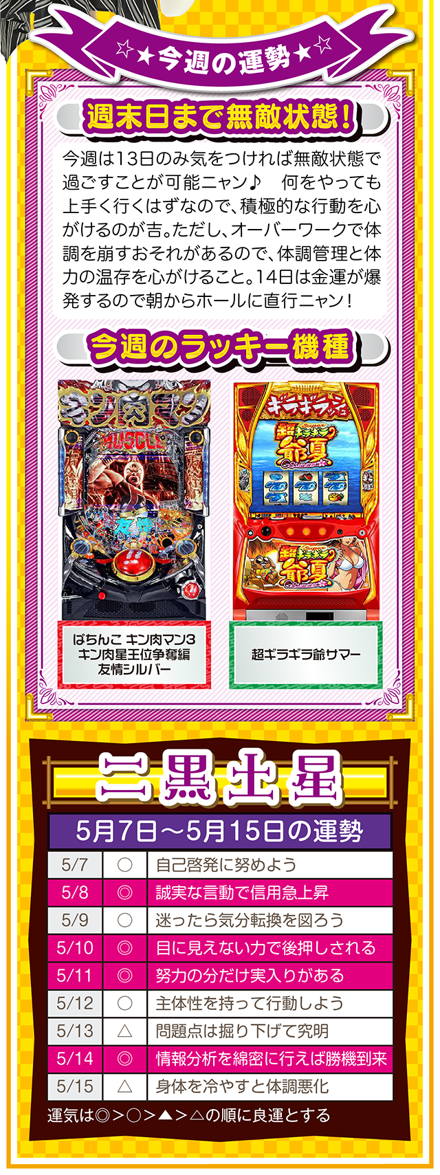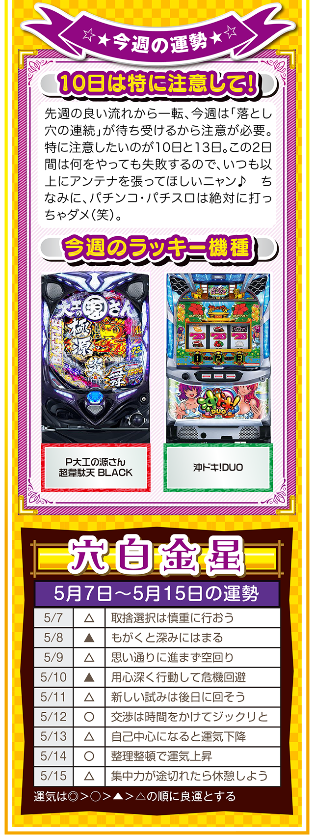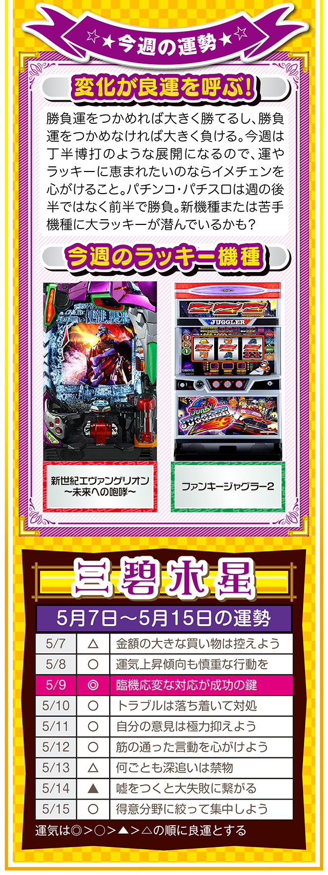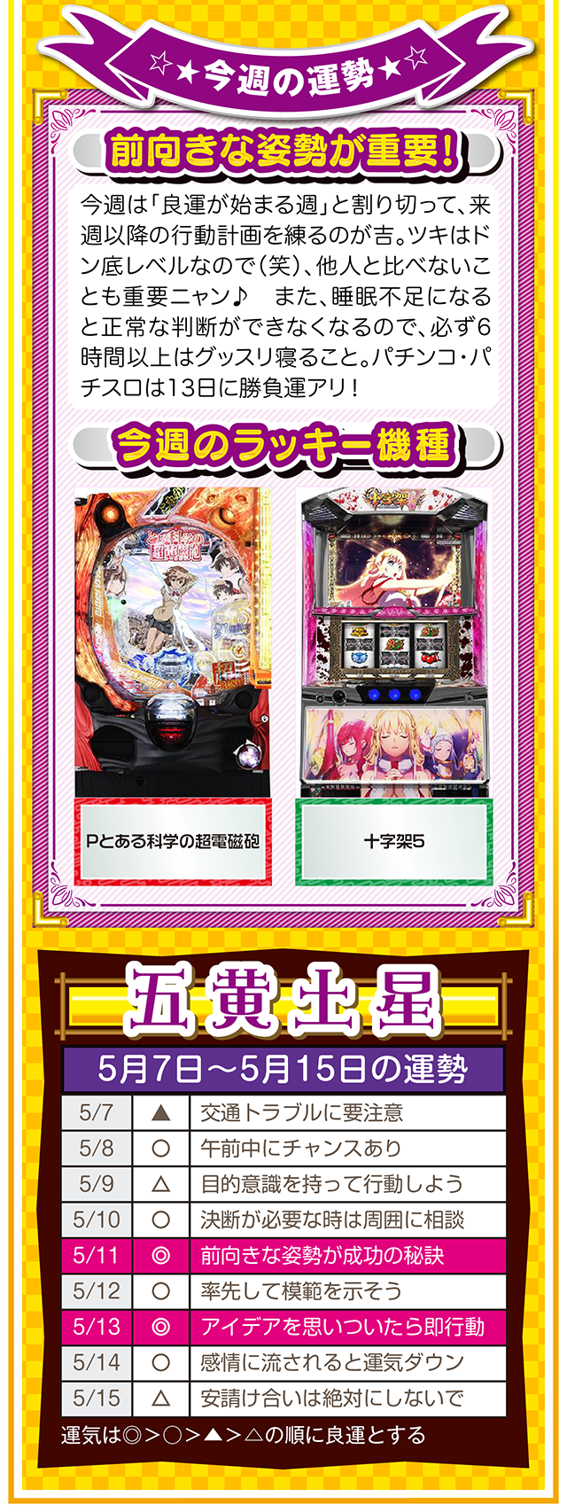 どんな成功者も挫折と敗北と屈辱の意味と意義を理解して、強く生きている。時には<逃げるが勝ち>も必要だけど、強く生きたいのなら逆境に立ち向かう気持ちも忘れないでほしいニャン♪ というわけで早速、5月9日から15日の1週間を鑑定ニャ(横浜DeNAベイスターズが相変わらずの定位置で、イライラ・ノンストップのフォー・チュンチュンが、オマケとして5月7日と8日の運勢も鑑定したニャン♡)!