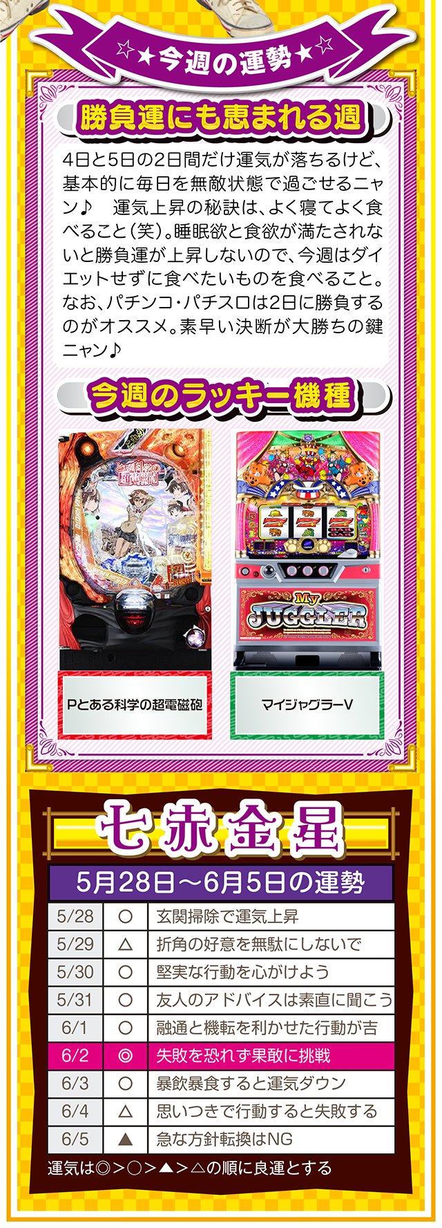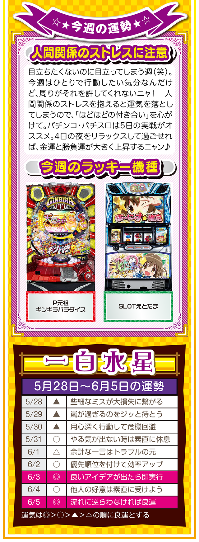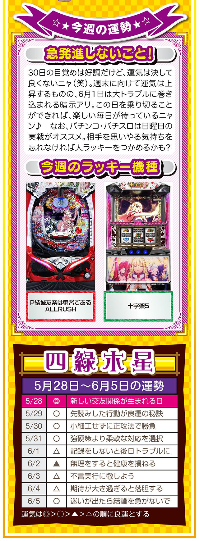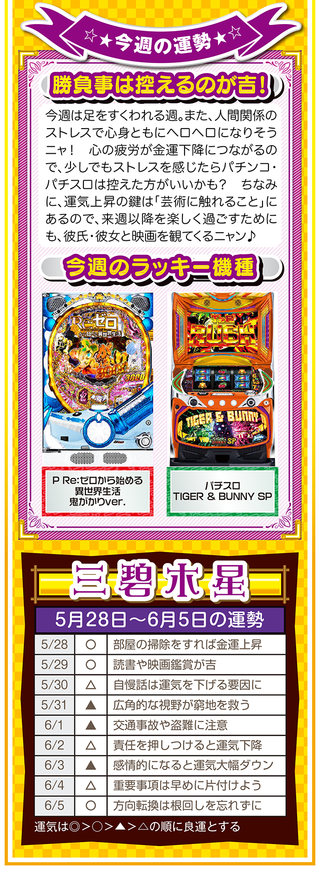 6月は梅雨の季節。願いを叶えたくても、気分がドンヨリとしがちなので(笑)、その願いと寄り添う意味と意義を考えてみて。ポジティブ発言があなた自身を救ってくれるニャン♪ というわけで早速、5月30日から6月5日の1週間を鑑定ニャ(『白馬に乗った王子様、まだ?』と煩悩の数だけ口にするフォー・チュンチュンが、オマケとして5月28日と29日の運勢も鑑定したニャン♡)!