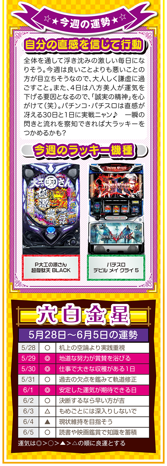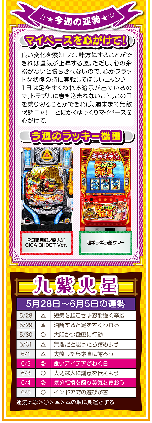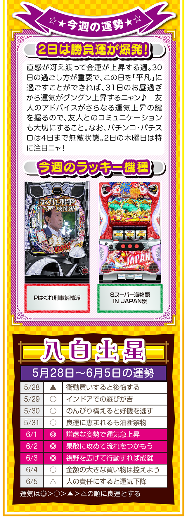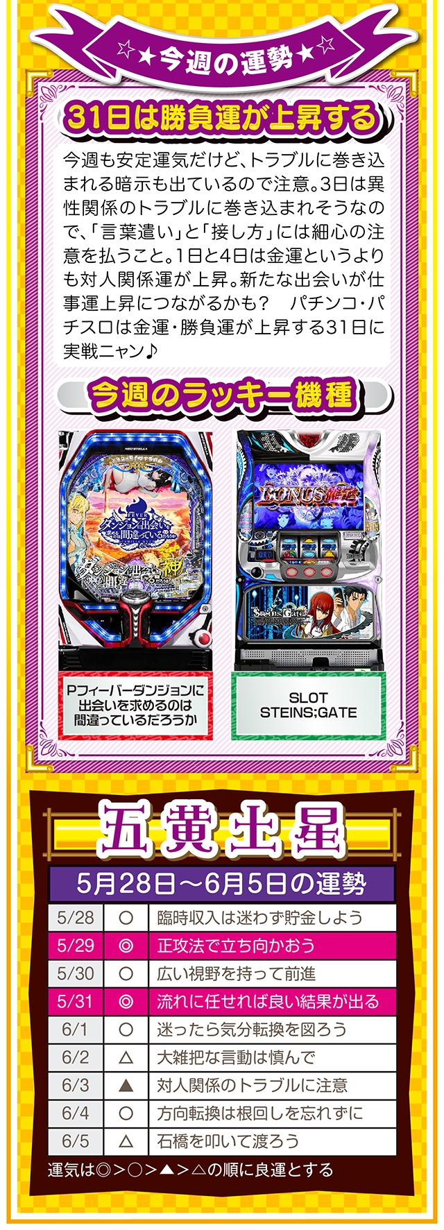 6月は梅雨の季節。願いを叶えたくても、気分がドンヨリとしがちなので(笑)、その願いと寄り添う意味と意義を考えてみて。ポジティブ発言があなた自身を救ってくれるニャン♪ というわけで早速、5月30日から6月5日の1週間を鑑定ニャ(『白馬に乗った王子様、まだ?』と煩悩の数だけ口にするフォー・チュンチュンが、オマケとして5月28日と29日の運勢も鑑定したニャン♡)!