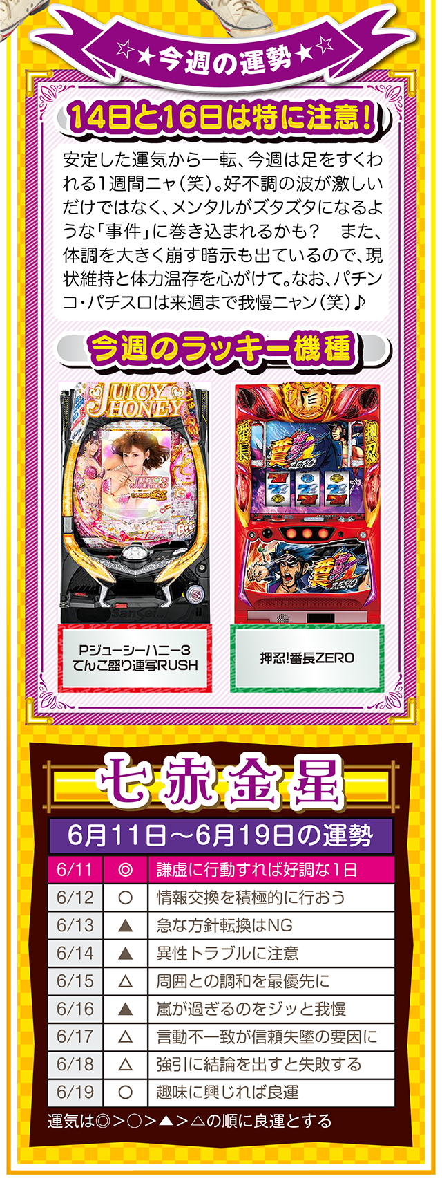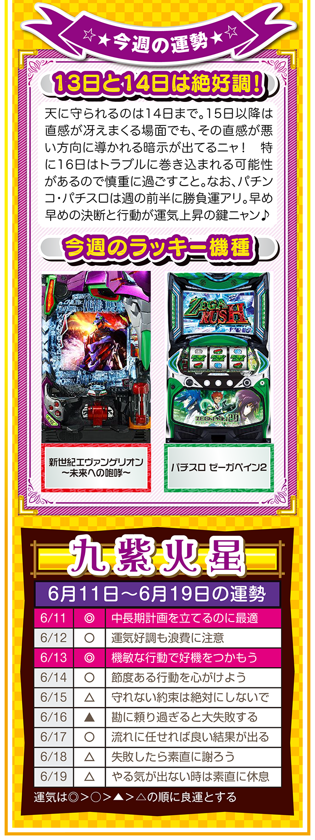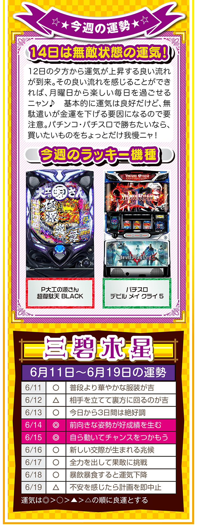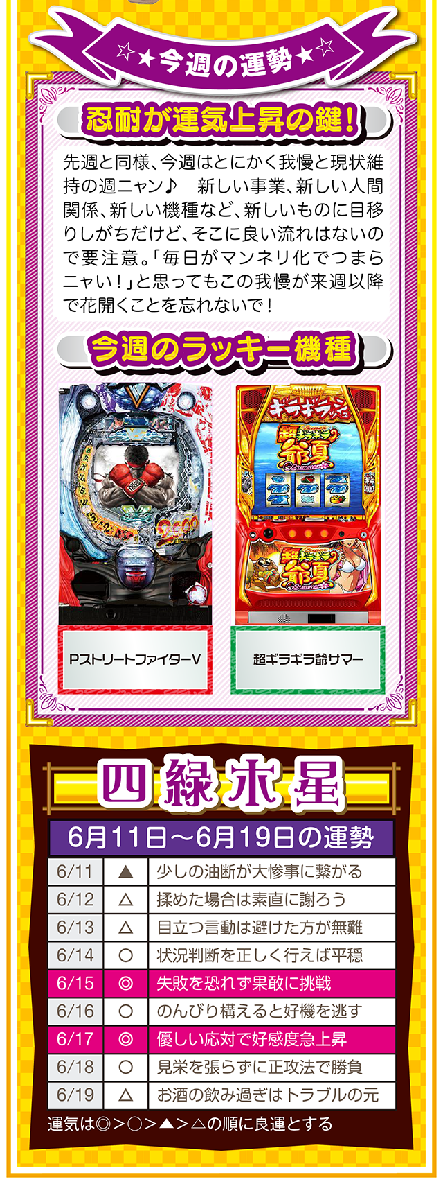 現状に満足できない人は、命懸けの意味を理解した方がいい。時間ではなく、命を削って生きる。そして、命懸けの人に、運とかツキが味方することも覚えておいてほしいニャ! というわけで早速、6月13日から19日の1週間を鑑定ニャン(命懸けの婚活が全く実を結ばないフォー・チュンチュンが、オマケとして11日と12日の運勢も鑑定したニャ!)♪