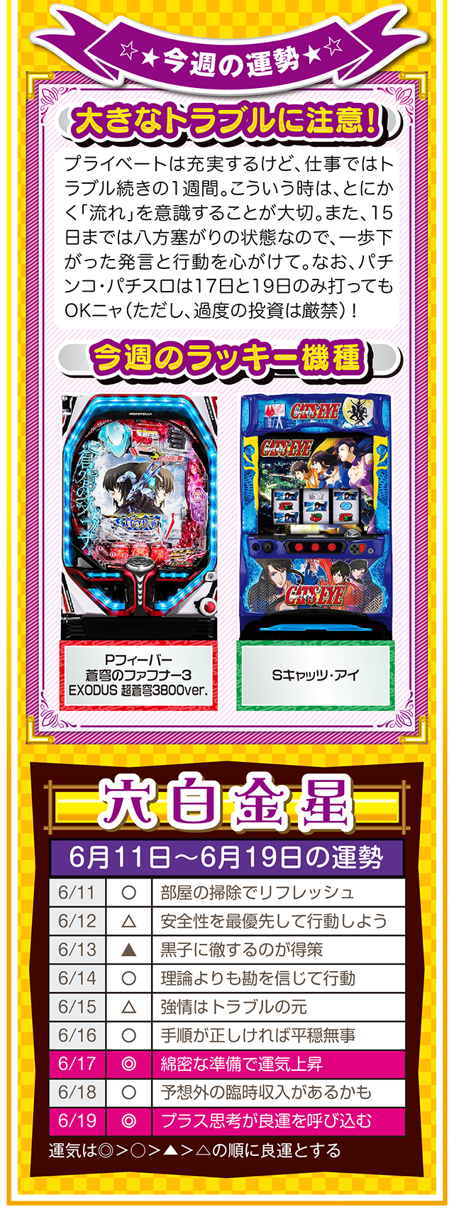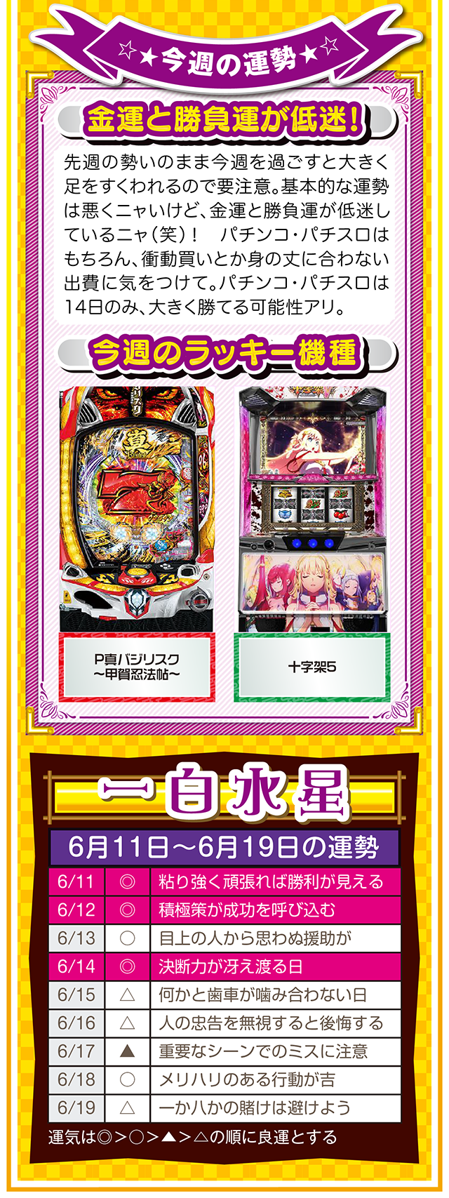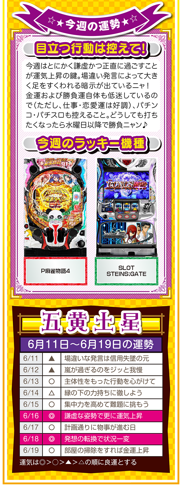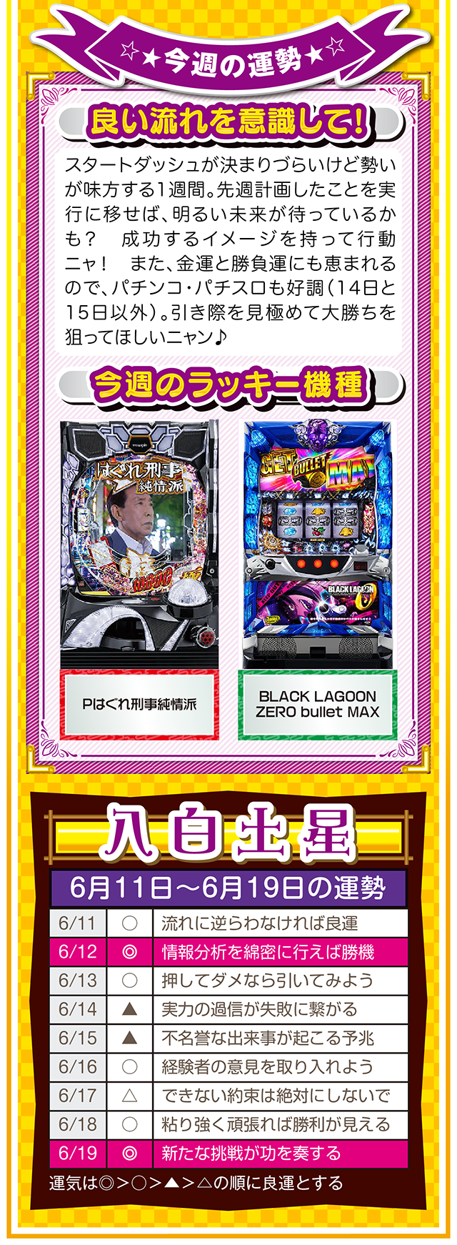 現状に満足できない人は、命懸けの意味を理解した方がいい。時間ではなく、命を削って生きる。そして、命懸けの人に、運とかツキが味方することも覚えておいてほしいニャ! というわけで早速、6月13日から19日の1週間を鑑定ニャン(命懸けの婚活が全く実を結ばないフォー・チュンチュンが、オマケとして11日と12日の運勢も鑑定したニャ!)♪