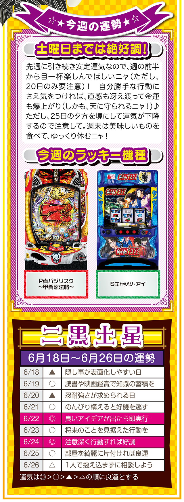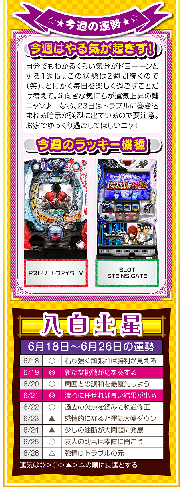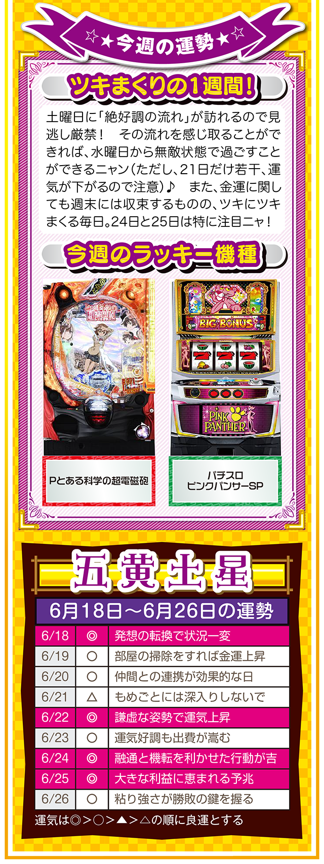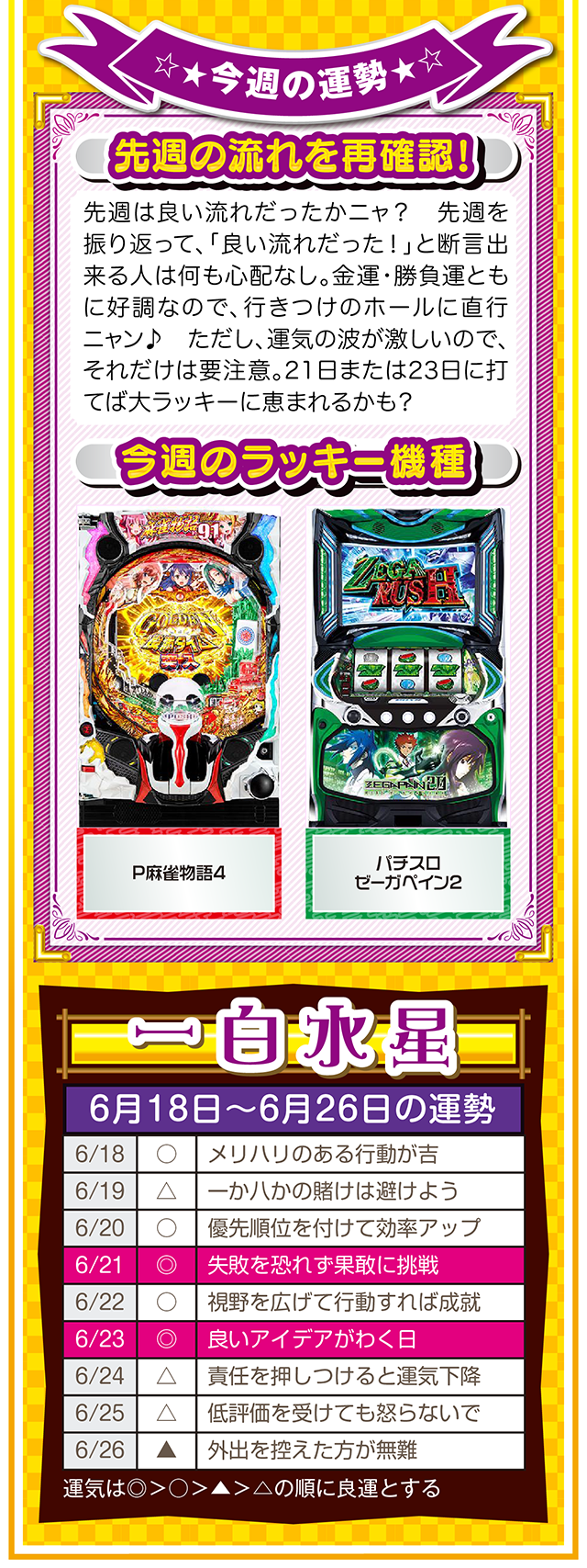 興味は出会いだけではなく、恋愛&人間関係運も運んでくる。その前段階として、体力、気力の充実が、出会いの礎になることも覚えておいてほしいニャ! というわけで早速、6月20日から26日の1週間を鑑定ニャン(自分の書いた原稿に「なるほど!」と感心したフォー・チュンチュンが、オマケとして18日と19日の運勢も鑑定したニャン♡)♪