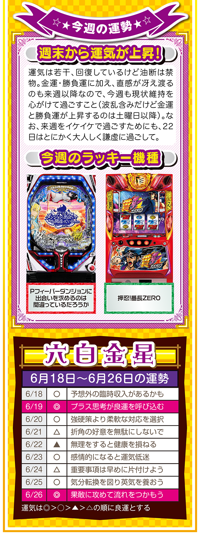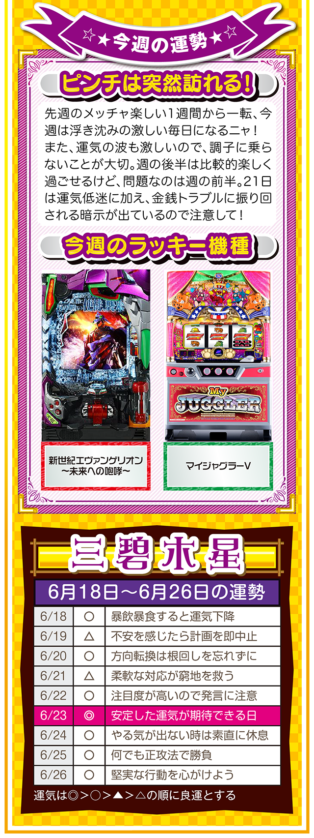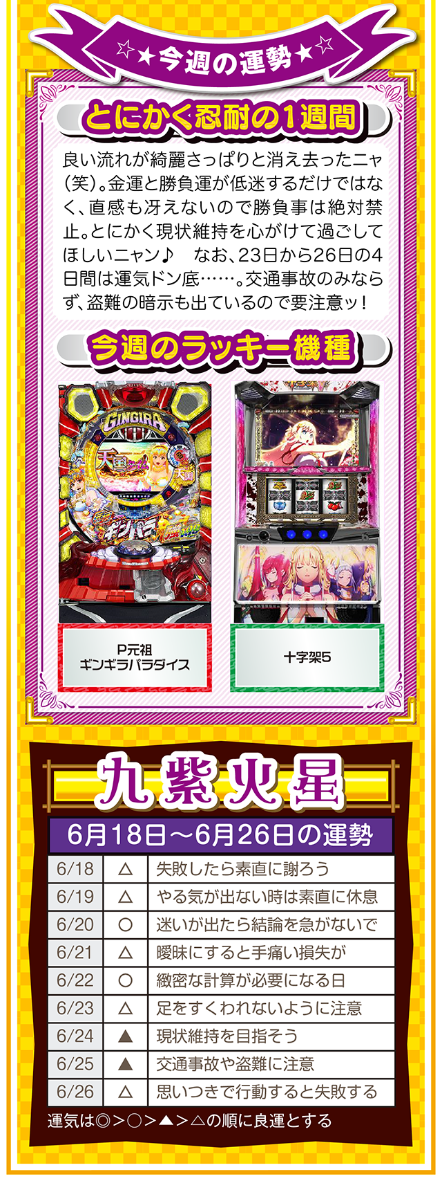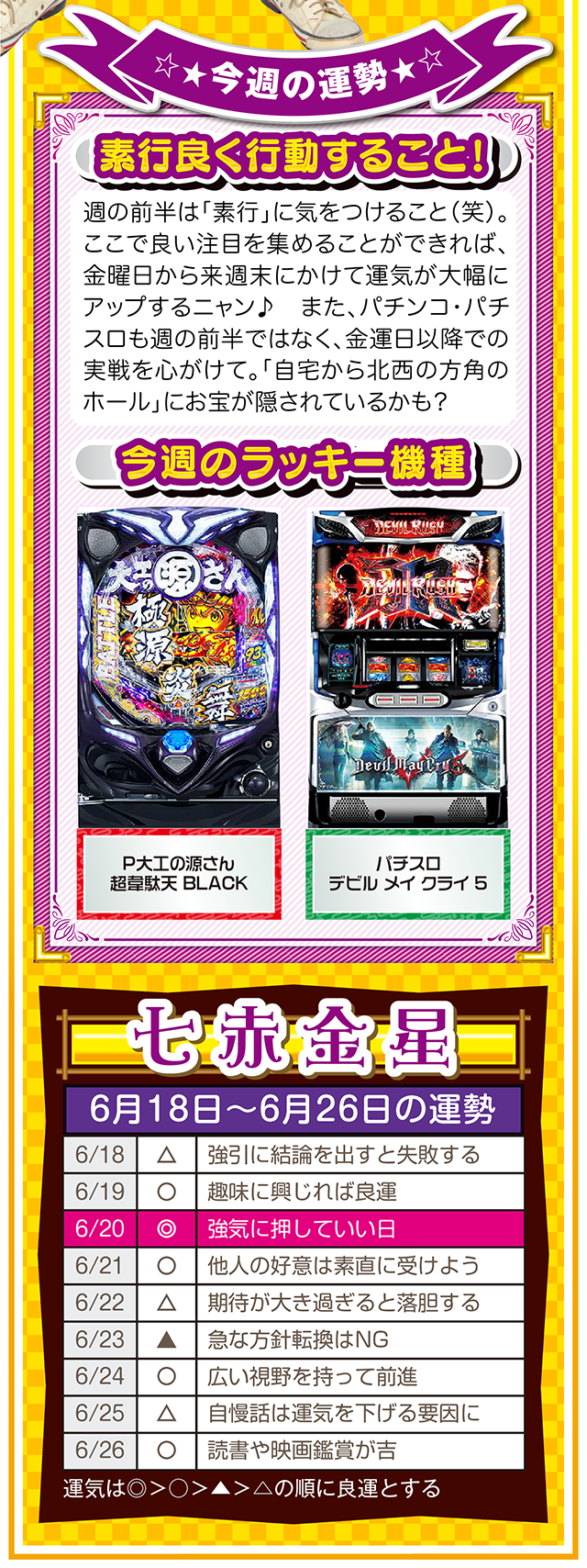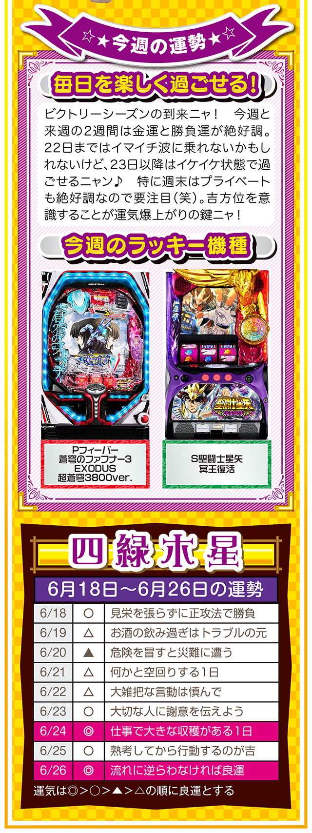 興味は出会いだけではなく、恋愛&人間関係運も運んでくる。その前段階として、体力、気力の充実が、出会いの礎になることも覚えておいてほしいニャ! というわけで早速、6月20日から26日の1週間を鑑定ニャン(自分の書いた原稿に「なるほど!」と感心したフォー・チュンチュンが、オマケとして18日と19日の運勢も鑑定したニャン♡)♪