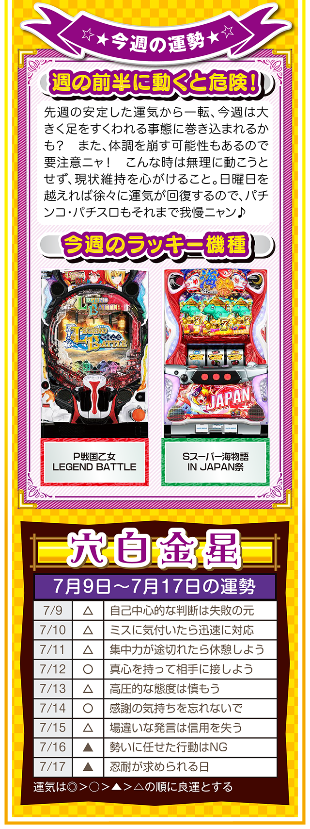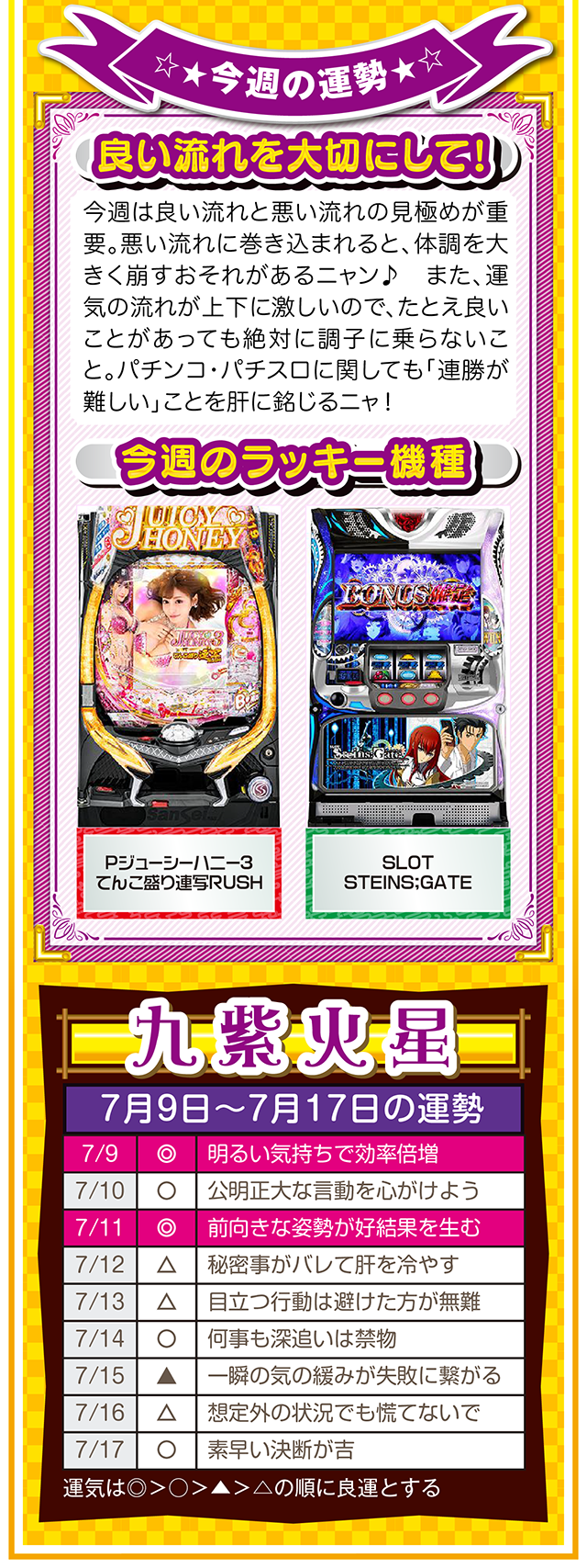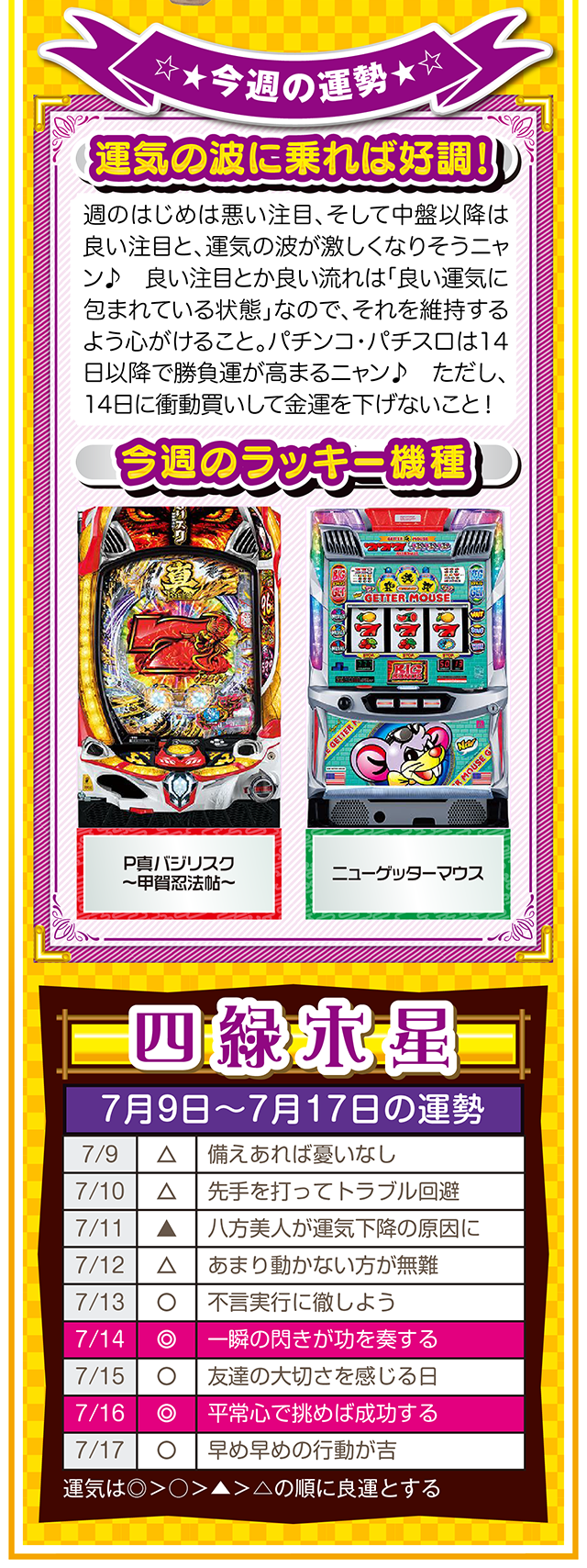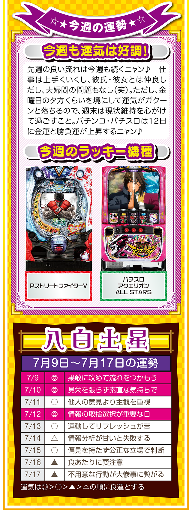 ラッキーパンチで成功する人はひと握りニャン(笑)? だから、成功者を羨む前に、もっと成功者のことを想像してほしいニャ! というわけで早速、7月11日から7月17日の1週間を鑑定ニャン(鬼のような時間を婚活に捧げているのに全く結果が出ないフォー・チュンチュンが、オマケとして9日と10日の運勢も鑑定したニャン♡)♪