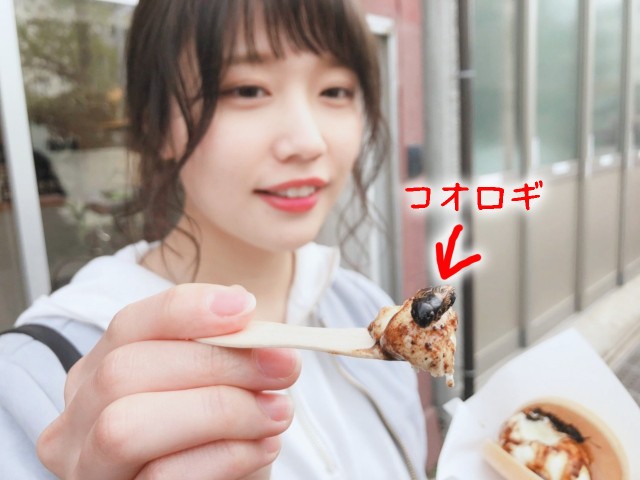 バニラアイスにコオロギをトッピングし、コオロギの粉を混ぜ込んだしょうゆ味のタレをかけて、最中に挟んだという逸品。