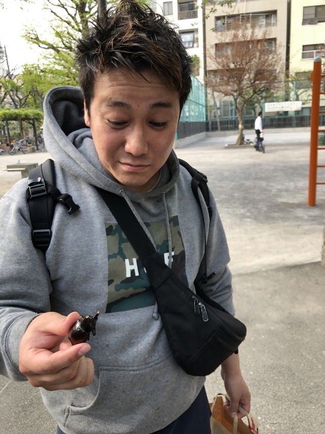 公園で捕まえたのをガブッといっているようにも見えますね。
