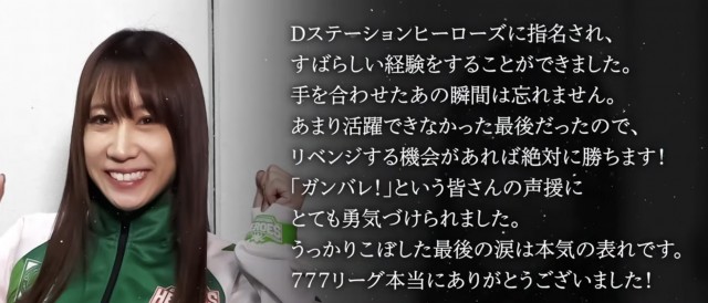 動画の最後にメッセージが流れましたが、何人かの方はプレミア配信中に気づいていましたね。縦読みで「Dステありがとう」のメッセージも込めてました。これは私を元優勝チームのルーキーとしてドラフト指名してくださったDステーションとチームの皆さんへありがとう。全国のDステーションに来店して、たくさんの方と出会えたことへありがとう。777リーグを通して、私を知り応援してくださった方へありがとう。が込められています。2ndシーズンももう間も無く閉幕となりますが、最後までお楽しみくださいm(_ _)m