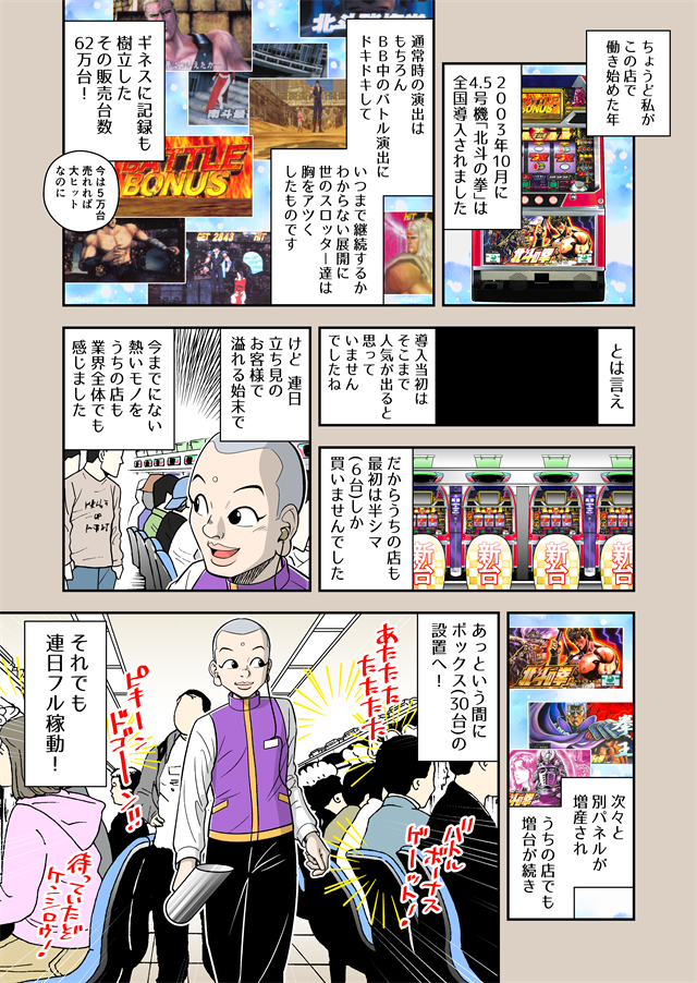 当時、サミーの機種としては先に導入された『キングキャメル』がパッとしなかったし、『北斗の拳』にそこまで期待していなかったのですが、導入初週に「コイツはヤベーな」と感じるほど、立ち見の立ち見の立ち見があったのが印象深いですね(今では立ち見はお断りしますが、当時は放置していました)。