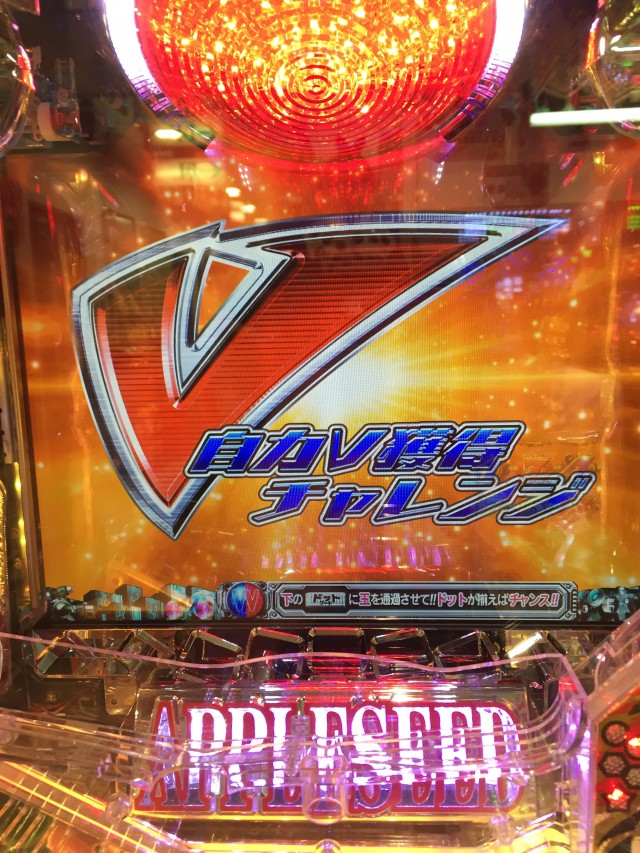 まずはヘソの部分に注目、Wスタートとなっていますがこれはヘソとスルーが同時に受けれるものになっています。APPLESEEDは1種2種混合タイプなのですが、図柄当たりの抽選とは別に電サポ解放からの自力V獲得チャレンジの抽選を行っています。