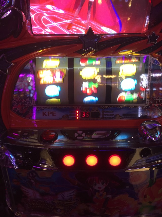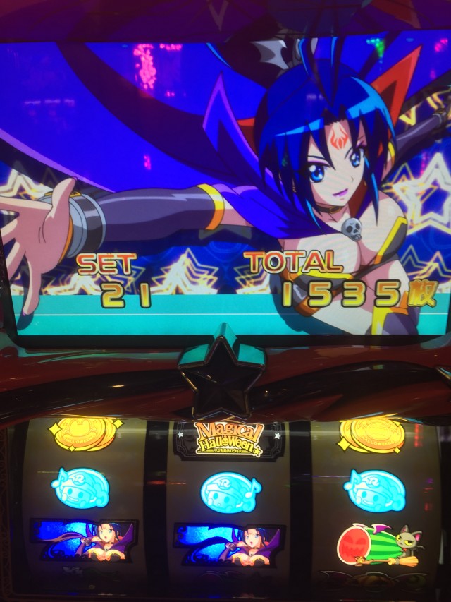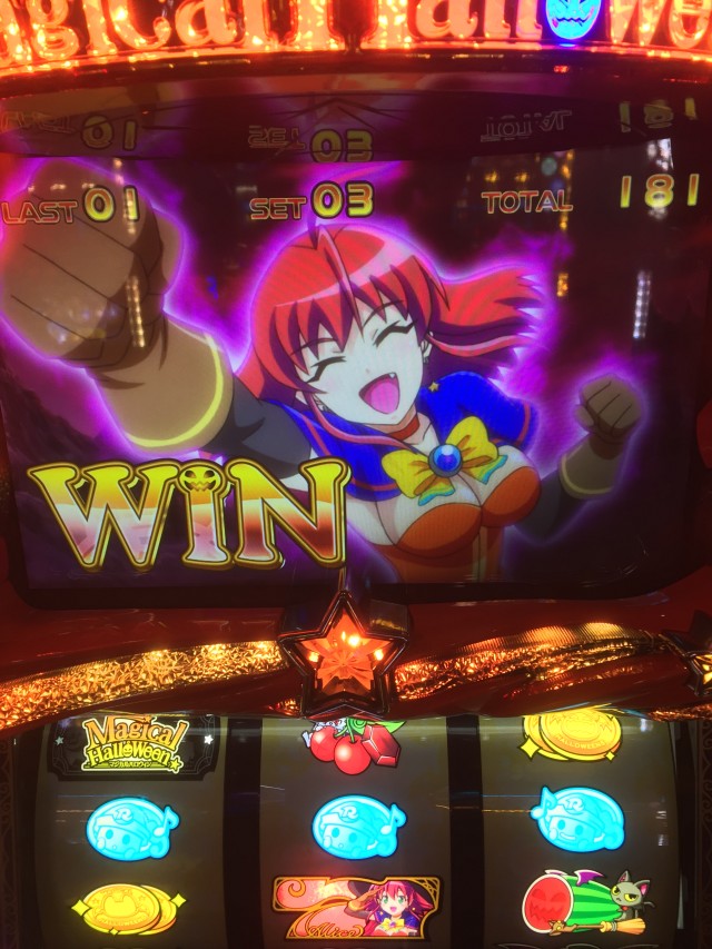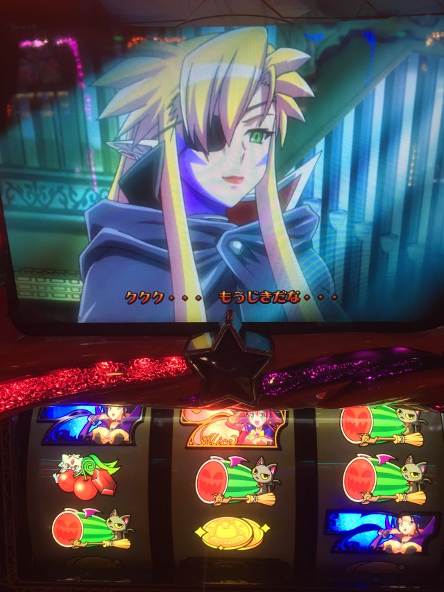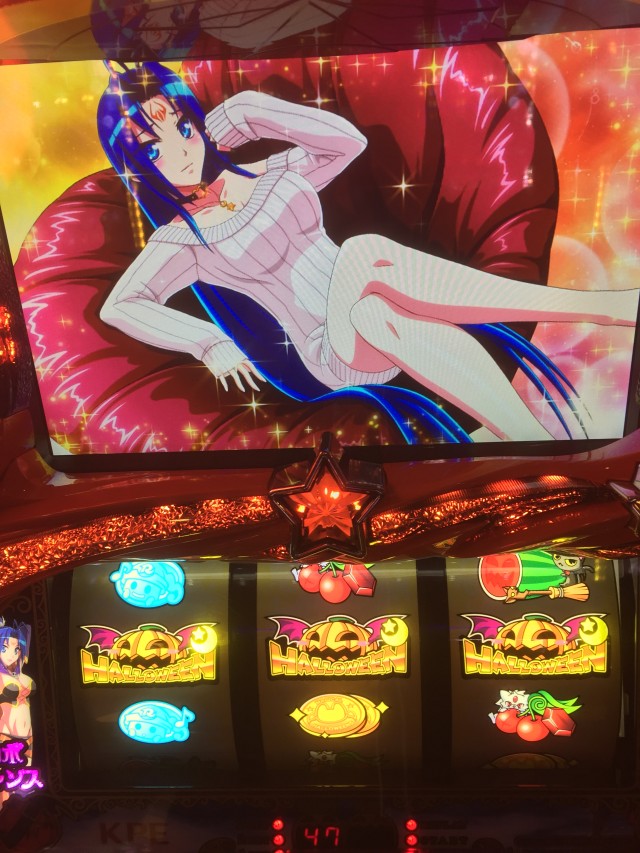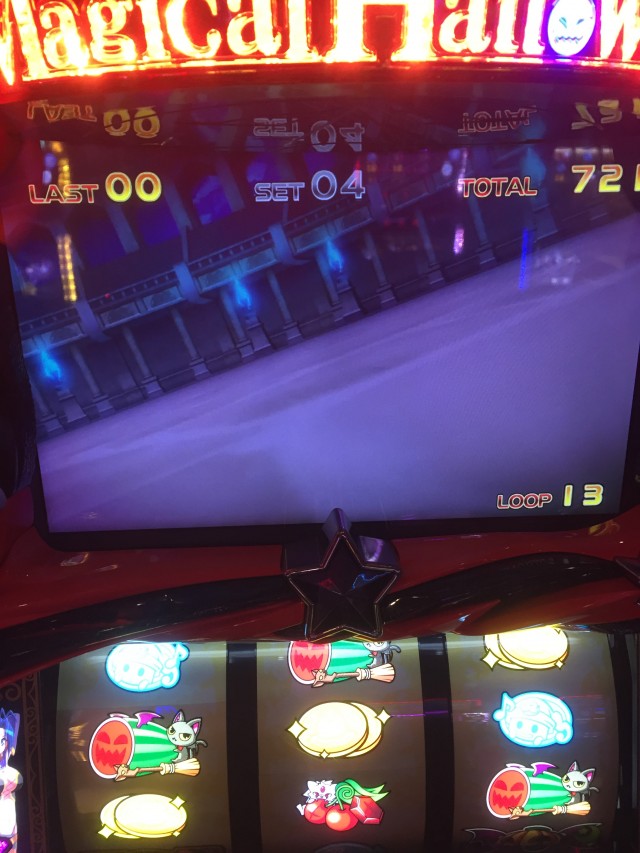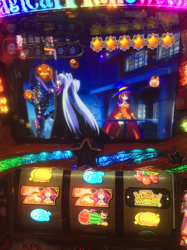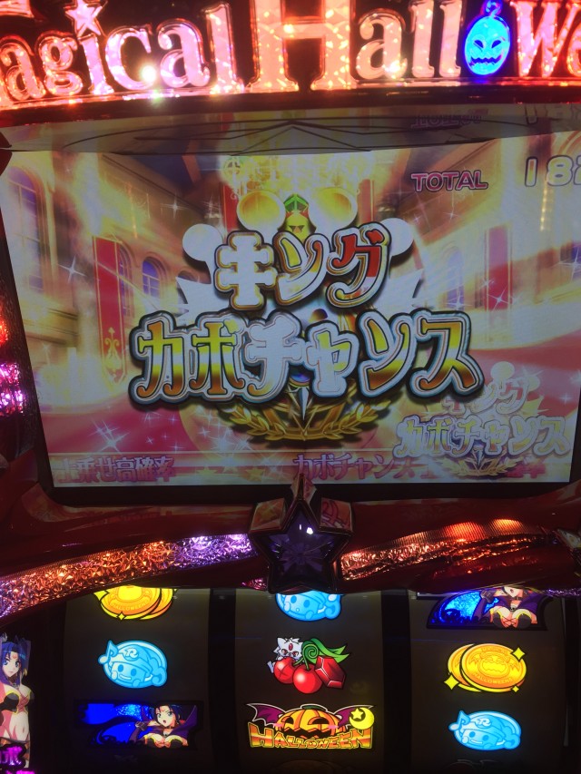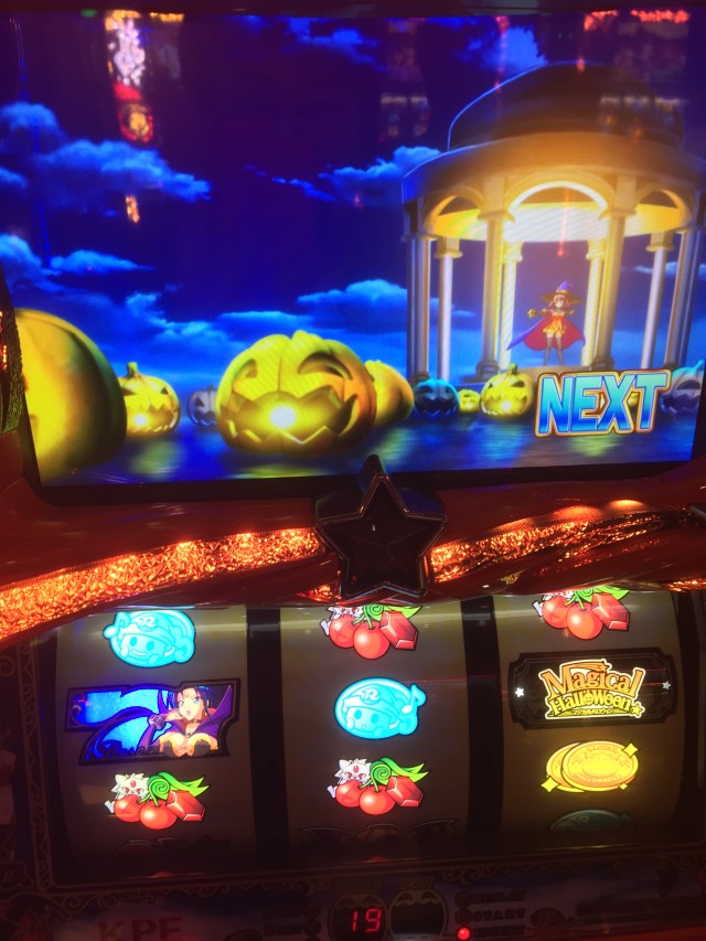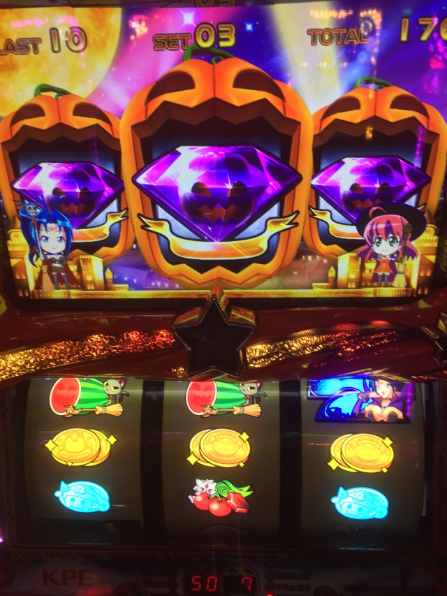 逆押しで押した場合上段青7からの中段コイン揃いは共通コイン、ですが液晶のカボチャはダイヤを咥えてます。本来ダイヤはレア役対応の演出なのでもしかしたらと思っていたら・・・