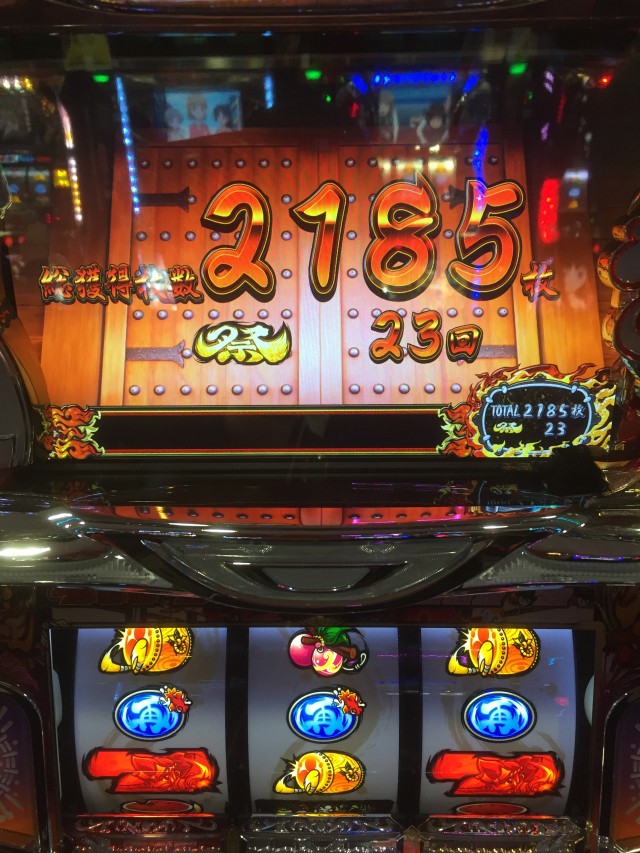 ガツっと23連し一撃2180枚獲得できました!純増1枚でもボーナス絡めば早いですからね。RBもART中だと全ナビなので104枚とれますし増加スピードがえらい早くなります!