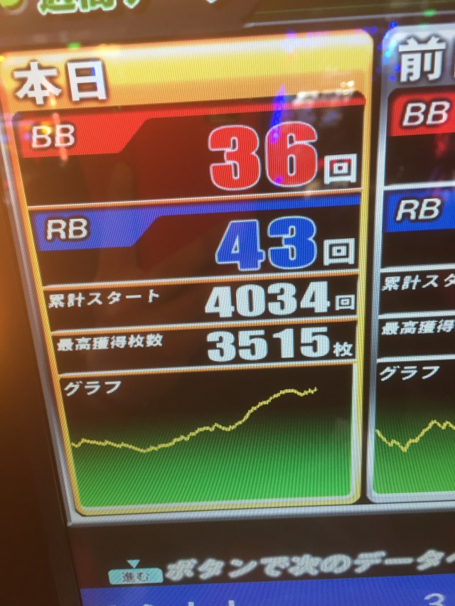 さて、まつりば!ですがおそらく高設定・・・更にはボーナスの色がモロ偶数なので予想は設定4or6という所で落ち着きました!小役関連が若干弱いのとバチ確目は結局1度のみ、6!と言い切りたいのですけどね。