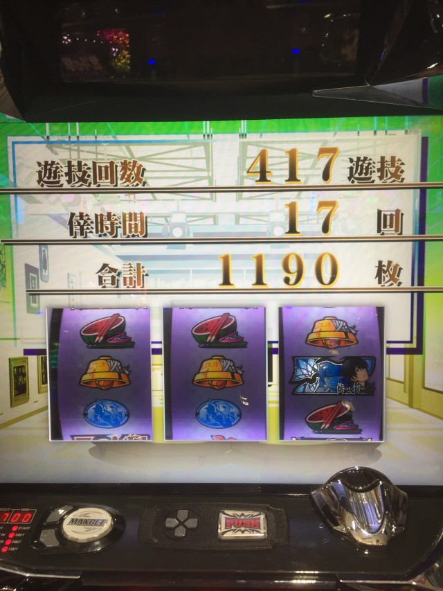 これ絶対中段スイカおかしいですね、もし数回中段だったとしたら右下がりスイカも悪くなる・・・そして画面は奇数よりなため予想は設定3or5