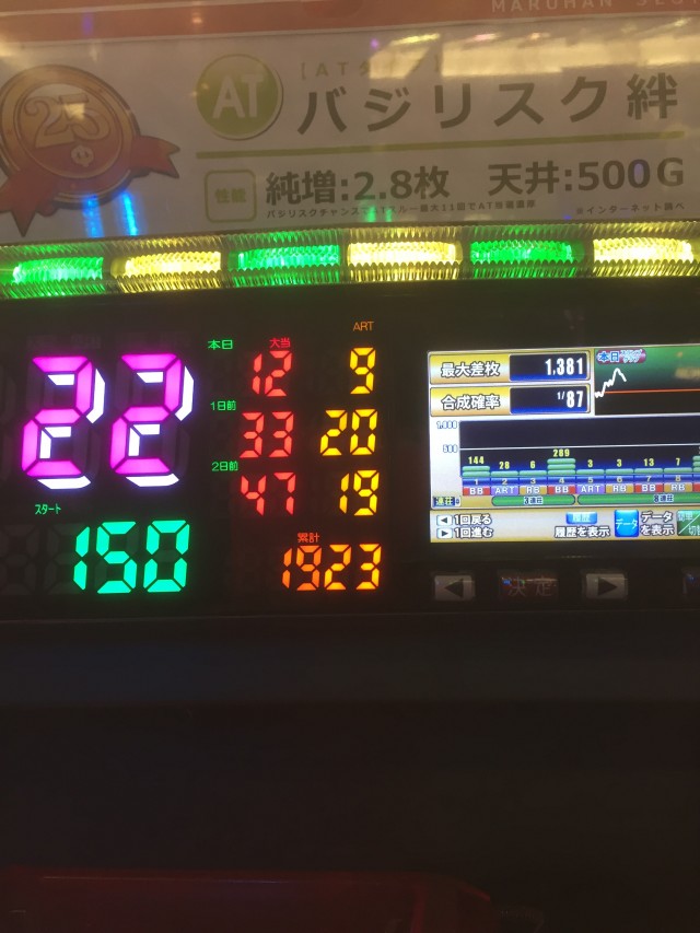 お昼からの稼動ですので、朝一の稼動ではないので空いているデータを見ながら台を選択していき気になったのはバジ絆(またか)のこんなデータ