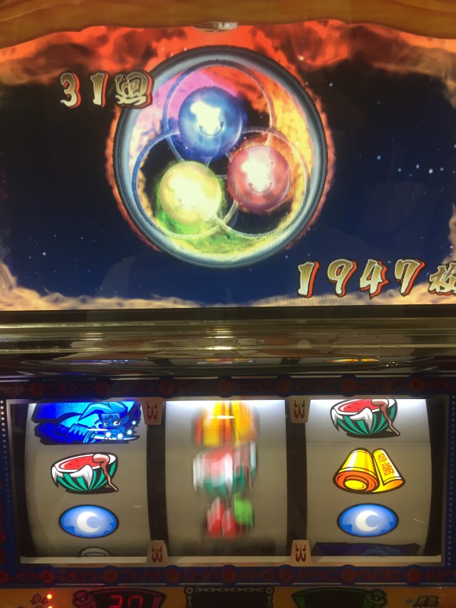 目押しをミスったくさいとあやふやなまま中にチェリー止めちゃってからの写メなので20点ですね、青異色とチェリー同時当選はしっかりとしとりました
