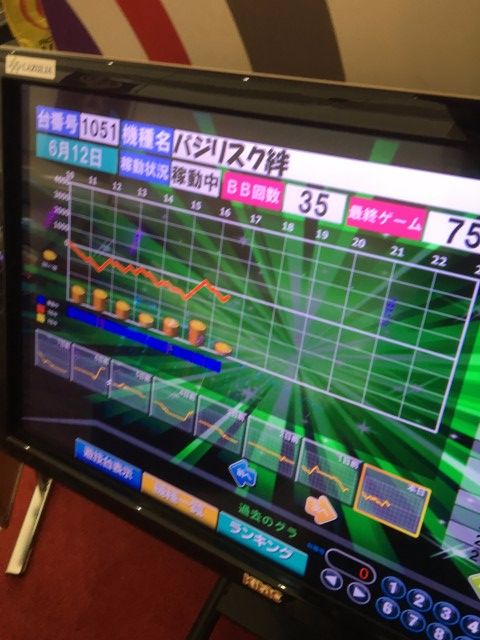 16時頃のグラフなのでまだぱっとしませんがバジ絆が朝から人が変わらず粘られている台がありまして、履歴的にも序盤にきついのありましたがそれ以外は3スルー付近で入っている感じでしたね
