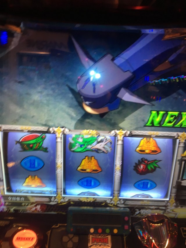 次Gも中段チェリー狙うのもいいんですが、それだと青HBBだった場合1G遅くなりつつガッカリとなってしまうのでここは左リール中段に白バーをビタ押し!