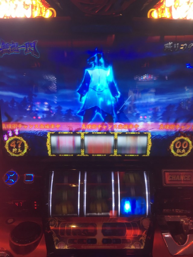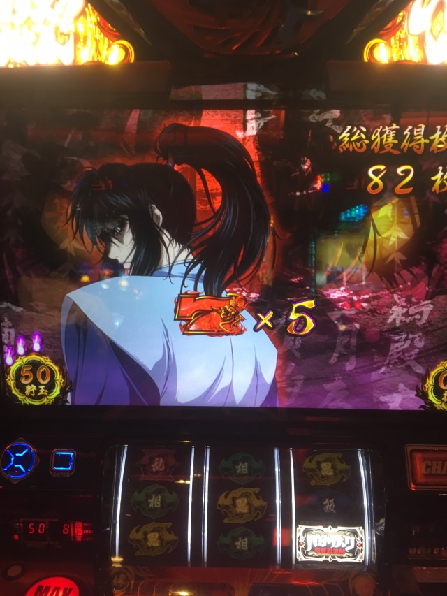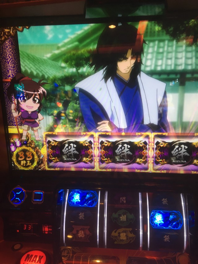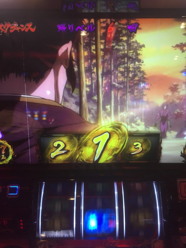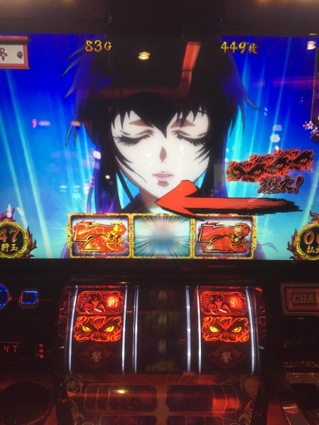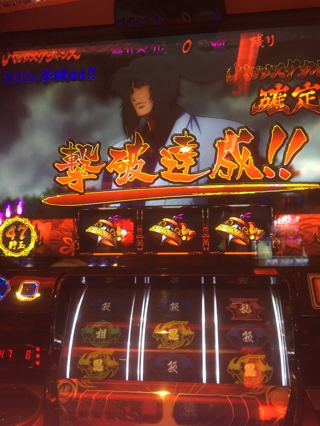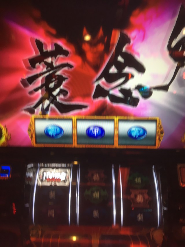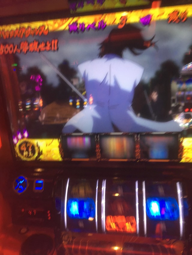 これの当たりが弱チェリーなのですが、当たり方が変だったのでパネル消灯しそうだなーと思いカメラを起動しながらレバーを叩いたら本当に無双一閃でしたw