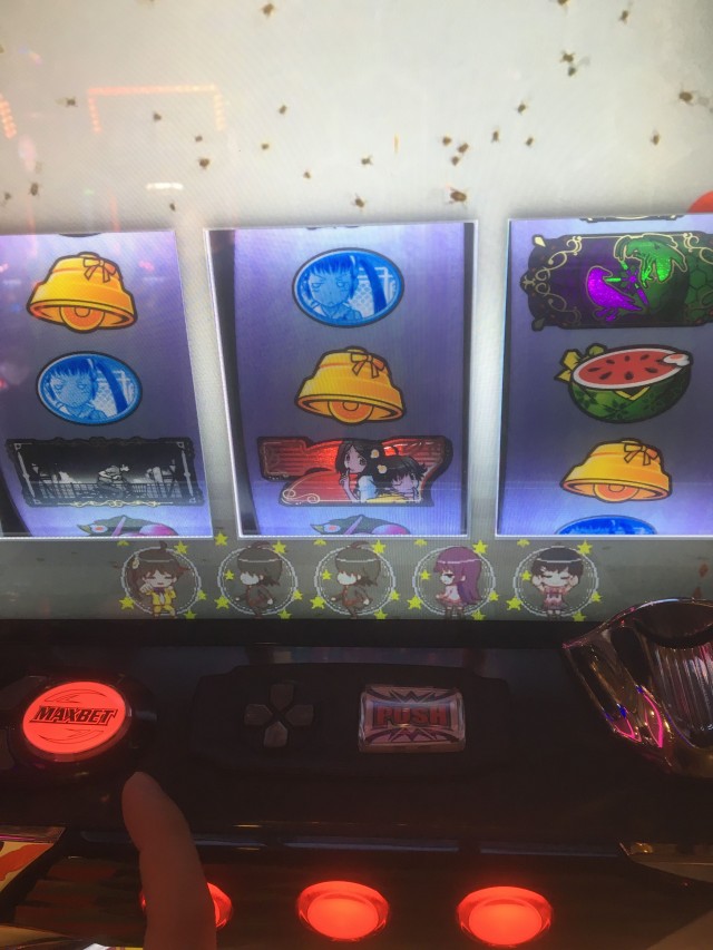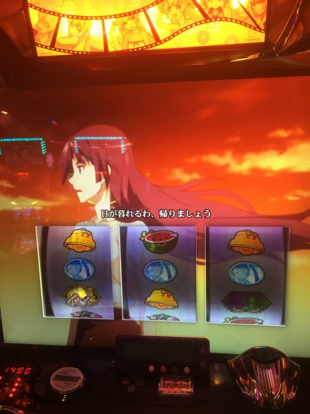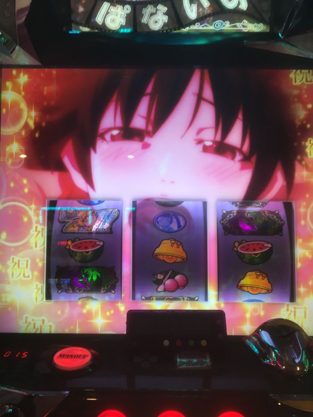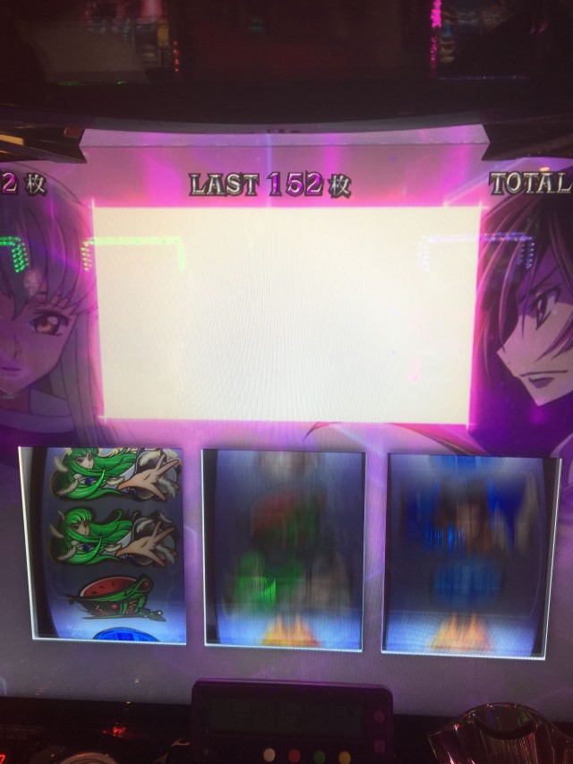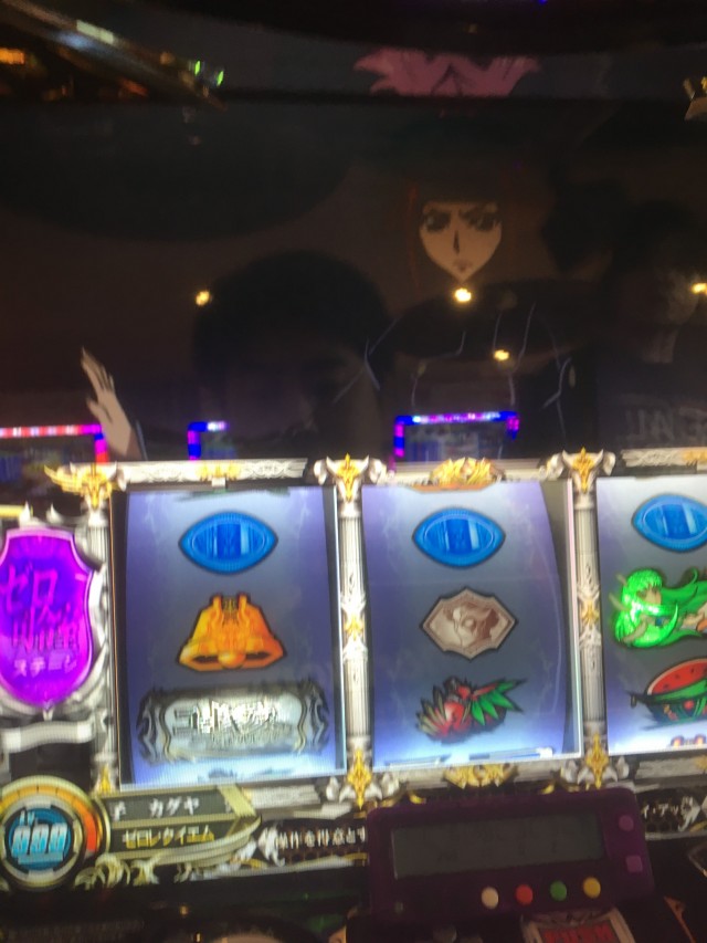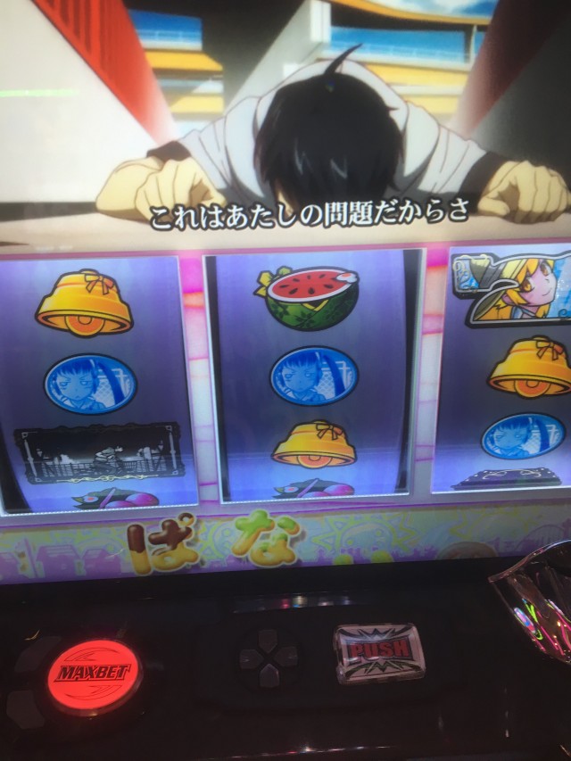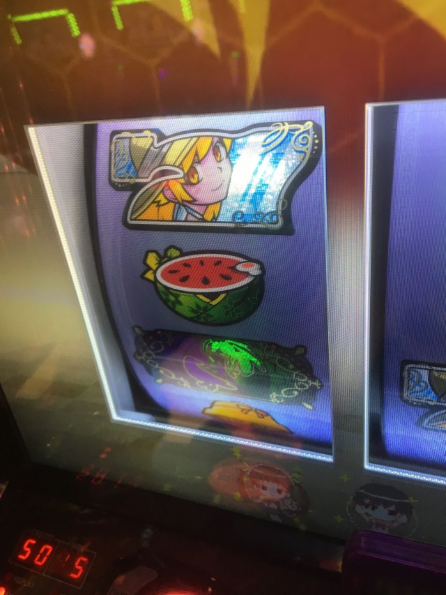 下段に怪異図柄(緑に光っている図柄)を狙う方がやりやすいかもしれません。どうしても白ですとリールが光っている場合だと見落とすことが目押しが得意でない方だと起きてしまうかなーと(実際僕も上手くないのでミスりましたw