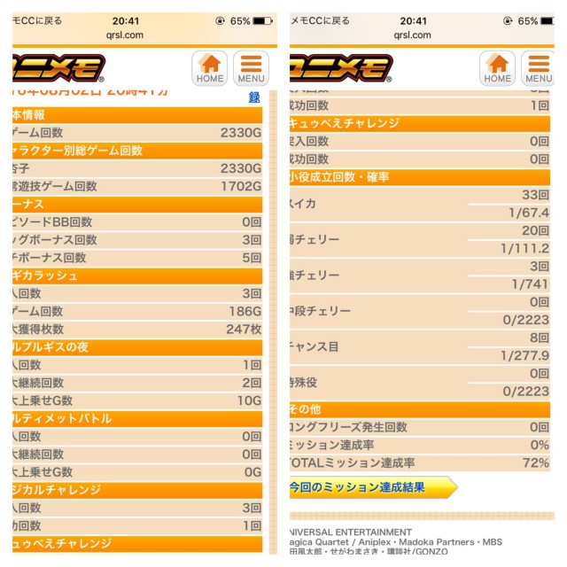 通常ART引いたりほむらスタートしたりしましたが、モード移行がBループから抜けれず気付けば弱チェリーも1/110とかになっており残念な稼動でしたw