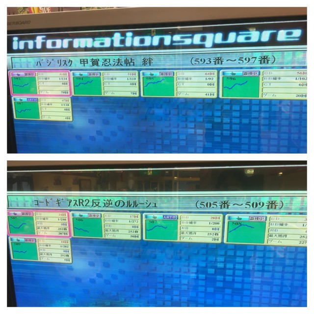 店内ですが当たりの機種がそりゃもーしっかりと見えておりまして、朝から変わってない箇所、変わりながらも出続ける箇所など羨ましい光景が広がっていました