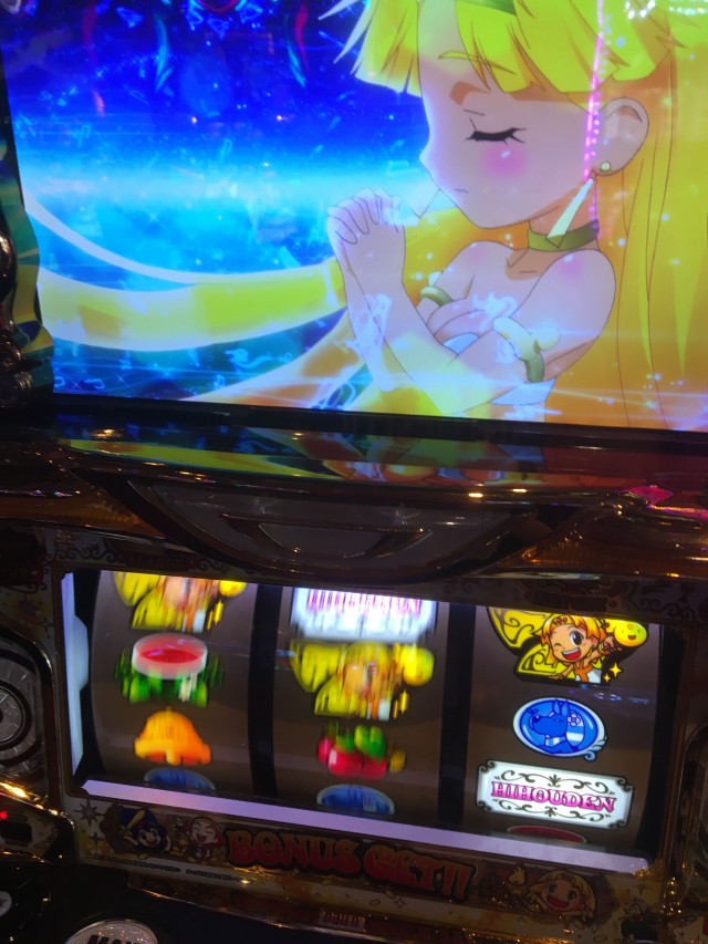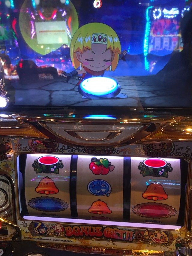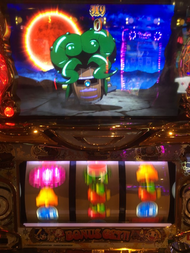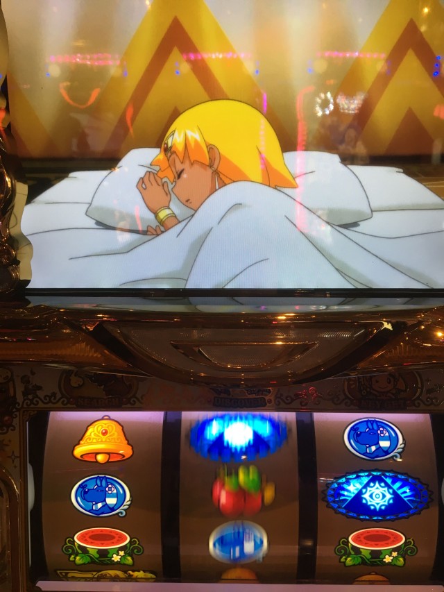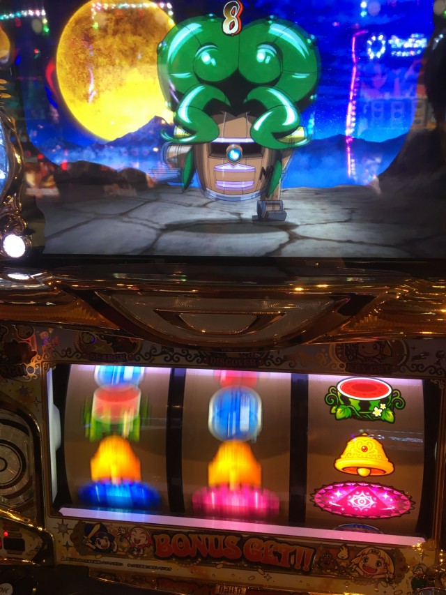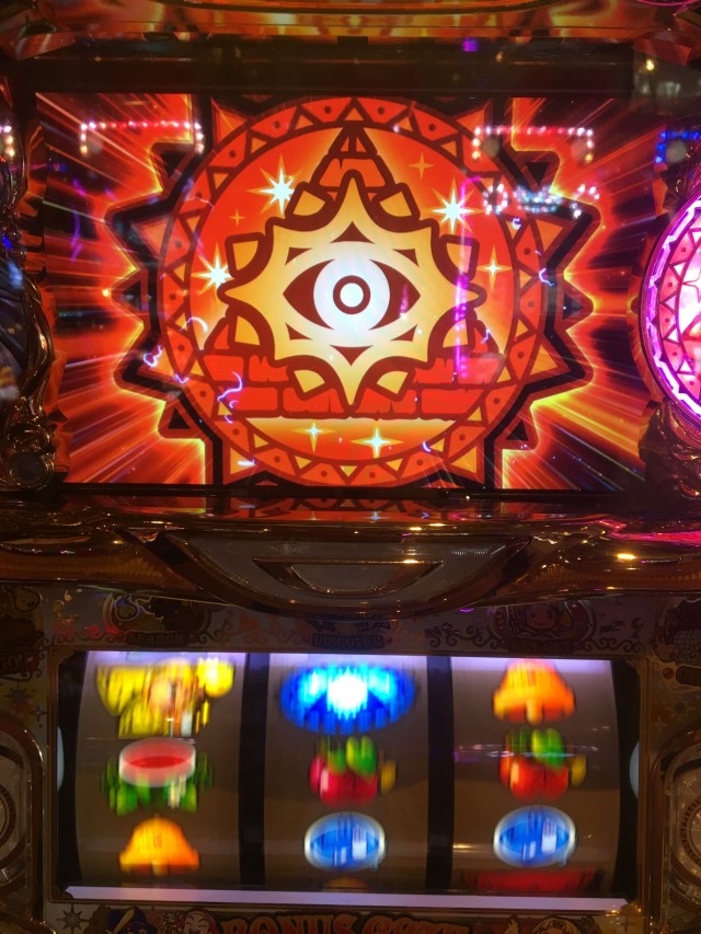 逆押しでピンクピラミッドを中下段に狙い下段に赤7停止、これは基本チャンス目なのでチャンスですな!
